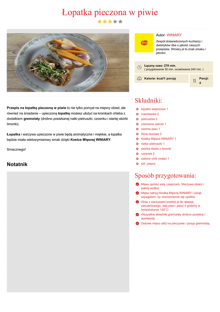 Łopatka pieczona w piwie Autor: WINIARY Zespół doświadczonych kucharzy i dietetyków dba o jakość naszych przepisów. Winiary.pl to znak smaku i jakości. Łączny czas: 270 min. ( przygotowanie 30 min. oczekiwanie 240 min. ) Kalorie: kcal/1 porcję Porcji: 4 Składniki: Przepis na łopatkę pieczoną w piwie to nie tylko pomysł na mięsny obiad, ale łopatka wieprzowa 1 również na śniadanie – upieczoną łopatkę możesz ułożyć na kromkach chleba z marchewka 2 dodatkiem gremolaty (drobno posiekanej natki pietruszki, czosnku i startej skórki pietruszka 2 limonki). czerwona cebula 1 ciemne piwo 1 Łopatka i warzywa upieczone w piwie będą aromatyczne i miękkie, a łopatka liście laurowe 2 będzie miała wielowymiarowy smak dzięki Kostce Mięsnej WINIARY. Kostka Mięsna WINIARY 1 natka pietruszki 1 Smacznego! skórka otarta z limonki czosnek 2 zielone chilli (małe) 1 Notatnik sól i pieprz Sposób przygotowania: Mięso oprósz solą i pieprzem. Warzywa obierz i pokrój wzdłuż. Mięso natrzyj Kostką Mięsną WINIARY i zwiąż szpagatem, by równomiernie się upiekło. Wraz z warzywami przelóż je do rękawa pieczeniowego, wlej piwo i piecz 4 godziny w temperaturze 140°C. Wszystkie składniki gremolaty drobno posiekaj i wymieszaj. Gotowe mięso ułóż na pieczywie i posyp gremolatą.