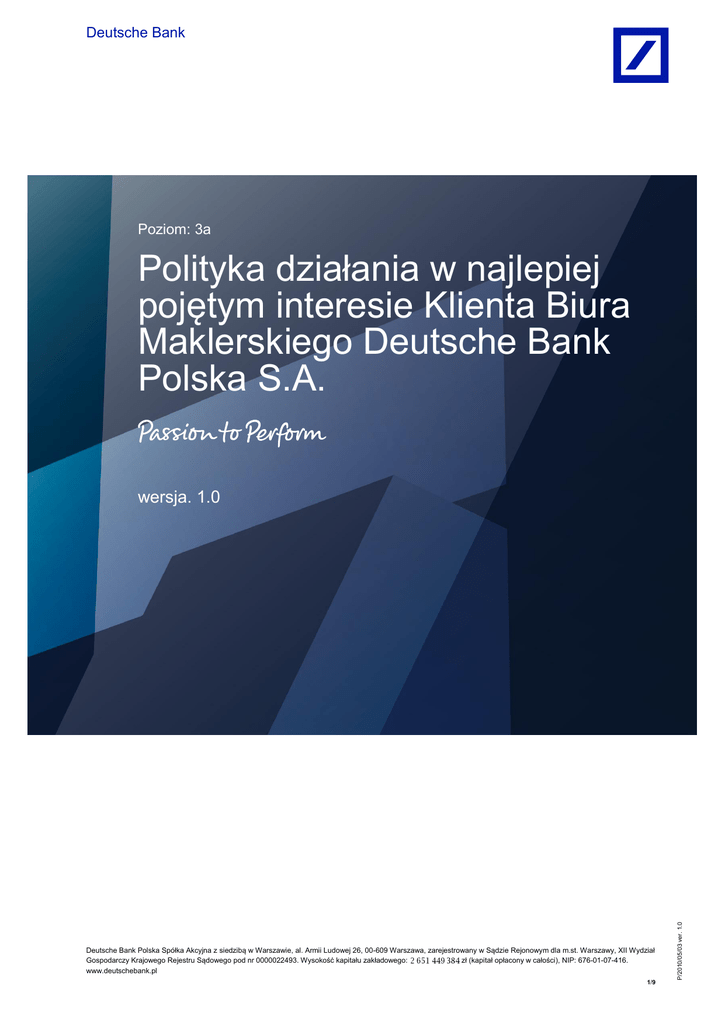 Deutsche Bank Poziom: 3a Polityka działania w najlepiej pojętym interesie Klienta Biura Maklerskiego Deutsche Bank Polska S.A. Deutsche Bank Polska Spółka Akcyjna z siedzibą w Warszawie, al. Armii Ludowej 26, 00-609 Warszawa, zarejestrowany w Sądzie Rejonowym dla m.st. Warszawy, XII Wydział Gospodarczy Krajowego Rejestru Sądowego pod nr 0000022493. Wysokość kapitału zakładowego: zł (kapitał opłacony w całości), NIP: 676-01-07-416. www.deutschebank.pl 1/9 P/2010/05/03 ver. 1.0 wersja. 1.0 Deutsche Bank 1. Postanowienia Ogólne ................................................................................................................................ 3 2. Cel i zakres Polityki ..................................................................................................................................... 5 3. Ogólne zasady działania w najlepiej pojętym interesie klienta ................................................................... 5 4. Szczegółowe zasady działania w najlepiej pojętym interesie Klienta ........................................................ 5 5. Otrzymywanie zgody Klienta na stosowanie polityki .................................................................................. 8 6. Wykazanie działania zgodnie z Polityką ..................................................................................................... 8 7. Tryb przekazywania Klientom informacji o Polityce ................................................................................... 8 8. Postanowienia końcowe ............................................................................................................................. 9 Deutsche Bank Polska Spółka Akcyjna z siedzibą w Warszawie, al. Armii Ludowej 26, 00-609 Warszawa, zarejestrowany w Sądzie Rejonowym dla m.st. Warszawy, XII Wydział Gospodarczy Krajowego Rejestru Sądowego pod nr 0000022493. Wysokość kapitału zakładowego: zł (kapitał opłacony w całości), NIP: 676-01-07-416. www.deutschebank.pl 2/9 P/2010/05/03 ver. 1.0 Spis treści Deutsche Bank POSTANOWIENIA OGÓLNE 1. §1 1. Niniejsza „Polityka działania w najlepiej pojętym interesie Klientów Biura Maklerskiego Deutsche Bank Polska S.A.” zawiera zasady postępowania Biura Maklerskiego Deutsche Bank Polska S.A. w celu działania w najlepiej pojętym interesie Klienta, w związku ze świadczeniem przez Biuro Maklerskie Deutsche Bank Polska S.A. Usług Inwestycyjnych. 2. Niniejsza Polityka nie ma zastosowania w przypadku, gdy Klient określił niezbędne szczegółowe warunki, na jakich dane Zlecenie ma być wykonane lub przekazane, w zakresie wyznaczonym tymi szczególnymi warunkami. Przedmiotowe szczegółowe warunki obejmują: a) koszty związane z wykonaniem Zlecenia, b) cenę Instrumentu Finansowego, c) czas zawarcia transakcji, d) prawdopodobieństwo zawarcia transakcji oraz jej rozliczenia, e) wielkości Zlecenia oraz f) jakiekolwiek inne aspekty, mające wpływ na wykonanie Zlecenia przez podmiot wykonujący Zlecenie. 3. Niniejsza Polityka nie ma zastosowania do Usług Inwestycyjnych świadczonych przez Bank, niezwiązanych z działalnością Biura Maklerskiego; w takim zakresie Bank zapewnia działanie w najlepiej pojętym interesie Klienta w oparciu o postanowienia odrębnej polityki. §2 Ilekroć w Polityce jest mowa o: Banku – należy przez to rozumieć Deutsche Bank Polska S.A. z siedzibą w Warszawie. Biurze Maklerskim – należy przez to rozumieć jednostkę organizacyjną Banku, w ramach której prowadzona jest działalność maklerska, BondSpot – BondSpot S.A. DB Securities S.A – Dom Maklerski DB Securities S.A. GPW – Giełda Papierów Wartościowych w Warszawie, Instrumentach Finansowych – należy przez to rozumieć: 1. Instrumenty, o których mowa w art. 2 Ustawy, będące za pośrednictwem w Biura Maklerskiego, w szczególności: przedmiotem obrotu a) papiery wartościowe, 1) instrumenty rynku pieniężnego, 2) finansowe kontrakty terminowe oraz inne równoważne instrumenty finansowe rozliczane pieniężnie, umowy forward dotyczące stóp procentowych, swapy akcyjne, swapy na stopy procentowe, swapy walutowe, 3) opcje kupna lub sprzedaży Instrumentów Finansowych, opcje na stopy procentowe, opcje walutowe, opcje na takie opcje, oraz inne równoważne Instrumenty Finansowe rozliczane pieniężnie, Deutsche Bank Polska Spółka Akcyjna z siedzibą w Warszawie, al. Armii Ludowej 26, 00-609 Warszawa, zarejestrowany w Sądzie Rejonowym dla m.st. Warszawy, XII Wydział Gospodarczy Krajowego Rejestru Sądowego pod nr 0000022493. Wysokość kapitału zakładowego: zł (kapitał opłacony w całości), NIP: 676-01-07-416. www.deutschebank.pl 3/9 P/2010/05/03 ver. 1.0 b) niebędące papierami wartościowymi: Deutsche Bank Kliencie – należy przez to rozumieć osobę fizyczną, osobę prawną oraz jednostkę organizacyjną nieposiadającą osobowości prawnej, na rzecz której Biuro Maklerskie świadczy Usługi Inwestycyjne, Kliencie detalicznym - należy przez to rozumieć Klienta, który został sklasyfikowane jako klient detaliczny zgodnie z obowiązującą w Banku „Procedurą klasyfikacji klientów”, Kliencie profesjonalnym – należy przez to rozumieć Klienta, który został sklasyfikowane jako klient profesjonalny zgodnie z obowiązującą w Banku „Procedurą klasyfikacji klientów”, NewConnect – należy przez to rozumieć rynek pozagiełdowy prowadzony przez GPW, Polityce – należy przez to rozumieć niniejszą „Politykę działania w najlepiej pojętym interesie klientów Biura Maklerskiego Deutsche Bank Polska S.A.” Rozporządzeniu – rozporządzenie Ministra Finansów z dnia 24 września 2012 r. w sprawie trybu i warunków postępowania firm inwestycyjnych, banków, o których mowa w art. 70. ust. 2 ustawy o obrocie instrumentami finansowymi oraz banków powierniczych, Uprawniony kontrahent - należy przez to rozumieć Klienta, który został sklasyfikowane jako uprawniony k