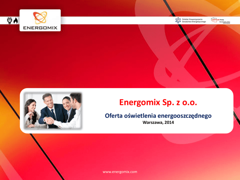 Energomix Sp. z o.o. Oferta oświetlenia energooszczędnego Warszawa, 2014 www.energomix.com Kim jesteśmy? Jesteśmy niezależnymi ekspertami energetycznymi. Działamy profesjonalnie. O nas Zespół • Firma działająca od maja 2010 roku w całym kraju. Jako jedni z pierwszych rozpoczęliśmy funkcjonowanie na zliberalizowanym rynku energii. Jesteśmy największą firmą doradztwa energetycznego w Polsce. Zespół Energomix składa się ze specjalistów z zakresu doradztwa energetycznego. W biurze w Warszawie i w terenie pracuje ponad 230 osób. Prace nadzoruje: • Nie jesteśmy sprzedawcą z koncesją – jesteśmy partnerem / brokerem koncesjonowanych spółek obrotu. Michał Suska pełni funkcję Prezesa Zarządu Energomix oraz jest Prezesem Polskiego Stowarzyszenia Doradztwa Energetycznego. Jest • Obsługujemy portfel 2 000 klientów biznesowych (ok. 10 000 PPE) o łącznym wolumenie ponad 400 GWh. Pracujemy dla dużych klientów i wielu małych. Wśród instytucji publicznych obsługujemy samorządy, agencje rządowe i zakłady komunalne. członkiem ŚWIATOWEJ RADY ENERGETYCZNEJ • Posiadamy kapitał zakładowy 100 000 zł i ubezpieczenie OC wykonywanej działalności (500 000 zł). Stawiamy na bezpieczeństwo. Jesteśmy firmą rzetelną i wypłacalną (weryfikacja przez Krajowy Rejestr Dłużników). absolwentem Warszawa, 2014 ENERGOMIX Sp. z o.o. (World Energy Council). Wcześniej pracował w irlandzkim funduszu private equity zarządzając inwestycjami w CEE, banku inwestycyjnym UniCredit CAIB oraz Ernst & Young. Jest dwóch kierunków w Szkole Głównej Handlowej oraz stypendystą University of Calgary. Studiował także na Wydziale EiTI Politechniki Warszawskiej oraz w PJWSTK. 2 Co możemy zaoferować? W swojej ofercie posiadamy oświetlenie do rozmaitych zastosowań (LED i inne technologie) Oświetlenie uliczne Produkty o najwyższych parametrach świetlnych w których wykorzystano diody LED wiodących marek. Budowa modułowa oprawy pozwala na dowolną konfigurację danej oprawy oraz łatwy proces wymiany. Klasa szczelności IP66 gwarantuje długą żywotność, a aluminiowe radiatory właściwe odprowadzenie ciepła. Możliwość uzyskania różnego poziomu jasności poprzez zwiększenie/zmniejszenie napięcia pozwala na uzyskanie w ciągu doby znaczących oszczędności. Oświetlenie przemysłowe Do zastosowań wewnętrznych i zewnętrznych stają się nieocenioną alternatywą dla standardowych opraw wykorzystywanych w obiektach handlowych, logistycznych, magazynowych, dających oszczędności na poziomie 70% w stosunku do opraw sodowych i metalhalogenowych. Specjalnie zaprojektowany układ odprowadzenia ciepła w postaci radiatora aluminiowego, odpowiedzialny za żywotność produktu, znacząco przewyższa oprawy dostępne na rynku. Naświetlacze Grupa produktów najwyższej jakości zbudowana w oparciu o diody marki Nichia (Japan). Dostępne w szerokim zakresie mocy (40W do 300W) zastępują szeroko stosowane w przemyśle halogeny. Budowa modułowa, wysoka klasa szczelności oraz wysokie parametry świetlne i niezawodny układ zasilający, plasują nasze produkty w grupie produktów spełniających oczekiwania najbardziej wymagających Klientów. Świetlówki liniowe O wymiarach 60, 120, 150 cm są zamiennikami powszechnie stosowanych w przemyśle i obiektach użyteczności publicznej świetlówek fluorescencyjnych stając się zamiennikami odpowiednio świetlówki 18W, 36W, 58W. Żarówki z gwintem klasycznym W naszej ofercie znajdują się żarówki będące odpowiednikiem często stosowanych rozwiązaniach w oświetleniu domowym na bazie gwintu E27. Nasze produkty charakteryzuje bardzo długa żywotność oraz bezawaryjny układ zasilający. Produkty składają się z aluminiowego radiatora, który służy do właściwego odprowadzenia ciepła. Występują w barwie ciepłej i zimnej. Żywotność diod zastosowanych w naszych żarówkach to 30000 godzin a uzyskana oszczędność na poziomie 90%. Warszawa, 2014 ENERGOMIX Sp. z o.o. 3 Oświetlenie energooszczędne Możliwość obniżenia kosztów energii elektrycznej wynikających z oświetlenia nawet o 50 % Inwentaryzacja obecnego stanu oświetlenia Dobór mocy i technologii optymalnej dla klienta Zamówienie i dostarczenie odpowiednich urządzeń Wizualizacja graficzna naświetlenia powierzchni Warszawa, 2014 ENERGOMIX Sp. z o.o. 4 Inwentaryzacja stanu oświetlenia Ankieta ułatwiająca przeprowadzenie inwentaryzacji stanu oświetlenia Warszawa, 2014 ENERGOMIX Sp. z o.o. 5 Oferujemy rozwiązania renomowanych producentów Elastyczna oferta produktowa i cenowa „szyta na miarę” dla każdego Klienta Dzięki hurtowej współpracy z producentami Energomix ma możliwość zaproponowania bardzo atrakcyjnych warunków sprzedaży do klientów końcowych. Warszawa, 2014 ENERGOMIX Sp. z o.o. 6 Jak wygląda nasza oferta? Pełne doradztwo w zmniejszeniu przy zastosowaniu oświetlenia energooszczędnego Finansowanie Sprzedaż i konsulting • Doradztwo w doborze mocy i technologii oświetlenia energooszczędnego – pełne doradztwo energetyczne przy określaniu optymalnych mocy i typów źródeł światła. • Sprzedaż opraw i źródeł światła do wszystkich typów obiektów - zapewniamy atrakcyjne warunki cenowe i pomoc w instalacji. • Profesjonalne symulacje stanu naświetlenia powierzchni – symulacje w programach umożliwiających przedstawienie stanu oświetlenia powierzchni przy zastosowaniu wybranych źródeł światła. Warszawa, 2014 • Analiza okresu zwrotu z inwestycji – symulacja finansowa inwestycji • Możliwość współpracy na podstawie umowy lub zlecenia – państwo wybierają, która forma jest najbardziej odpowiednia. • Elastyczne formy rozliczeń – możliwość współpracy typu ESCO. • Finansowanie w systemie ratalnym – jesteśmy w stanie umożliwić państwu spłatę należności w systemie dogodnych rat. • Leasing – współpracujemy z kilkoma firmami, które umożliwiają le