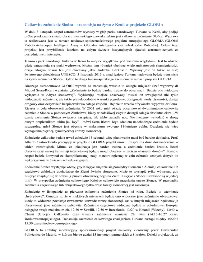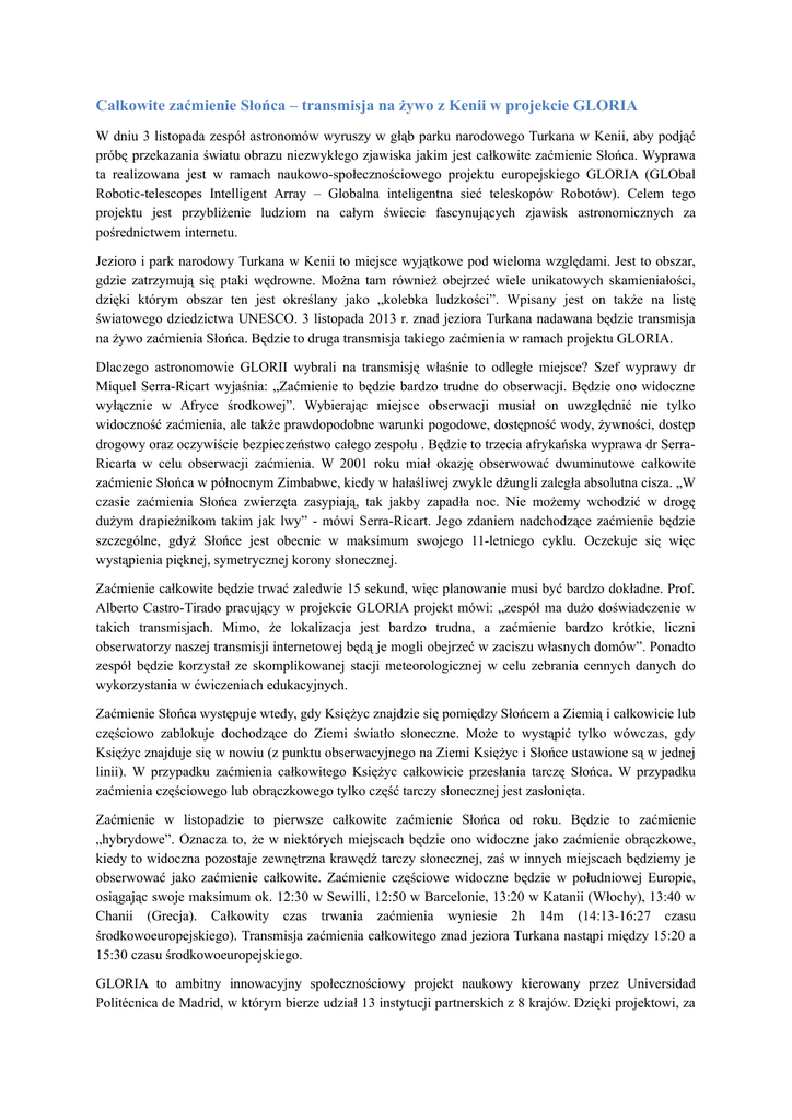 Całkowite zaćmienie Słońca – transmisja na żywo z Kenii w projekcie GLORIA W dniu 3 listopada zespół astronomów wyruszy w głąb parku narodowego Turkana w Kenii, aby podjąć próbę przekazania światu obrazu niezwykłego zjawiska jakim jest całkowite zaćmienie Słońca. Wyprawa ta realizowana jest w ramach naukowo-społecznościowego projektu europejskiego GLORIA (GLObal Robotic-telescopes Intelligent Array – Globalna inteligentna sieć teleskopów Robotów). Celem tego projektu jest przybliżenie ludziom na całym świecie fascynujących zjawisk astronomicznych za pośrednictwem internetu. Jezioro i park narodowy Turkana w Kenii to miejsce wyjątkowe pod wieloma względami. Jest to obszar, gdzie zatrzymują się ptaki wędrowne. Można tam również obejrzeć wiele unikatowych skamieniałości, dzięki którym obszar ten jest określany jako „kolebka ludzkości”. Wpisany jest on także na listę światowego dziedzictwa UNESCO. 3 listopada 2013 r. znad jeziora Turkana nadawana będzie transmisja na żywo zaćmienia Słońca. Będzie to druga transmisja takiego zaćmienia w ramach projektu GLORIA. Dlaczego astronomowie GLORII wybrali na transmisję właśnie to odległe miejsce? Szef wyprawy dr Miquel Serra-Ricart wyjaśnia: „Zaćmienie to będzie bardzo trudne do obserwacji. Będzie ono widoczne wyłącznie w Afryce środkowej”. Wybierając miejsce obserwacji musiał on uwzględnić nie tylko widoczność zaćmienia, ale także prawdopodobne warunki pogodowe, dostępność wody, żywności, dostęp drogowy oraz oczywiście bezpieczeństwo całego zespołu . Będzie to trzecia afrykańska wyprawa dr SerraRicarta w celu obserwacji zaćmienia. W 2001 roku miał okazję obserwować dwuminutowe całkowite zaćmienie Słońca w północnym Zimbabwe, kiedy w hałaśliwej zwykle dżungli zaległa absolutna cisza. „W czasie zaćmienia Słońca zwierzęta zasypiają, tak jakby zapadła noc. Nie możemy wchodzić w drogę dużym drapieżnikom takim jak lwy” - mówi Serra-Ricart. Jego zdaniem nadchodzące zaćmienie będzie szczególne, gdyż Słońce jest obecnie w maksimum swojego 11-letniego cyklu. Oczekuje się więc wystąpienia pięknej, symetrycznej korony słonecznej. Zaćmienie całkowite będzie trwać zaledwie 15 sekund, więc planowanie musi być bardzo dokładne. Prof. Alberto Castro-Tirado pracujący w projekcie GLORIA projekt mówi: „zespół ma dużo doświadczenie w takich transmisjach. Mimo, że lokalizacja jest bardzo trudna, a zaćmienie bardzo krótkie, liczni obserwatorzy naszej transmisji internetowej będą je mogli obejrzeć w zaciszu własnych domów”. Ponadto zespół będzie korzystał ze skomplikowanej stacji meteorologicznej w celu zebrania cennych danych do wykorzystania w ćwiczeniach edukacyjnych. Zaćmienie Słońca występuje wtedy, gdy Księżyc znajdzie się pomiędzy Słońcem a Ziemią i całkowicie lub częściowo zablokuje dochodzące do Ziemi światło słoneczne. Może to wystąpić tylko wówczas, gdy Księżyc znajduje się w nowiu (z punktu obserwacyjnego na Ziemi Księżyc i Słońce ustawione są w jednej linii). W przypadku zaćmienia całkowitego Księżyc całkowicie przesłania tarczę Słońca. W przypadku zaćmienia częściowego lub obrączkowego tylko część tarczy słonecznej jest zasłonięta. Zaćmienie w listopadzie to pierwsze całkowite zaćmienie Słońca od roku. Będzie to zaćmienie „hybrydowe”. Oznacza to, że w niektórych miejscach będzie ono widoczne jako zaćmienie obrączkowe, kiedy to widoczna pozostaje zewnętrzna krawędź tarczy słonecznej, zaś w innych miejscach będziemy je obserwować jako zaćmienie całkowite. Zaćmienie częściowe widoczne będzie w południowej Europie, osiągając swoje maksimum ok. 12:30 w Sewilli, 12:50 w Barcelonie, 13:20 w Katanii (Włochy), 13:40 w Chanii (Grecja). Całkowity czas trwania zaćmienia wyniesie 2h 14m (14:13-16:27 czasu środkowoeuropejskiego). Transmisja zaćmienia całkowitego znad jeziora Turkana nastąpi między 15:20 a 15:30 czasu środkowoeuropejskiego. GLORIA to ambitny innowacyjny społecznościowy projekt naukowy kierowany przez Universidad Politécnica de Madrid, w którym bierze udział 13 instytucji partnerskich z 8 krajów. Dzięki projektowi, za pośrednictwem internetu udostępniona zostanie sieć 17 automatycznych teleskopów, w tym dwa polskie teleskopy Pi of the Sky. Polska reprezentowana jest w projekcie przez Wydział Fizyki Uniwersytetu Warszawskiego, który wspólnie z Narodowym Centrum Badań Jądrowych i Centrum Fizyki Teoretycznej PAN realizuje projekt badawczy Pi of the Sky. Koordynatorem polskiej części projektu GLORIA jest profesor Aleksander Filip Żarnecki z Wydziału Fizyki UW. Więcej informacji o partnerach GLORIA dostępnych jest na stronie: gloria-project.eu/about/partners/ Transmisja zaćmienia Słońca znad jeziora Turkana w Kenii to kolejny już pokaz zjawisk astronomicznych prowadzony na żywo przez projekt GLORIA w celu popularyzowania e-nauki i astronomii. Poprzednio transmitowane były przejście Wenus przez tarczę Słońca (czerwiec 2012), zorze polarne (sierpień 2012 i sierpień 2013) oraz poprzednie całkowite zaćmienie Słońca (listopad 2012). Więcej informacji na temat obecnej i poprzednich transmisji na żywo oraz innych działań podejmowanych w projekcie GLORIA można znaleźć na stronie: gloria-project.eu/pl/. Galerie zdjęć z poprzednich wypraw dostępne są na stronach: http://www.flickr.com/photos/gloriaproject/sets/72157633152723277/ http://www.flickr.com/photos/65131760@N06/sets/72157634767436442/ Ważne jest, aby zawsze patrzeć na Słońce używając okularów ochronnych, przeznaczonych specjalnie do obserwacji słonecznych. Przez cały okres obserwacji zaćmienia Słońca, z wyjątkiem chwil zaćmienia całkowitego, należy zapewnić odpowiednią ochronę oczu.