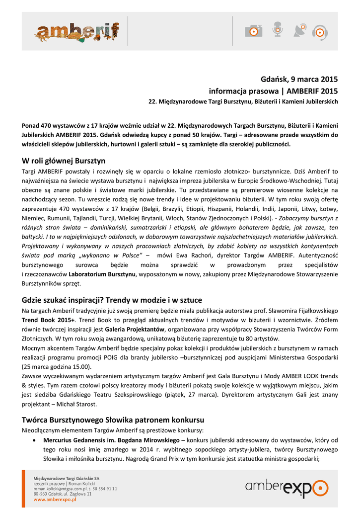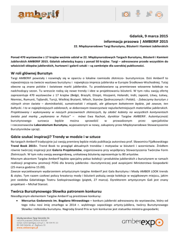 Gdańsk, 9 marca 2015 informacja prasowa | AMBERIF 2015 22. Międzynarodowe Targi Bursztynu, Biżuterii i Kamieni Jubilerskich Ponad 470 wystawców z 17 krajów weźmie udział w 22. Międzynarodowych Targach Bursztynu, Biżuterii i Kamieni Jubilerskich AMBERIF 2015. Gdańsk odwiedzą kupcy z ponad 50 krajów. Targi – adresowane przede wszystkim do właścicieli sklepów jubilerskich, hurtowni i galerii sztuki – są zamknięte dla szerokiej publiczności. W roli głównej Bursztyn Targi AMBERIF powstały i rozwinęły się w oparciu o lokalne rzemiosło złotniczo- bursztynnicze. Dziś Amberif to najważniejsza na świecie wystawa bursztynu i największa impreza jubilerska w Europie Środkowo-Wschodniej. Tutaj obecne są znane polskie i światowe marki jubilerskie. Tu przedstawiane są premierowe wiosenne kolekcje na nadchodzący sezon. Tu wreszcie rodzą się nowe trendy i idee w projektowaniu biżuterii. W tym roku swoją ofertę zaprezentuje 470 wystawców z 17 krajów (Belgii, Brazylii, Etiopii, Hiszpanii, Holandii, Indii, Japonii, Litwy, Łotwy, Niemiec, Rumunii, Tajlandii, Turcji, Wielkiej Brytanii, Włoch, Stanów Zjednoczonych i Polski). - Zobaczymy bursztyn z różnych stron świata – dominikański, sumatrzański i etiopski, ale głównym bohaterem będzie, jak zawsze, ten bałtycki. I to w najpiękniejszych odsłonach, w doborowym towarzystwie najszlachetniejszych materiałów jubilerskich. Projektowany i wykonywany w naszych pracowniach złotniczych, by zdobić kobiety na wszystkich kontynentach świata pod marką „wykonano w Polsce” – mówi Ewa Rachoń, dyrektor Targów AMBERIF. Autentyczność bursztynowego surowca będzie można sprawdzić w prowadzonym przez specjalistów i rzeczoznawców Laboratorium Bursztynu, wyposażonym w nowy, zakupiony przez Międzynarodowe Stowarzyszenie Bursztynników sprzęt. Gdzie szukać inspiracji? Trendy w modzie i w sztuce Na targach Amberif tradycyjnie już swoją premierę będzie miała publikacja autorstwa prof. Sławomira Fijałkowskiego Trend Book 2015+. Trend Book to przegląd aktualnych trendów i motywów w biżuterii i wzornictwie. Źródłem równie twórczej inspiracji jest Galeria Projektantów, organizowana przy współpracy Stowarzyszenia Twórców Form Złotniczych. W tym roku swoją awangardową, unikatową biżuterię zaprezentuje tu 80 artystów. Mocnym akcentem Targów Amberif będzie specjalny pokaz kolekcji i produktów jubilerskich z bursztynem w ramach realizacji programu promocji POIG dla branży jubilersko –bursztynniczej pod auspicjami Ministerstwa Gospodarki (25 marca godzina 15.00). Zawsze wyczekiwanym wydarzeniem artystycznym targów Amberif jest Gala Bursztynu i Mody AMBER LOOK trends & styles. Tym razem czołowi polscy kreatorzy mody i biżuterii pokażą swoje kolekcje w wyjątkowym miejscu, jakim jest siedziba Gdańskiego Teatru Szekspirowskiego (piątek, 27 marca). Dyrektorem artystycznym Gali jest znany projektant – Michał Starost. Twórca Bursztynowego Słowika patronem konkursu Nieodłącznym elementem Targów Amberif są prestiżowe konkursy: • Mercurius Gedanensis im. Bogdana Mirowskiego – konkurs jubilerski adresowany do wystawców, który od tego roku nosi imię zmarłego w 2014 r. wybitnego sopockiego artysty-jubilera, twórcy Bursztynowego Słowika i miłośnika bursztynu. Nagrodą Grand Prix w tym konkursie jest statuetka ministra gospodarki; • Amberif Design Award – konkurs projektowy, otwarty dla wszystkich twórców, tym razem z tematem przewodnim „Mimesis”. Spośród 112 prac z 18 krajów uznanie międzynarodowego jury i Nagrodę Główną Prezydenta Miasta Gdańska zdobyła Marta Rżanek z Łodzi. Wszystkie nagrodzone prace zostaną zaprezentowane na pokonkursowej wystawie w trakcie targów; • Bursztynowe Rzemiosło – konkurs skierowany do złotników i młodych adeptów złotnictwa, organizowany przez Pomorską Izbę Rzemieślniczą Małych i Średnich Przedsiębiorstw i Międzynarodowe Targi Gdańskie. Jak odróżnić perłę od perły? Targom towarzyszyć będą warsztaty, sesje i pokazy o charakterze edukacyjno-popularyzatorskim: • konferencja z okazji 30-lecia Sekcji Paleoentomologicznej Polskiego Towarzystwa Entomologicznego o badaniach archaicznej przyrody zastygłej w bursztynie (org. Muzeum Inkluzji w Bursztynie UG) • seminarium gemmologiczne, podczas którego m. in. Peter Panis z Antwerpii opowie, jak odróżnić perły naturalne od hodowlanych, a słodkowodne od tych z wód słonych, a Dorota Wróblewska z portalu sofisti.pl poinstruuje, jak produkt, jakim jest biżuteria, sprzedać w mediach (org. Stowarzyszenie Rzeczoznawców Jubilerskich) • seminarium o bursztynie, na którym wybitni naukowcy z Wielkiej Brytanii, Włoch, Niemiec i Polski, przedstawią badania archeologiczne, geologiczne i chemiczne bursztynu (org. Muzeum Ziemi PAN, Politechnika Gdańska i Międzynarodowe Stowarzyszenie Bursztynników). Bursztynowy Gdańsk Program wydarzeń towarzyszących będzie jak zawsze bogaty, wszak Targi Amberif odbywają się w Gdańsku – Światowej Stolicy Bursztynu. Dwie interesujące wystawy będzie można obejrzeć w Muzeum Bursztynu. Pierwsza to Amber Biennale – nowy projekt Gdańskiej Akademii Sztuk Pięknych, prezentujący nowoczesne spojrzenie znanych europejskich artystów, którzy przyjęli zaproszenie do wypowiedzi artystycznej poprzez bursztyn. Druga to Amber. Around the World – wystawa biżuterii autorstwa wiodących polskich artystów plastyków i projektantów, łączących bursztyn bałtycki, dominikański i sumatrzański, zorganizowana przez kolekcjonera Janusza Fudalę we współpracy ze Stowarzyszeniem Twórców Form Złotniczych. Działające w nowej siedzibie przy ul. Warzywniczej na gdańskiej starówce Międzynarodowe Stowarzyszenie Bursztynników, zaprasza natomiast na wystawę prac twórców zrzeszonych w Stowarzyszeniu. AMBERIF 2015 25–27 marca, godz. 10–18 | 28 marca, godz. 10–17 | www.amberif.pl AmberExpo | ul.