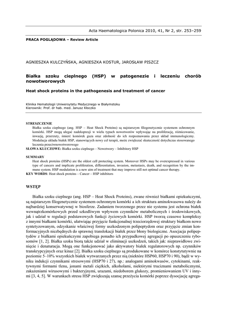 Acta Haematologica Polonica 2010, 41, Nr 2, str. 253–259 PRACA POGLĄDOWA – Review Article AGNIESZKA KULCZYŃSKA, AGNIESZKA KOSTUR, JAROSŁAW PISZCZ Białka szoku cieplnego nowotworowych (HSP) w patogenezie i leczeniu chorób Heat shock proteins in the pathogenesis and treatment of cancer Klinika Hematologii Uniwersytetu Medycznego w Białymstoku Kierownik: Prof. dr hab. med. Janusz Kłoczko STRESZCZENIE Białka szoku cieplnego (ang. HSP – Heat Shock Proteins) są najstarszym filogenetycznie systemem ochronnym komórki. HSP mogą ulegać nadekspresji w wielu typach nowotworów wpływając na proliferację, róŜnicowanie, inwazję, przerzuty, śmierć komórek guza oraz zdolność do ich rozpoznawania przez układ immunologiczny. Modulacja układu białek HSP, stanowiących nowy cel terapii, moŜe zwiększać skuteczność dotychczas stosowanego leczenia przeciwnowotworowego SŁOWA KLUCZOWE: Białka szoku cieplnego – Nowotwory – Inhibitory HSP SUMMARY Heat shock proteins (HSPs) are the oldest cell protecting system. Moreover HSPs may be overexpressed in various type of cancers and implicate proliferation, differentiation, invasion, metastasis, death, and recognition by the immune system. HSP modulation is a new aim of treatment that may improve still not optimal cancer therapy. KEY WORDS: Heat shock proteins – Cancer – HSP inhibitors WSTĘP Białka szoku cieplnego (ang. HSP – Heat Shock Proteins), zwane równieŜ białkami opiekuńczymi, są najstarszym filogenetycznie systemem ochronnym komórki a ich struktura aminokwasowa naleŜy do najbardziej konserwatywnej w biosferze. Zadaniem tworzonego przez nie systemu jest ochrona białek wewnątrzkomórkowych przed szkodliwym wpływem czynników metabolicznych i środowiskowych, jak i udział w regulacji podstawowych funkcji Ŝyciowych komórki. HSP tworzą czasowe kompleksy z innymi białkami komórki, ułatwiając przyjęcie funkcjonalnej trzeciorzędowej struktury białkom nowo syntetyzowanym, odzyskanie właściwej formy uszkodzonym polipeptydom oraz przyjęcie zmian konformacyjnych niezbędnych do sprawnej translokacji białek przez błony biologiczne. Asocjacja polipeptydów z białkami opiekuńczymi zapobiega ponadto ich przypadkowej agregacji po opuszczeniu rybosomów [1, 2]. Białka szoku biorą takŜe udział w eliminacji uszkodzeń, takich jak: nieprawidłowe zwinięcie i denaturacja. Mogą one funkcjonować jako aktywatory białek regulatorowych np. czynników transkrypcyjnych oraz kinaz [2]. Białka szoku cieplnego są produkowane w komórce konstytutywnie na poziomie 5–10% wszystkich białek wytwarzanych przez nią (niektóre HSP60, HSP70 i 90), bądź w wyniku indukcji czynnikami stresowymi (HSP70 i 27), np.: analogami aminokwasów, cytokinami, reaktywnymi formami tlenu, jonami metali cięŜkich, alkoholami, niektórymi truciznami metabolicznymi, zakaŜeniami wirusowymi i bakteryjnymi, urazami, niedoborem glukozy, promieniowaniem UV i innymi [3, 4, 5]. W warunkach stresu HSP zwiększają szansę przeŜycia komórki poprzez dysocjację agrega- A. KLUCZYŃSKA i wsp. 254 tów białek wraŜliwych na stres, proteolizę białek uszkodzonych oraz zapobiegając nieprawidłowym oddziaływaniom pomiędzy białkami a DNA [6,7]. Indukowana ekspresja białek HSP jest wynikiem aktywacji czynnika transkrypcyjnego HSF1 (Heat Shock Factor 1). Multimery czynnika transkrypcyjnego HSF1 łączą się ze specyficzną sekwencją DNA zwaną elementem szoku cieplnego (HSE- Heat Shock Element), występującą w promotorach genów, aktywując transkrypcję. Aktywacja genów HSP w odpowiedzi na działanie stresorów jest reakcją przejściową i odwracalną, regulowaną na poziomie transkrypcji i translacji [8]. W warunkach fizjologicznych białka HSP zlokalizowane są głównie w cytoplazmie oraz w strukturach cytoplazmatycznych takich jak mitochondria i siateczka śródplazmatyczna. Po zadziałaniu czynników patologicznych wędrują do jądra i jąderka lub osadzają się w błonie cytoplazmatycznej między innymi w komórkach nowotworowych [2]. Umiejscowienie w komórce determinuje funkcję danego białka (Tabela 1). HSP mogą działać pro- lub antyapoptotycznie. Antagonistyczne działanie wykazano w przypadku białka HSP60 i jego kafaktora HSP10. Mitochondrialne białko HSP60 po uwolnieniu do cytoplazmy promuje aktywację prokaspazy 3, natomiast cytosolowe HSP60 wykazuje funkcję antyapoptotyczną. Stopień ekspresji białek HSP jest zróŜnicowany zarówno na poziomie komórki jak i całego narządu [9, 10]. Tabela 1. Rola białek HSP w strukturach komórce [6, 11, 12] Table 1. The role of HSP in the cell structures [6, 11, 12] Rodzina białek Eukariotycznych/ odpowiedniki prokariotyczne Rodzaj białka Lokalizacja Główne funkcje HSP100/ Clp HSP110 Hsp104 jadro komórkowe cytoplazma termotolerancja rozpuszczanie agregatów białkowych przekształcanie białka pionowego (PrPc) w formę zakaźną (PrPsc) HSP90/ HtpG Hsp90 GRP94 GRP96 cytoplazma retikulum endoplazm. aparat Goldiego hamowanie agregacji białek regulacja aktywności i transportu kinaz wewnątrzkomórkowych, aktywności receptorów sterydowych, sekrecji białek redukcja cytochromu C Hsp73 Hsp72 GRP78 /BIP retikulum endoplazm. cytoplazma kontrola prawidłowego zwijania białek, zapobieganie denaturacji i agregacji polipeptydów, transport białek przez błony, hamowanie apoptozy immunizacja odpowiedzi immunolog. „molekularne przyzwoitki” pośrednictwo w nabywaniu prawidłowej konformacji regulacja prawidłowego zwijania białek regulacja polimeryzacji aktyny ochrona białek przed agregacja i precypitacją ochrona komórek przed stresem oksydacyjnym hamowanie apoptozy HSP70/ DnaK Hsc70 i Hsp70 HSP60/ GroEL Hsp60, Hsp65 HSP20 Hsp32 Hsp25/Hsp27 Ubikwityna ά-krystalina mitochondrium cytoplazma mitochondrium cytoplazma UDZIAŁ BIAŁEK HSP W TRANSFORMACJI NOWOTWOROWEJ Wykazano, iŜ białka szoku ulegają nadmiernej ekspresji w wielu typach nowotworów ludzkich, gdzie są