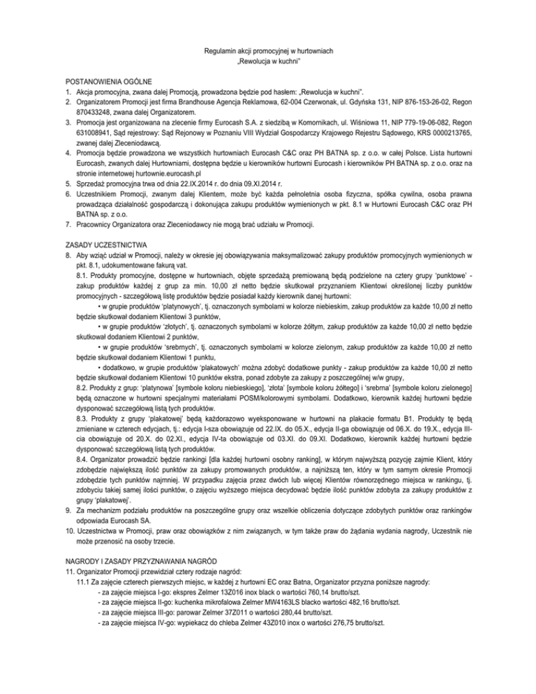Regulamin akcji promocyjnej w hurtowniach „Rewolucja w kuchni” POSTANOWIENIA OGÓLNE 1. Akcja promocyjna, zwana dalej Promocją, prowadzona będzie pod hasłem: „Rewolucja w kuchni”. 2. Organizatorem Promocji jest firma Brandhouse Agencja Reklamowa, 62-004 Czerwonak, ul. Gdyńska 131, NIP 876-153-26-02, Regon 870433248, zwana dalej Organizatorem. 3. Promocja jest organizowana na zlecenie firmy Eurocash S.A. z siedzibą w Komornikach, ul. Wiśniowa 11, NIP 779-19-06-082, Regon 631008941, Sąd rejestrowy: Sąd Rejonowy w Poznaniu VIII Wydział Gospodarczy Krajowego Rejestru Sądowego, KRS 0000213765, zwanej dalej Zleceniodawcą. 4. Promocja będzie prowadzona we wszystkich hurtowniach Eurocash C&C oraz PH BATNA sp. z o.o. w całej Polsce. Lista hurtowni Eurocash, zwanych dalej Hurtowniami, dostępna będzie u kierowników hurtowni Eurocash i kierowników PH BATNA sp. z o.o. oraz na stronie internetowej hurtownie.eurocash.pl 5. Sprzedaż promocyjna trwa od dnia 22.IX.2014 r. do dnia 09.XI.2014 r. 6. Uczestnikiem Promocji, zwanym dalej Klientem, może być każda pełnoletnia osoba fizyczna, spółka cywilna, osoba prawna prowadząca działalność gospodarczą i dokonująca zakupu produktów wymienionych w pkt. 8.1 w Hurtowni Eurocash C&C oraz PH BATNA sp. z o.o. 7. Pracownicy Organizatora oraz Zleceniodawcy nie mogą brać udziału w Promocji. ZASADY UCZESTNICTWA 8. Aby wziąć udział w Promocji, należy w okresie jej obowiązywania maksymalizować zakupy produktów promocyjnych wymienionych w pkt. 8.1, udokumentowane fakurą vat. 8.1. Produkty promocyjne, dostępne w hurtowniach, objęte sprzedażą premiowaną będą podzielone na cztery grupy ‘punktowe’ zakup produktów każdej z grup za min. 10,00 zł netto będzie skutkował przyznaniem Klientowi określonej liczby punktów promocyjnych - szczegółową listę produktów będzie posiadał każdy kierownik danej hurtowni: • w grupie produktów ‘platynowych’, tj. oznaczonych symbolami w kolorze niebieskim, zakup produktów za każde 10,00 zł netto będzie skutkował dodaniem Klientowi 3 punktów, • w grupie produktów ‘złotych’, tj. oznaczonych symbolami w kolorze żółtym, zakup produktów za każde 10,00 zł netto będzie skutkował dodaniem Klientowi 2 punktów, • w grupie produktów ‘srebrnych’, tj. oznaczonych symbolami w kolorze zielonym, zakup produktów za każde 10,00 zł netto będzie skutkował dodaniem Klientowi 1 punktu, • dodatkowo, w grupie produktów ‘plakatowych’ można zdobyć dodatkowe punkty - zakup produktów za każde 10,00 zł netto będzie skutkował dodaniem Klientowi 10 punktów ekstra, ponad zdobyte za zakupy z poszczególnej w/w grupy, 8.2. Produkty z grup: ‘platynowa’ [symbole koloru niebieskiego], ‘złota’ [symbole koloru żółtego] i ‘srebrna’ [symbole koloru zielonego] będą oznaczone w hurtowni specjalnymi materiałami POSM/kolorowymi symbolami. Dodatkowo, kierownik każdej hurtowni będzie dysponować szczegółową listą tych produktów. 8.3. Produkty z grupy ‘plakatowej’ będą każdorazowo wyeksponowane w hurtowni na plakacie formatu B1. Produkty tę będą zmieniane w czterech edycjach, tj.: edycja I-sza obowiązuje od 22.IX. do 05.X., edycja II-ga obowiązuje od 06.X. do 19.X., edycja IIIcia obowiązuje od 20.X. do 02.XI., edycja IV-ta obowiązuje od 03.XI. do 09.XI. Dodatkowo, kierownik każdej hurtowni będzie dysponować szczegółową listą tych produktów. 8.4. Organizator prowadzić będzie rankingi [dla każdej hurtowni osobny ranking], w którym najwyższą pozycję zajmie Klient, który zdobędzie największą ilość punktów za zakupy promowanych produktów, a najniższą ten, który w tym samym okresie Promocji zdobędzie tych punktów najmniej. W przypadku zajęcia przez dwóch lub więcej Klientów równorzędnego miejsca w rankingu, tj. zdobyciu takiej samej ilości punktów, o zajęciu wyższego miejsca decydować będzie ilość punktów zdobyta za zakupy produktów z grupy ‘plakatowej’. 9. Za mechanizm podziału produktów na poszczególne grupy oraz wszelkie obliczenia dotyczące zdobytych punktów oraz rankingów odpowiada Eurocash SA. 10. Uczestnictwa w Promocji, praw oraz obowiązków z nim związanych, w tym także praw do żądania wydania nagrody, Uczestnik nie może przenosić na osoby trzecie. NAGRODY I ZASADY PRZYZNAWANIA NAGRÓD 11. Organizator Promocji przewidział cztery rodzaje nagród: 11.1 Za zajęcie czterech pierwszych miejsc, w każdej z hurtowni EC oraz Batna, Organizator przyzna poniższe nagrody: - za zajęcie miejsca I-go: ekspres Zelmer 13Z016 inox black o wartości 760,14 brutto/szt. - za zajęcie miejsca II-go: kuchenka mikrofalowa Zelmer MW4163LS blacko wartości 482,16 brutto/szt. - za zajęcie miejsca III-go: parowar Zelmer 37Z011 o wartości 280,44 brutto/szt. - za zajęcie miejsca IV-go: wypiekacz do chleba Zelmer 43Z010 inox o wartości 276,75 brutto/szt. Łączna wartość nagród: 287 918,40 pln brutto. OGŁOSZENIE WYNIKÓW 12.Uczestnicy, którzy zdobędą nagrody, zostaną o tym powiadomieni w ciągu 14 dni (od dnia zakończenia Promocji) telefonicznie, przez wiadomość sms lub poprzez informację od kierownika hurtowni. 13. Z Uczestnikami, którzy zdobędą nagrody, Organizator może nawiązać kontakt telefoniczny w celu uzyskania dodatkowych danych osobowych lub danych niezbędnych do wydania nagrody. Podanie danych jest dobrowolne, jednak warunkuje wydanie nagrody. 14. Uczestnicy, którzy zdobędą nagrody, wyrażają zgodę na opublikowanie ich danych (imię, nazwisko oraz miejscowość) w wybranych przez Organizatora mediach. ODBIÓR NAGRÓD 15. Nagrody wydawane będą najpóźniej do dnia 31.XII.2014 r. 16. Nagrody nie podlegają zamianie na gotówkę. Laureatowi nie przysługuje prawo do zastrzeżenia szczególnych właściwości nagrody. 17. Nagrody zostaną przekazane przez firmę spedycyjną, po uzgodnieniu telefonicznym oraz zweryfikowaniu danych osobowych, a także brak