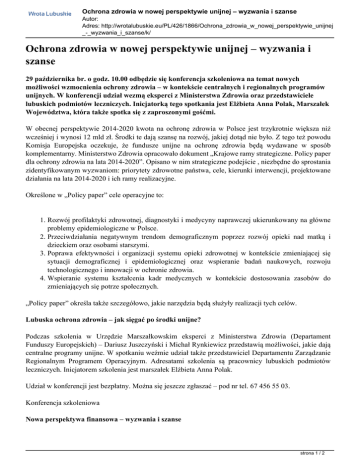 Ochrona zdrowia w nowej perspektywie unijnej – wyzwania i szanse Autor: Adres: http://wrotalubuskie.eu/PL/426/1866/Ochrona_zdrowia_w_nowej_perspektywie_unijnej _-_wyzwania_i_szanse/k/ Ochrona zdrowia w nowej perspektywie unijnej – wyzwania i szanse 29 października br. o godz. 10.00 odbędzie się konferencja szkoleniowa na temat nowych możliwości wzmocnienia ochrony zdrowia – w kontekście centralnych i regionalnych programów unijnych. W konferencji udział wezmą eksperci z Ministerstwa Zdrowia oraz przedstawiciele lubuskich podmiotów leczniczych. Inicjatorką tego spotkania jest Elżbieta Anna Polak, Marszałek Województwa, która także spotka się z zaproszonymi gośćmi. W obecnej perspektywie 2014-2020 kwota na ochronę zdrowia w Polsce jest trzykrotnie większa niż wcześniej i wynosi 12 mld zł. Środki te dają szansę na rozwój, jakiej dotąd nie było. Z tego też powodu Komisja Europejska oczekuje, że fundusze unijne na ochronę zdrowia będą wydawane w sposób komplementarny. Ministerstwo Zdrowia opracowało dokument „Krajowe ramy strategiczne. Policy paper dla ochrony zdrowia na lata 2014-2020”. Opisano w nim strategiczne podejście , niezbędne do sprostania zidentyfikowanym wyzwaniom: priorytety zdrowotne państwa, cele, kierunki interwencji, projektowane działania na lata 2014-2020 i ich ramy realizacyjne. Określone w „Policy paper” cele operacyjne to: 1. Rozwój profilaktyki zdrowotnej, diagnostyki i medycyny naprawczej ukierunkowany na główne problemy epidemiologiczne w Polsce. 2. Przeciwdziałania negatywnym trendom demograficznym poprzez rozwój opieki nad matką i dzieckiem oraz osobami starszymi. 3. Poprawa efektywności i organizacji systemu opieki zdrowotnej w kontekście zmieniającej się sytuacji demograficznej i epidemiologicznej oraz wspieranie badań naukowych, rozwoju technologicznego i innowacji w ochronie zdrowia. 4. Wspieranie systemu kształcenia kadr medycznych w kontekście dostosowania zasobów do zmieniających się potrze społecznych. „Policy paper” określa także szczegółowo, jakie narzędzia będą służyły realizacji tych celów. Lubuska ochrona zdrowia – jak sięgać po środki unijne? Podczas szkolenia w Urzędzie Marszałkowskim eksperci z Ministerstwa Zdrowia (Departament Funduszy Europejskich) – Dariusz Juszczyński i Michał Rynkiewicz przedstawią możliwości, jakie dają centralne programy unijne. W spotkaniu weźmie udział także przedstawiciel Departamentu Zarządzanie Regionalnym Programem Operacyjnym. Adresatami szkolenia są pracownicy lubuskich podmiotów leczniczych. Inicjatorem szkolenia jest marszałek Elżbieta Anna Polak. Udział w konferencji jest bezpłatny. Można się jeszcze zgłaszać – pod nr tel. 67 456 55 03. Konferencja szkoleniowa Nowa perspektywa finansowa – wyzwania i szanse strona 1 / 2 Ochrona zdrowia w nowej perspektywie unijnej – wyzwania i szanse Autor: Adres: http://wrotalubuskie.eu/PL/426/1866/Ochrona_zdrowia_w_nowej_perspektywie_unijnej _-_wyzwania_i_szanse/k/ dla wzmocnienia ochrony zdrowia w latach 2014-2020 29 października 2015 r. (czwartek) Sala Kolumnowa Sejmiku Województwa Lubuskiego uczestnicy szkolenia – przedstawiciele lubuskich jednostek ochrony zdrowia Program: 10.00 Przywitanie go?ci, wprowadzenie w temat szkolenia El?bieta Anna Polak Marsza?ek Województwa Lubuskiego 10.10 Nowa perspektywa finansowa – Dariusz Juszczy?ski wyzwania i szanse dla wzmocnienia ochrony zdrowia w latach 2014-2020 Micha? Rynkiewicz – w kontek?cie centralnych programów Ministerstwo Zdrowia, Departamentu Funduszy Europejskich Program Operacyjny Wiedza Edukacja Rozwój na lata 2014-2020 Program Operacyjny Infrastruktura i ?rodowisko 2014-2020 10.40 Pytania 11.00 Ochrona zdrowia w Regionalnym Programie Operacyjnym – Lubuskie 2020 11.20 Pytania ok.11.40 Zako?czenie Monika Zieli?ska Zast?pca Dyrektora Departamentu Zarz?dzania Regionalnym Programem Operacyjnym Informację przygotowała Mirosława Dulat, Departament Ochrony Zdrowia. strona 2 / 2 Powered by TCPDF (www.tcpdf.org)