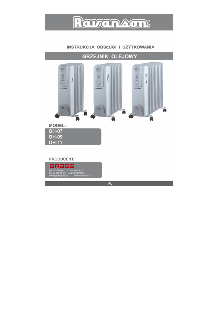 UWAGA! W celu zmniejszenia ryzyka pożaru, porażenia pradem lub obrażeń cielesnych, przed użyciem grzejnika należy przeczytać całą instrukcję oraz zatrzymać ją do wykorzystania w przyszłości. ŚRODKI OSTROŻNOŚCI 1. Przeczytaj uważnie poniższą instrukcję, ponieważ są w niej podane ważne informacje dotyczące bezpieczeństwa, instalacji i obsługi. Ponadto pomoże ci w uniknięciu nieszczęśliwych wypadków wynikających z niewłaściwego użytkowania urządzenia. 2. Wyjmij urządzenie z opakowania i upewnij się, że urządzenie jest nieuszkodzone. Szczególną uwagę zwróć na przewód zasilający. 3. W razie uszkodzenia przewodu zasilającego, z powodów bezpieczeństwa jego wymiany może dokonać wyłącznie producent lub jego przedstawiciel serwisowy albo wykwalifikowana osoba. 4. Przed podłączeniem urządzenia do gniazdka sieciowego upewnij się, że napięcie źródła jest zgodne z napięciem podanym na tabliczce znamionowej urządzenia. Urządzenie może ulec uszkodzeniu, jeżeli napięcia nie są zgodne. 5. Jeżeli wtyka nie pasuje do gniazdka sieciowego, powinna być wymieniona na inną przez wykwalifikowaną osoba. Osoba ta powinna również zapewnić, aby przekrój przewodów dołączonych do wtyczki był odpowiedni dla poboru mocy urządzenia. 6. Powszechnie używane przedłużacze z jednym lub wieloma gniazdami nie są zalecane. Gdyby jednak użycie przedłużacza było konieczne powinien on być dobrany zgodnie z obowiązującymi zasadami bezpieczeństwa. Upewnij się czy dopuszczalna wartości obciążenia prądowego lub maksymalna wartość mocy oznaczona na pojedynczym gnieździe lub/oraz gniazdach przedłużacza nie zostanie przekroczona. 7. Nie używaj urządzenia, jeśli zauważysz jakiekolwiek uszkodzenie na przewodzie lub wtyczce. 8. Gdy stwierdzisz, że urządzenie pracuje w sposób niewłaściwy odłącz je od sieci i zwróć się do autoryzowanego serwisu. Tylko po-sprzedażowy serwis naprawi urządzenie używając właściwych części zamiennych. Postępowanie w sposób niezgodny z tymi instrukcjami może wpłynąć ujemnie na bezpieczeństwo użytkowania twojego urządzenia. 9. To urządzenie jest przeznaczone do stosowania w określonych warunkach i do określonych celów. Jakiekolwiek inne użycie uznaje się jako niewłaściwe a więc niebezpieczne. Producent nie ponosi odpowiedzialności za jakiekolwiek uszkodzenia powstałe w wyniku niewłaściwego, złego lub nieostrożnego użytkowania. To urządzenie jest PRZEZNACZONE WYŁĄCZNIE DO UŻYTKU DOMOWEGO. 10. Aby uchronić się przed ewentualnym porażeniem elektrycznym nie zanurzaj przewodu, wtyczki lub jakiejkolwiek innej części urządzenia w wodzie lub innej cieczy 11. Nie używaj urządzenia w pobliżu wybuchowych lub szybko-palnych materiałów oraz w pobliżu gazów lub palników płomieniowych. 12. Nie pozwalaj dzieciom lub osobom niepełnosprawnym na używanie urządzenia, jeśli nie są właściwie nadzorowane. Nadzór jest konieczny, jeśli jakiekolwiek urządzenie jest używane przez lub w pobliżu dzieci. 13. Nie dotykaj urządzenia mając mokre dłonie lub stopy. 14. Nie używaj urządzenia w pobliżu wanny, prysznica, umywalki lub innego miejsca z wodą, która może stanowić źródło zagrożenia. 15. Nie ciągnij za kabel lub za urządzenie, aby wyłączyć wtyczkę z gniazdka. 16. Nie pozwalaj, aby sznur zwisał z krawędzi stołu lub dotykał gorącej powierzchni. 17. Nie wystawiaj urządzenia na działanie czynników atmosferycznych jak deszcz, wiatr, śnieg, grad. Nie używaj go na zewnątrz. 18. Wyciągnij wtyczkę z gniazdka, jeśli urządzenie nie jest używane oraz w czasie czyszczenia. Pozwól, aby urządzenie ostygło przed czyszczeniem. 19. Jeśli podjąłeś decyzję o zaprzestaniu użytkowania urządzenia, odetnij kabel zasilający po odłączeniu wtyczki z gniazdka. Doprowadź również do nieużyteczności jakichkolwiek niebezpiecznych części, szczególnie dla dzieci które mogą bawić się urządzeniem. 20. Odłącz wtyczkę, kiedy urządzenie nie jest używane, przed nakładaniem lub zdejmowaniem części i przed czyszczeniem. 21. Pozwól, aby inny potencjalny użytkownik przeczytał instrukcję. 22. Zachowaj instrukcję. IDENTYFIKACJA CZĘŚCI A. Plastikowy uchwyt B. Termostat C. Wyłącznik zasilania D. Żebra E. Kabel zasilający i gniazdo przechowywania kabla F. Kółka samonastawne Instrukcja Grzejnik wypełniony olejem został wyprodukowany zgodnie z najwyższymi wymogami i wykorzystaniem najnowszej technologii. Został on wykonany według wysokich standardów, jest bezpieczny i łatwy w użyciu. Przeczytanie instrukcji dla użytkownika zajmie kilka minut, a pozwoli wykorzystać najlepsze cechy tego produktu i przedłużyć okres jego użytkowania. Cechy produktu Duża 7-żebrowa powierzchnia grzewcza zapewnia równomierne promieniowanie. Automatyczny sterownik temperatury do regulacji i utrzymania pożądanej temperatury w pomieszczeniu. Wykorzystano specjalny olej o dużej przewodności cieplnej. Grzejnik wyposażono w kółka samonastawne w celu ułatwienia przemieszczania. UWAGA Grzejnik olejowy jest źródłem ciepła, dopóki jest używany zgodnie z zasadami bezpieczeństwa, które powinny być przestrzegane z najwyższą uwagą. 1. Grzejnik powinien być ustawiony na płaskim podłożu. Miejsce ustawienia należy wybierać rozważnie, szczególnie biorąc pod uwagę to, iż urządzenie jest wyposażone w kółka. 2. Urządzenie musi być umieszczone w odległości 2 metrów od innych przedmiotów, przede wszystkim obiektów łatwopalnych. 3. Urządzenia nie należy zakrywać ubraniami lub innymi tkaninami. 4. Grzejnik olejowy nie może być używany do suszenia ubrań. 5. Umieść urządzenie z daleka od innych gorących powierzchni, od łatwopalnych materiałów (zasłony, tapicerka, itp.), od łatwopalnych gazów, substancji wybuchowych oraz materiałów, które mogą ulec deformacji. 6. Nie używaj grzejnika w łazience w czasi