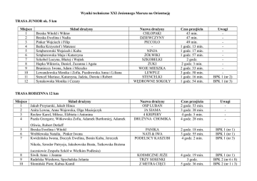 Wyniki techniczne XXI Jesiennego Marszu na Orientację TRASA JUNIOR ok. 5 km Miejsce 1 2 3 4 5 6 7 8 9 10 11 12 Skład drużyny Nazwa drużyny CHŁOPAKI DZIEWCZYNY PICCOLO NINJA ŻÓŁWIKI SZKOBELKI ŻUKI WOJE MIESZKA LEWPUZ STENCELKI WĘDROWNE SOKOŁY Czas przejścia 43 min. 47 min. 49 min. 1 godz. 13 min. 1 godz. 17 min. 1 godz. 57 min. 2 godz. 2 godz. 3 min. 2 godz. 33 min. 3 godz. 50 min. 1 godz. 16 min. 1 godz. 54 min. Skład drużyny Jakub Przytarski, Jakub Hinca Anita Lewna, Anna Wojewska, Olga Maciejczyk Recław Karol, Miłosz, Elżbieta i Antonina Pazda Grzegorz, Witkowska Zofia, Adamek Bartłomiej, Adamek Nazwa drużyny OSP LUBAŃ JA SIAMA 4 KRIPERY DRUŻYNA CHOMIKA Czas przejścia 2 godz. 53 min. 3 godz. 38 min. 4 godz. 5 min. 4 godz. 28 min. Uwagi - Oliwia, Robert Detlaff Breska Ewelina i Witold Wróblewska Natalia, Pinker Iwona Kwidzińska Iwona, Doczyk Ewelina, Bonin Kuba, Jereczek PANIKA NATI & IWA PODELSCY KASZUBI 2 godz. 18 min. 3 godz. 55 min. 4 godz. 2 min. BPK 1 (nr 1) BPK 1 (nr 1) BPK 1 (nr 3) KOSMICZNE JEŻE TRZY SOSENKI Z METRA CIĘCI 4 godz. 19 min. 3 godz. 5 godz. 36 min. BPK 1 (nr 1) BPK 2 (nr 6 i 8) BPK 2 (nr 1 i 3) Breska Witold i Wiktor Breska Ewelina i Nadia Pinker Wojciech i Filip Beśka Krzysztof i Mateusz Sztąborowski Wojciech i Kuba Sztąborowska Maja i Katarzyna Szkobel Lucyna, Błażej i Wojtek Hapka Wiktoria, Daniel, Zuzanna i Agata Brunieccy Iwona, Adam i Mieszko Lewandowska Monika i Zofia, Puzdrowska Anna i Liliana Stencel Mariusz, Katarzyna, Jadzia, Dorota i Robert Synakowska Monika i Cezary Uwagi BPK 1 (nr 2) BPK 1 (nr 3) TRASA RODZINNA 12 km Miejsce 1 2 3 4 5 6 7 Nikola, Szreder Patrycja, Jakubowska Beata, Tutkowska Bożena 8 9 10 (uczniowie Zespołu Szkół w Wielkim Podlesiu) Siwik Anna i Joanna Radelska Wiesława, Spychalska Jolanta Słomiński Piotr, Kubus Kamil 11 12 Reglińska Justyna, Turzyńska Elżbieta, Pellowska Dorota Lubeccy Ryszard, Anna, Alina, Tomasz, Krystian i Agnieszka 13 Przytarska Julia, Ceplin Michał, Kulasiewicz Patryk, Bronk 14 Oliwia Pinker Wojciech i Filip BO JAK NIE MY TO KTO SZWĘDACZE LEŚNE LUDKI PICCOLO 5 godz. 37 min. 3 godz. 53 min. BPK 2 (nr 1 i 3) BPK 3 6 godz. 13 min. (nr 1, 3 i 4) BPK 3 2 godz. 38 min. (nr 1, 3, 10) BPK 7 (nr 1, 3,4,5,6,7,8) TRASA AMBITNA ok. 22 km Miejsce Skład drużyny Nazwa drużyny 1 2 Kinowska Katarzyna, Noga Witold Plicht Tomasz, Skalski Szymon 3 4 5 Block Daniel, Filitarski Piotr Zdzisław Beśka Radelski Zdzisław 6 7 Linowski Dariusz, Liniwska Iwona Miotke Michał, Piłat Małgorzata 8 9 Ciepliński Marcin Tucholscy Krzysztof, Magdalena i Łukasz ROBAL i OWCA ASTRO BOTRANS MTB TEAM BN I TAK ZAPOMNIMY FAMILIA 10 11 Sokołowski Karol, Sokołowski Andrzej, Lewandowski Jan Adamska Katarzyna, Piotr Adamski 12 Ratkowska Magdalena , Ratkowski Tomasz Czas przejścia 265 min. 277 min. Punkty Suma 0 0 0 0 322 min. 259 min. 337 min. 0 0 10 pkt 17 pkt 304 min. 349 min. 279 min. 410 min. GasPol 423 min. ADAMSCY 362 min. FEGREWAGUI 380 min. ZP - 10 pkt (3) LS - 7 pkt ZP - 10 pkt (3) PS – 25 pkt (9) LS – 19 pkt PS- 25 pkt (3) PS – 50 pkt (nr 3 i nr 12) LS – 80 pkt PS – 25 pkt (nr 3) PS – 50 pkt (nr 6 i nr 10) LS – 93 pkt PS – 125 pkt (nr 3, nr 5, nr 6, nr 8 i nr 12) ZP – 20 pkt (nr 11 i nr 14) LS – 32 pkt BPK – 180 pkt (nr 12 i nr 13) PS – 50 pkt (nr 7 i nr 11) LS – 50 pkt 25 pkt 44 pkt 50 pkt 105 pkt. 143 pkt 177 pkt 280 pkt 13 Stencel Mariusz ZP - zmiana potwierdzenia PS – punkt stowarzyszony LS – za każdą rozpoczęta minutę w limicie spóźnień 1 pkt BPK – brak punktu kontrolnego - 358 min. BPK – 270 pkt LS – 28 pkt 298 pkt