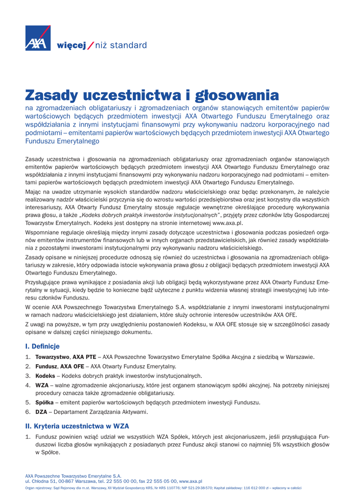 Zasady uczestnictwa i głosowania na zgromadzeniach obligatariuszy i zgromadzeniach organów stanowiących emitentów papierów wartościowych będących przedmiotem inwestycji AXA Otwartego Funduszu Emerytalnego oraz współdziałania z innymi instytucjami finansowymi przy wykonywaniu nadzoru korporacyjnego nad podmiotami – emitentami papierów wartościowych będących przedmiotem inwestycji AXA Otwartego Funduszu Emerytalnego Zasady uczestnictwa i głosowania na zgromadzeniach obligatariuszy oraz zgromadzeniach organów stanowiących emitentów papierów wartościowych będących przedmiotem inwestycji AXA Otwartego Funduszu Emerytalnego oraz współdziałania z innymi instytucjami finansowymi przy wykonywaniu nadzoru korporacyjnego nad podmiotami – emitentami papierów wartościowych będących przedmiotem inwestycji AXA Otwartego Funduszu Emerytalnego. Mając na uwadze utrzymanie wysokich standardów nadzoru właścicielskiego oraz będąc przekonanym, że należycie realizowany nadzór właścicielski przyczynia się do wzrostu wartości przedsiębiorstwa oraz jest korzystny dla wszystkich interesariuszy, AXA Otwarty Fundusz Emerytalny stosuje regulacje wewnętrzne określające procedurę wykonywania prawa głosu, a także „Kodeks dobrych praktyk inwestorów instytucjonalnych”, przyjęty przez członków Izby Gospodarczej Towarzystw Emerytalnych. Kodeks jest dostępny na stronie internetowej www.axa.pl. Wspomniane regulacje określają między innymi zasady dotyczące uczestnictwa i głosowania podczas posiedzeń organów emitentów instrumentów finansowych lub w innych organach przedstawicielskich, jak również zasady współdziałania z pozostałymi inwestorami instytucjonalnymi przy wykonywaniu nadzoru właścicielskiego. Zasady opisane w niniejszej procedurze odnoszą się również do uczestnictwa i głosowania na zgromadzeniach obligatariuszy w zakresie, który odpowiada istocie wykonywania prawa głosu z obligacji będących przedmiotem inwestycji AXA Otwartego Funduszu Emerytalnego. Przysługujące prawa wynikające z posiadania akcji lub obligacji będą wykorzystywane przez AXA Otwarty Fundusz Emerytalny w sytuacji, kiedy będzie to konieczne bądź użyteczne z punktu widzenia własnej strategii inwestycyjnej lub interesu członków Funduszu. W ocenie AXA Powszechnego Towarzystwa Emerytalnego S.A. współdziałanie z innymi inwestorami instytucjonalnymi w ramach nadzoru właścicielskiego jest działaniem, które służy ochronie interesów uczestników AXA OFE. Z uwagi na powyższe, w tym przy uwzględnieniu postanowień Kodeksu, w AXA OFE stosuje się w szczególności zasady opisane w dalszej części niniejszego dokumentu. I. Definicje 1. Towarzystwo, AXA PTE – AXA Powszechne Towarzystwo Emerytalne Spółka Akcyjna z siedzibą w Warszawie. 2. Fundusz, AXA OFE – AXA Otwarty Fundusz Emerytalny. 3. Kodeks – Kodeks dobrych praktyk inwestorów instytucjonalnych. 4. WZA – walne zgromadzenie akcjonariuszy, które jest organem stanowiącym spółki akcyjnej. Na potrzeby niniejszej procedury oznacza także zgromadzenie obligatariuszy. 5. Spółka – emitent papierów wartościowych będących przedmiotem inwestycji Funduszu. 6. DZA – Departament Zarządzania Aktywami. II. Kryteria uczestnictwa w WZA 1.Fundusz powinien wziąć udział we wszystkich WZA Spółek, których jest akcjonariuszem, jeśli przysługująca Funduszowi liczba głosów wynikających z posiadanych przez Fundusz akcji stanowi co najmniej 5% wszystkich głosów w Spółce. AXA Powszechne Towarzystwo Emerytalne S.A. ul. Chłodna 51, 00-867 Warszawa, tel. 22 555 00 00, fax 22 555 05 00, www.axa.pl Organ rejestrowy: Sąd Rejonowy dla m.st. Warszawy, XII Wydział Gospodarczy KRS, Nr KRS 110776; NIP 521-29-38-570; Kapitał zakładowy: 116 612 000 zł – wpłacony w całości 2.W pozostałych przypadkach Fundusz może wziąć udział w WZA, na którym przedmiotem obrad są istotne sprawy Spółki, a zaniechanie wykonywania prawa głosu mogłoby zwiększyć ryzyko istotnego zmniejszenia wartości posiadanych przez Fundusz akcji. III. Uczestnictwo w WZA 1.Do reprezentowania Funduszu na WZA i do wykonywania prawa głosu z akcji będących w posiadaniu Funduszu Towarzystwo ustanawia pełnomocnika. 2.Pełnomocnikiem może być osoba trzecia, z zastrzeżeniem ograniczeń wynikających z bezwzględnie obowiązujących przepisów prawa, w tym w szczególności z przepisów o organizacji i funkcjonowaniu funduszy emerytalnych oraz Kodeksu spółek handlowych. 3.Pełnomocnictwo powinno być udzielane osobie posiadającej właściwe kompetencje, a w szczególności znajomość reguł i zasad odnoszących się do działania na WZA. 4. Pełnomocnictwo powinno być podpisane zgodnie z zasadami reprezentacji Towarzystwa. IV. Głosowanie na WZA 1.Pełnomocnik głosuje na WZA zgodnie z instrukcją głosowania, która powinna być podpisana zgodnie z zasadami reprezentacji Towarzystwa. 2.Instrukcja głosowania powinna jednoznacznie wskazywać sposób głosowania nad każdą uchwałą przewidzianą w porządku obrad WZA. 3.Obowiązek, o którym mowa w pkt 2 powyżej nie obejmuje uchwał porządkowych podejmowanych w trakcie obrad WZA. 4.Instrukcja głosowania może określać sposób głosowania w zakresie uchwał niewymienionych w porządku obrad (w tym porządkowych), o ile mogą one mieć istotne znaczenie dla funkcjonowania emitenta instrumentów finansowych lub dla wartości wyemitowanych przez niego instrumentów finansowych. 5.W przypadku głosowania nad uchwałą nieobjętą instrukcją głosowania, oraz pod warunkiem reprezentowania Funduszu przez pełnomocnika będącego pracownikiem DZA, pełnomocnik może głosować nad uchwałą jedynie po uprzedniej konsultacji z członkiem zarządu odpowiedzialnym za zarządzanie aktywami lub z innym członkiem Komitetu Inwestycyjnego Funduszu. 6.W przypadku gdy treść uchwały przewidzianej w porządku obrad uległa zmianie i zmiana ta nie jest istotna dla tre