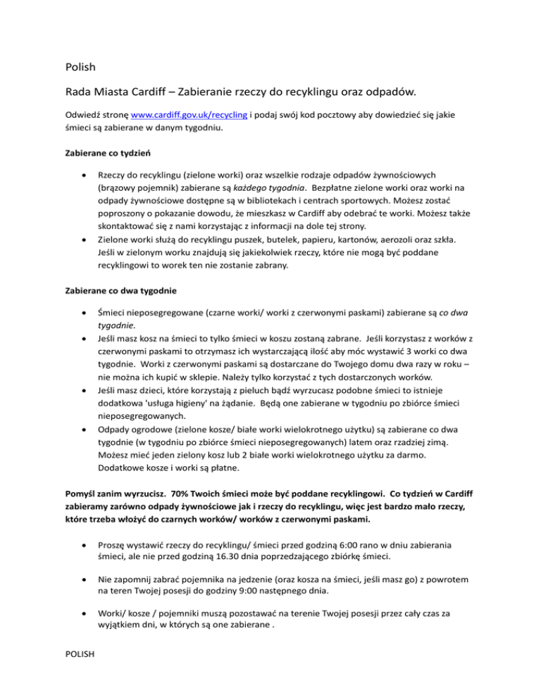 Polish Rada Miasta Cardiff – Zabieranie rzeczy do recyklingu oraz odpadów. Odwiedź stronę www.cardiff.gov.uk/recycling i podaj swój kod pocztowy aby dowiedzieć się jakie śmieci są zabierane w danym tygodniu. Zabierane co tydzień Rzeczy do recyklingu (zielone worki) oraz wszelkie rodzaje odpadów żywnościowych (brązowy pojemnik) zabierane są każdego tygodnia. Bezpłatne zielone worki oraz worki na odpady żywnościowe dostępne są w bibliotekach i centrach sportowych. Możesz zostać poproszony o pokazanie dowodu, że mieszkasz w Cardiff aby odebrać te worki. Możesz także skontaktować się z nami korzystając z informacji na dole tej strony. Zielone worki służą do recyklingu puszek, butelek, papieru, kartonów, aerozoli oraz szkła. Jeśli w zielonym worku znajdują się jakiekolwiek rzeczy, które nie mogą być poddane recyklingowi to worek ten nie zostanie zabrany. Zabierane co dwa tygodnie Śmieci nieposegregowane (czarne worki/ worki z czerwonymi paskami) zabierane są co dwa tygodnie. Jeśli masz kosz na śmieci to tylko śmieci w koszu zostaną zabrane. Jeśli korzystasz z worków z czerwonymi paskami to otrzymasz ich wystarczającą ilość aby móc wystawić 3 worki co dwa tygodnie. Worki z czerwonymi paskami są dostarczane do Twojego domu dwa razy w roku – nie można ich kupić w sklepie. Należy tylko korzystać z tych dostarczonych worków. Jeśli masz dzieci, które korzystają z pieluch bądź wyrzucasz podobne śmieci to istnieje dodatkowa 'usługa higieny' na żądanie. Będą one zabierane w tygodniu po zbiórce śmieci nieposegregowanych. Odpady ogrodowe (zielone kosze/ białe worki wielokrotnego użytku) są zabierane co dwa tygodnie (w tygodniu po zbiórce śmieci nieposegregowanych) latem oraz rzadziej zimą. Możesz mieć jeden zielony kosz lub 2 białe worki wielokrotnego użytku za darmo. Dodatkowe kosze i worki są płatne. Pomyśl zanim wyrzucisz. 70% Twoich śmieci może być poddane recyklingowi. Co tydzień w Cardiff zabieramy zarówno odpady żywnościowe jak i rzeczy do recyklingu, więc jest bardzo mało rzeczy, które trzeba włożyć do czarnych worków/ worków z czerwonymi paskami. Proszę wystawić rzeczy do recyklingu/ śmieci przed godziną 6:00 rano w dniu zabierania śmieci, ale nie przed godziną 16.30 dnia poprzedzającego zbiórkę śmieci. Nie zapomnij zabrać pojemnika na jedzenie (oraz kosza na śmieci, jeśli masz go) z powrotem na teren Twojej posesji do godziny 9:00 następnego dnia. Worki/ kosze / pojemniki muszą pozostawać na terenie Twojej posesji przez cały czas za wyjątkiem dni, w których są one zabierane . POLISH Skontaktuj się z nami: www.cardiff.gov.uk/recycling lub 029 2087 2087 POLISH