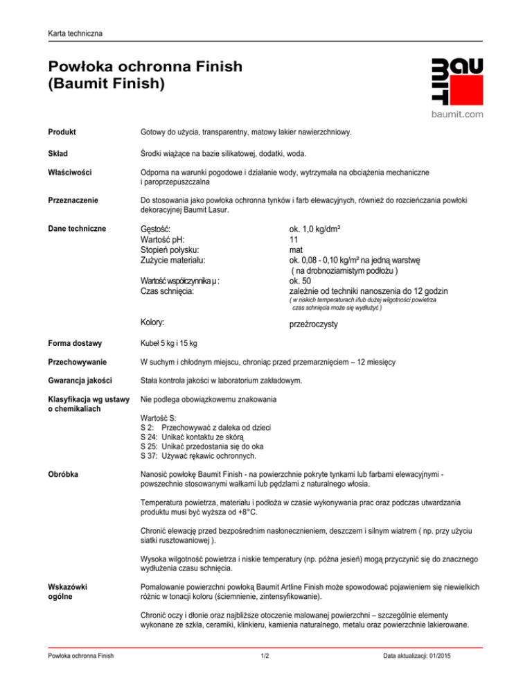 Karta techniczna Powłoka ochronna Finish (Baumit Finish) Produkt Gotowy do użycia, transparentny, matowy lakier nawierzchniowy. Skład Środki wiążące na bazie silikatowej, dodatki, woda. Właściwości Odporna na warunki pogodowe i działanie wody, wytrzymała na obciążenia mechaniczne i paroprzepuszczalna Przeznaczenie Do stosowania jako powłoka ochronna tynków i farb elewacyjnych, również do rozcieńczania powłoki dekoracyjnej Baumit Lasur. Dane techniczne Gęstość: Wartość pH: Stopień połysku: Zużycie materiału: ok. 1,0 kg/dm³ 11 mat ok. 0,08 - 0,10 kg/m² na jedną warstwę ( na drobnoziarnistym podłożu ) ok. 50 zależnie od techniki nanoszenia do 12 godzin Wartość współczynnika µ : Czas schnięcia: ( w niskich temperaturach i/lub dużej wilgotności powietrza czas schnięcia może się wydłużyć ) Kolory: przeźroczysty Forma dostawy Kubeł 5 kg i 15 kg Przechowywanie W suchym i chłodnym miejscu, chroniąc przed przemarznięciem – 12 miesięcy Gwarancja jakości Stała kontrola jakości w laboratorium zakładowym. Klasyfikacja wg ustawy o chemikaliach Nie podlega obowiązkowemu znakowania Wartość S: S 2: Przechowywać z daleka od dzieci S 24: Unikać kontaktu ze skórą S 25: Unikać przedostania się do oka S 37: Używać rękawic ochronnych. Obróbka Nanosić powłokę Baumit Finish - na powierzchnie pokryte tynkami lub farbami elewacyjnymi powszechnie stosowanymi wałkami lub pędzlami z naturalnego włosia. Temperatura powietrza, materiału i podłoża w czasie wykonywania prac oraz podczas utwardzania produktu musi być wyższa od +8°C. Chronić elewację przed bezpośrednim nasłonecznieniem, deszczem i silnym wiatrem ( np. przy użyciu siatki rusztowaniowej ). Wysoka wilgotność powietrza i niskie temperatury (np. późna jesień) mogą przyczynić się do znacznego wydłużenia czasu schnięcia. Wskazówki ogólne Pomalowanie powierzchni powłoką Baumit Artline Finish może spowodować pojawieniem się niewielkich różnic w tonacji koloru (ściemnienie, zintensyfikowanie). Chronić oczy i dłonie oraz najbliższe otoczenie malowanej powierzchni – szczególnie elementy wykonane ze szkła, ceramiki, klinkieru, kamienia naturalnego, metalu oraz powierzchnie lakierowane. Powłoka ochronna Finish 1/2 Data aktualizacji: 01/2015 Karta techniczna Ewentualne zabrudzenia należy natychmiast spłukać dużą ilością wody, nie czekając na wyschnięcie i stwardnienie Po użyciu natychmiast oczyścić narzędzia wodą. Nasze zalecenia w zakresie stosowanych technik, przekazywane słowem i pismem w celu wsparcia nabywcy (użytkownika) opracowane w oparciu o nasze doświadczenia i aktualny stan wiedzy są niewiążące i nie uzasadniają prawnego stosunku umownego oraz żadnych zobowiązań ubocznych z tytułu umowy kupna (sprzedaży). Nie zwalniają one nabywcy od sprawdzenia na własną odpowiedzialność przydatności naszych produktów do przewidzianego zastosowania. Należy przestrzegać ogólnych zasad techniki budowlanej. Zastrzegamy sobie możliwość zmian, które służą technicznemu postępowi i ulepszeniu produktu lub jego zastosowaniu. Wraz z ukazaniem się niniejszej informacji technicznej wcześniejsze jej wersje tracą ważność. Najbardziej aktualne informacje znajdziecie Państwo na naszych stronach internetowych. Poza tym obowiązują nasze "Ogólne warunki umów" znajdujące się w katalogach produktów. Nasza gęsta sieć przedstawicielstw gwarantuje szybkie doradztwo i dostawy. Dodatkowych informacji prosimy zasięgnąć u najbliższego przedstawiciela regionalnego. Powłoka ochronna Finish 2/2 Data aktualizacji: 01/2015