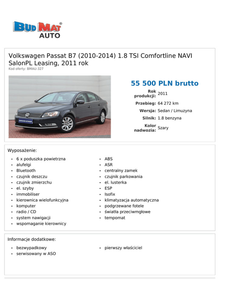Volkswagen Passat B7 (2010-2014) 1.8 TSI Comfortline NAVI SalonPL Leasing, 2011 rok Kod oferty: BMAU-327 55 500 PLN brutto Rok 2011 produkcji: Przebieg: 64 272 km Wersja: Sedan / Limuzyna Silnik: 1.8 benzyna Kolor Szary nadwozia: Wyposażenie: - 6 x poduszka powietrzna alufelgi Bluetooth czujnik deszczu czujnik zmierzchu el. szyby immobiliser kierownica wielofunkcyjna komputer radio / CD system nawigacji wspomaganie kierownicy - ABS ASR centralny zamek czujnik parkowania el. lusterka ESP Isofix klimatyzacja automatyczna podgrzewane fotele światła przeciwmgłowe tempomat Informacje dodatkowe: - bezwypadkowy - serwisowany w ASO - pierwszy właściciel BUDMAT AUTO Sp. z o.o. ul. Bielska 55 09-400 Płock Tel.: +48 501197036 Fax: