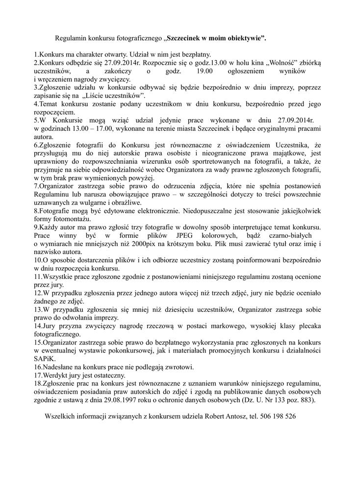 Regulamin konkursu fotograficznego „Szczecinek w moim obiektywie”. 1.Konkurs ma charakter otwarty. Udział w nim jest bezpłatny. 2.Konkurs odbędzie się 27.09.2014r. Rozpocznie się o godz.13.00 w holu kina „Wolność” zbiórką uczestników, a zakończy o godz. 19.00 ogłoszeniem wyników i wręczeniem nagrody zwycięzcy. 3.Zgłoszenie udziału w konkursie odbywać się będzie bezpośrednio w dniu imprezy, poprzez zapisanie się na „Liście uczestników”. 4.Temat konkursu zostanie podany uczestnikom w dniu konkursu, bezpośrednio przed jego rozpoczęciem. 5.W Konkursie mogą wziąć udział jedynie prace wykonane w dniu 27.09.2014r. w godzinach 13.00 – 17.00, wykonane na terenie miasta Szczecinek i będące oryginalnymi pracami autora. 6.Zgłoszenie fotografii do Konkursu jest równoznaczne z oświadczeniem Uczestnika, że przysługują mu do niej autorskie prawa osobiste i nieograniczone prawa majątkowe, jest uprawniony do rozpowszechniania wizerunku osób sportretowanych na fotografii, a także, że przyjmuje na siebie odpowiedzialność wobec Organizatora za wady prawne zgłoszonych fotografii, w tym brak praw wymienionych powyżej. 7.Organizator zastrzega sobie prawo do odrzucenia zdjęcia, które nie spełnia postanowień Regulaminu lub narusza obowiązujące prawo – w szczególności dotyczy to treści powszechnie uznawanych za wulgarne i obraźliwe. 8.Fotografie mogą być edytowane elektronicznie. Niedopuszczalne jest stosowanie jakiejkolwiek formy fotomontażu. 9.Każdy autor ma prawo zgłosić trzy fotografie w dowolny sposób interpretujące temat konkursu. Prace winny być w formie plików JPEG kolorowych, bądź czarno-białych o wymiarach nie mniejszych niż 2000pix na krótszym boku. Plik musi zawierać tytuł oraz imię i nazwisko autora. 10.O sposobie dostarczenia plików i ich odbiorze uczestnicy zostaną poinformowani bezpośrednio w dniu rozpoczęcia konkursu. 11.Wszystkie prace zgłoszone zgodnie z postanowieniami niniejszego regulaminu zostaną ocenione przez jury. 12.W przypadku zgłoszenia przez jednego autora więcej niż trzech zdjęć, jury nie będzie oceniało żadnego ze zdjęć. 13.W przypadku zgłoszenia się mniej niż dziesięciu uczestników, Organizator zastrzega sobie prawo do odwołania imprezy. 14.Jury przyzna zwycięzcy nagrodę rzeczową w postaci markowego, wysokiej klasy plecaka fotograficznego. 15.Organizator zastrzega sobie prawo do bezpłatnego wykorzystania prac zgłoszonych na konkurs w ewentualnej wystawie pokonkursowej, jak i materiałach promocyjnych konkursu i działalności SAPiK. 16.Nadesłane na konkurs prace nie podlegają zwrotowi. 17.Werdykt jury jest ostateczny. 18.Zgłoszenie prac na konkurs jest równoznaczne z uznaniem warunków niniejszego regulaminu, oświadczeniem posiadania praw autorskich do zdjęć i zgodą na publikowanie danych osobowych zgodnie z ustawą z dnia 29.08.1997 roku o ochronie danych osobowych (Dz. U. Nr 133 poz. 883). Wszelkich informacji związanych z konkursem udziela Robert Antosz, tel. 506 198 526
