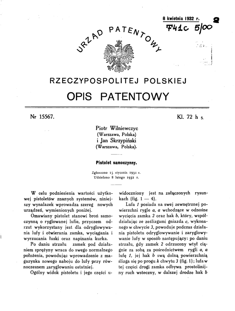 8 kwietnia 1932 r. & O PAT^^ WIC 5J0O H- J- <> RZECZYPOSPOLITEJ POLSKIEJ OPIS PATENTOWY Nr 15567. KI. 72 h 5. Piotr Wilniewczyc (Warszawa, Polska) i Jan Skrzypiński (Warszawa, Polska). Pistolet samoczynny. Zgłoszono 15 stycznia 1931 r. Udzielono 8 lutego 1932 r. W celu podniesienia wartości użytko¬ wej pistoletów znanych systemów, niniej¬ szy wynalazek wprowadza szereg nowych widoczniony jest na załączonych rysun¬ kach (fig. 1 — 4). rzut wykorzystany jest dla odryglowywania lufy i otwierania zamka, wyciągania i wyrzucania łuski oraz napinania kurka. Po daniu strzału zamek pod działa¬ niem sprężyny wraca do swego normalnego położenia, powodując wprowadzenie z ma¬ gazynka nowego naboju do lufy przy równoczesnem zaryglowaniu ostatniej. Lufa 1 posiada na swej zewnętrznej po¬ wierzchni rygle a, a wchodzące w odnośne wycięcia zamka 2 oraz hak 6, który, współ¬ działając ze ześlizgami gniazda c, wykona¬ nego w chwycie 3, powoduje podczas działa¬ nia pistoletu odryglowywanie i zaryglowywanie lufy w sposób następujący: po daniu strzału, gdy zamek 2 odrzucony wtył ciଠgnie za sobą za pośrednictwem rygli a, a lufę 1, jej hak b swą dolną powierzchnią ślizga się po progu k chwytu 3 (fig. 1); lufaw tej części drogi zamka odbywa prostolinij¬ Ogólny widok pistoletu i jego części u- ny ruch wsteczny, w dalszej drodze hak 6 urządzeń, wymienionych poniżej. Omawiany pistolet stanowi broń samo¬ czynną o ryglowanej lufie, przyczem od¬ swą klinową częścią natrafia na ześlizgi sprężynę mechanizmu spustowego 20, za¬ gniazda c, wskutek czego tył lufy 1 dzięki trzask magazynka 21, okładki rękojeści 22 podcięciu na <dotne^ powierzchni haka b ma możność opaść ku dołowi, przyczem rygle a, a zostają wyłączone, a lula opierając się hakiem b o zderzak L chwytu 3 zostaje unieruchomiona, zamek zaś odbywa dalszy ruch wsteczny aż do zderzenia się jego krawędzi m z progiem n chwytu 3. Po ukończonym odrzucie zamek 2 pod działaniem sprężyny 23 wraca ku przodo¬ wi, ustawiając swym czółkiem o lufę / w i t. d. Sprężyna główna 23 jest osadzona na trzonie 24 i opiera się swoim końcem o główkę 25 trzonu przytrzymywaną zapo¬ mocą przetyczki 26. Pierścień 27 osadzony jest luźno na trzonie 24 i służy do przeno¬ szenia ciśnienia sprężyny 23 na zamek 2. W ten sposób części składowe 23, 24, 25, 26 i 27 stanowią jeden zespół przy rozbie¬ raniu i składaniu pistoletu. Zatrzask zam¬ kowy 10 prócz ryglowania zamka w tylnem położeniu po wystrzeleniu ostatniego na¬ normalnem położeniu. Jak widać z rysunków i sposobu działa¬ nia, powierzchnie haka b lufy 1 oraz ześli¬ zgów gniazda c chwytu 3 składają się z pła¬ boju, jak to było wskazane wyżej, szczyzn. Zamek 2 zawiera prócz ogólnie znanych części jak: iglica 4, sprężyna igliczna 5, za¬ suwka igliczna 6, muszka 7, celownik 8, również specjalnego kształtu pierścień 9 (fig. 4), który, służąc za łożysko lufy 1, unieruchomia zamek przy jego tylnem po¬ łożeniu przez oparcie się krawędzi d pier¬ ścienia 9 o przedni rygiel a lufy 1. Z lewej strony zamek 2 posiada wykro¬ kiem 11, poczem pociągnąć trzon 24 ku przodowi i wyjąć zatrzask zamka 10; po zwolnieniu zamka 2 z zęba bezpiecznika 11 zamek 2 bez przeszkód zsuwa się z chwy¬ je e, f, g. Wykrój e służy do samoczynnego ryglowania zamka w tylnem położeniu po wystrzeleniu ostatniego naboju (zmiana magazynka) zapomocą występu h zatrza¬ tu 3. Składanie pistoletu odbywa się w kolej¬ ności odwrotnej, a więc po wprowadzeniu sku zamkowego 10. Wykrój / służy do u- zamka 2 z umieszczoną w nim lufą / i sprę¬ żyną główną 23 na chwyt 3, należy unieru¬ chomić zamek zapomocą bezpiecznika dźwigniowego 11 i, naciągając trzon 24 ku przodowi, założyć zatrzask zamkowy; po zwolnieniu z bezpiecznika 11 zamek 2 pod działaniem sprężyny samoczynnie wraca ku przodowi. Całkowite rozebranie pistoletu na czę¬ ści składowe odbywa się po wyjęciu bez¬ piecznika dźwigniowego 11, którego ramiączko p przytrzymuje ośki 29 i 30. nieruchomienia zamka przy rozbieraniu pi¬ stoletu przez zaczepienie go zębem i bez¬ piecznika dźwigniowego 11. Wykrój g słu¬ ży do zatrzymania zamka lekko cofniętego ku tyłowi zapomocą bezpiecznika 11 w po¬ łożeniu, przy którem przy spuszczeniu kurka następuje uderzenie tego ostatniego nie w iglicę, lecz w krawędź / zasuwki igli¬ cy 6 (bezpieczne spuszczenie kurka). Chwyt 3 zawiera normalne części skła¬ dowe pistoletów samoczynnych, a więc: ku¬ rek 12, spust 13, zaczep kurkowy 14, prze¬ rywacz 15, bezpiecznik samoczynny 16, bez¬ piecznik dźwigniowy 11, wkładkę chwytu Ź7, sprężynę kurka 18, drążek kurka 19, — służy również do związania w jedną całość pisto¬ letu rozkładanego przy czyszczeniu na lu¬ fę 1, zamek 2, chwyt 3, sprężynę główną 23, (wraz z częściami 24, 25, 26 i 2t). Rozbieranie pistoletu odbywa się w spo¬ sób następujący: po wyjęciu magazynka 28 (fig. 1 —3) należy zamek 2 cofnąć wtył, unieruchomić go dźwigniowym bezpieczni¬ Zastrzeżenia patentowe. 1. Pistolet 2 — samoczynny, znamienny tern, że ódryglowytoanie, zatrzymywanie i 5. Pistolet samoczynny według zastrz. zaryglowywanie lufy odbywa się zapomocą bezpośredniego współdziałania haka, znaj¬ dującego się na jej zewnętrznej powierzch¬ ni, i ześlizgów gniazda, wykonanego w chwycie pistoletu. 2. Pistolet samoczynny według zastrz. 1, znamienny tern, że przednia część lufy jest osadzona w łożysku wykonanem w kształcie pierścienia i wkręconem w przed¬ nią część zamka, który unieruchomią za¬ 1, znamienny tern, że powierzchnie haka lufy i ześlizgów gniazda chwytu, powodu¬ jące odryglowywanie i zaryglowywanie lu¬ fy, posiadają kształt płaszczyzn. 3. Pistolet samoczynny według zastrz. 1 ze sprężyną główną osadzoną na trzonie, znamienny tern, że gł