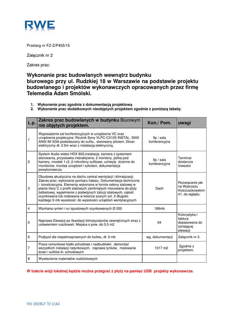 Przetarg nr FZ-Z/P455/15 Załącznik nr 2 Zakres prac: Wykonanie prac budowlanych wewnątrz budynku biurowego przy ul. Rudzkiej 18 w Warszawie na podstawie projektu budowlanego i projektów wykonawczych opracowanych przez firmę Telemedia Adam Smólski. 1. Wykonanie prac zgodnie z dokumentacją projektową 2. Wykonanie prac dodatkowych nieobjętych projektem zgodnie z poniższą tabelą: L.p. Zakres prac budowlanych w budynku Biurowym nie objętych projektem. Kon./ Pom. 1 Wyposażenie sal konferencyjnych w urządzenia VC oraz urządzenia projekcyjne: Rzutnik Sony VLPC-CX125 INSTAL. 3000 ANSI IM XGA podwieszany do sufitu, sterowany pilotem, Ekran elektryczny dł. 2.5m wraz z instalacją elektryczną. IIp / sala konferencyjna 2 System Audio wideo HDX 800,instalacje, kamera z systemem sterowania, przystawka interaktywna, 2 monitory, pólka pod kamery, mostek 1+3, 2 mikrofony sufitowe, uchwyty ścienne do monitorów, montaż urządzeń i szkoleni, dokumentacja powykonawcza. IIp / sala konferencyjna 3 Obudowa akustyczna na dachu central wentylacji i klimatyzacji. Zakres prac: wykonanie pomiaru hałasu. Dokumentacja techniczna i konstrukcyjna. Elementy wykonane w formie osłony stalowej w planie litery C z profili stalowych zamkniętych mocowane do płyty żelbetowej, wypełnienie z podwójnych żaluzji stalowych, całość ocynkowana lub malowana w kolorze szarym szt. 2 długość każdego 9 mb wysokość: do wysokości urządzeń wentylacyjnych 4 Wymiana rynien i rur spustowych ocynkowanych Ø 200 5 Naprawa Elewacji po likwidacji klimatyzatorów zewnętrznych wraz z ustawieniem rusztowań. Miejsca o pow. do 0,5 m2 6 Podjazd dla niepełnosprawnych do bufetu, dł. 9 mb 7 Prace remontowe klatki schodowe i nadbudówki: demontaż wszystkich instalacji natynkowych, naprawa tynków, malowanie ścian i sufitów kl. schodowych 8 Wywiezienie materiałów rozbiórkowych Dach uwagi Terminal dostarcza Inwestor Rozwiązanie jak na Wybrzeżu Kościuszkowskim 41, do wglądu. 189mb 64 Kolorystyka i faktura dopasowana do istniejącej elewacji wg, dokumentacji Załącznik nr 3. 1017 m2 Zgodnie z projektem. W trakcie wizji lokalnej będzie można przegrać z płyty na pamięć USB projekty wykonawcze.