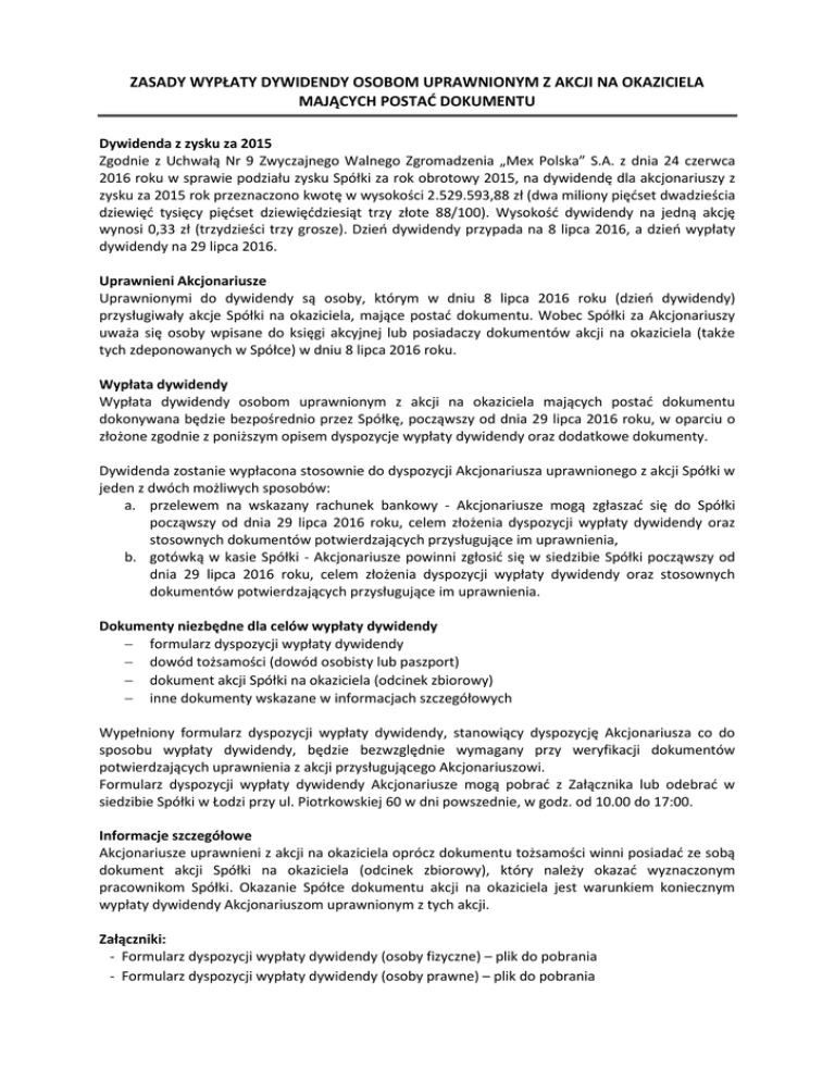 ZASADY WYPŁATY DYWIDENDY OSOBOM UPRAWNIONYM Z AKCJI NA OKAZICIELA MAJĄCYCH POSTAĆ DOKUMENTU Dywidenda z zysku za 2015 Zgodnie z Uchwałą Nr 9 Zwyczajnego Walnego Zgromadzenia „Mex Polska” S.A. z dnia 24 czerwca 2016 roku w sprawie podziału zysku Spółki za rok obrotowy 2015, na dywidendę dla akcjonariuszy z zysku za 2015 rok przeznaczono kwotę w wysokości 2.529.593,88 zł (dwa miliony pięćset dwadzieścia dziewięć tysięcy pięćset dziewięćdziesiąt trzy złote 88/100). Wysokość dywidendy na jedną akcję wynosi 0,33 zł (trzydzieści trzy grosze). Dzień dywidendy przypada na 8 lipca 2016, a dzień wypłaty dywidendy na 29 lipca 2016. Uprawnieni Akcjonariusze Uprawnionymi do dywidendy są osoby, którym w dniu 8 lipca 2016 roku (dzień dywidendy) przysługiwały akcje Spółki na okaziciela, mające postać dokumentu. Wobec Spółki za Akcjonariuszy uważa się osoby wpisane do księgi akcyjnej lub posiadaczy dokumentów akcji na okaziciela (także tych zdeponowanych w Spółce) w dniu 8 lipca 2016 roku. Wypłata dywidendy Wypłata dywidendy osobom uprawnionym z akcji na okaziciela mających postać dokumentu dokonywana będzie bezpośrednio przez Spółkę, począwszy od dnia 29 lipca 2016 roku, w oparciu o złożone zgodnie z poniższym opisem dyspozycje wypłaty dywidendy oraz dodatkowe dokumenty. Dywidenda zostanie wypłacona stosownie do dyspozycji Akcjonariusza uprawnionego z akcji Spółki w jeden z dwóch możliwych sposobów: a. przelewem na wskazany rachunek bankowy - Akcjonariusze mogą zgłaszać się do Spółki począwszy od dnia 29 lipca 2016 roku, celem złożenia dyspozycji wypłaty dywidendy oraz stosownych dokumentów potwierdzających przysługujące im uprawnienia, b. gotówką w kasie Spółki - Akcjonariusze powinni zgłosić się w siedzibie Spółki począwszy od dnia 29 lipca 2016 roku, celem złożenia dyspozycji wypłaty dywidendy oraz stosownych dokumentów potwierdzających przysługujące im uprawnienia. Dokumenty niezbędne dla celów wypłaty dywidendy formularz dyspozycji wypłaty dywidendy dowód tożsamości (dowód osobisty lub paszport) dokument akcji Spółki na okaziciela (odcinek zbiorowy) inne dokumenty wskazane w informacjach szczegółowych Wypełniony formularz dyspozycji wypłaty dywidendy, stanowiący dyspozycję Akcjonariusza co do sposobu wypłaty dywidendy, będzie bezwzględnie wymagany przy weryfikacji dokumentów potwierdzających uprawnienia z akcji przysługującego Akcjonariuszowi. Formularz dyspozycji wypłaty dywidendy Akcjonariusze mogą pobrać z Załącznika lub odebrać w siedzibie Spółki w Łodzi przy ul. Piotrkowskiej 60 w dni powszednie, w godz. od 10.00 do 17:00. Informacje szczegółowe Akcjonariusze uprawnieni z akcji na okaziciela oprócz dokumentu tożsamości winni posiadać ze sobą dokument akcji Spółki na okaziciela (odcinek zbiorowy), który należy okazać wyznaczonym pracownikom Spółki. Okazanie Spółce dokumentu akcji na okaziciela jest warunkiem koniecznym wypłaty dywidendy Akcjonariuszom uprawnionym z tych akcji. Załączniki: - Formularz dyspozycji wypłaty dywidendy (osoby fizyczne) – plik do pobrania - Formularz dyspozycji wypłaty dywidendy (osoby prawne) – plik do pobrania