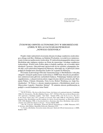 STUDIA HISTORYCZNE349 R. LIV, 2011, Z. 3–4 (215–216) PL ISSN 0025-1429 Anna Franaszek ŻYDOWSKI OBWÓD AUTONOMICZNY W BIROBIDŻANIE (ZSRR) W RELACJACH KRAKOWSKIEGO „NOWEGO DZIENNIKA” Projekt władz radzieckich stworzenia obszaru trwałego osadnictwa żydowskiego u zbiegu rzek Biry i Bidżanu, na Dalekim Wschodzie, wywołał żywe zainteresowanie światowej społeczności żydowskiej. W radzieckiej propagandzie ukazywano Birobidżan jako najlepsze miejsce na Ziemi do masowego i trwałego osadnictwa żydowskiego. Wśród wielu Żydów plany te budziły nadzieję, ale wyzwalały także nieufność i protesty. Zdecydowanie sprzeciwiali się im syjoniści, propagujący hasło aliji, czyli żydowskiej imigracji do Palestyny, obawiając się, że głównym celem podjętych działań było zniechęcenie Żydów do wyjazdu do Palestyny. Powstanie Żydowskiego Obwodu Autonomicznego w Birobidżanie i rola jaką odegrał w dziejach społeczności żydowskiej w ZSRR były dotychczas przedmiotem zainteresowania głównie zachodnich badaczy. Podejmując badania nad tym zagadnieniem, z całą pewnością należy sięgać do prac takich uczonych, jak: Benjamin Pinkus, Chimen Abramsky, Nora Levin, Robert Weinberg czy Antje Kuchenbecker1. W Polsce w okresie międzywojennym o Birobidżanie pisali m.in. Mieczysław Lepecki i Stanisław Skimar2. W ostatnim okresie problematykę tę podjął w swoich badaniach Artur Patek3. 1 Por. B. P i n k u s , The Jews of the Soviet Union: the history of a national minority, Cambridge 1988; Ch. A b r a m s k y, The Biro-Bidzhan Project, 1927–1959 [w:] The Jews in Soviet Russia since 1917, pod red. L. Kochana, London – New York – Toronto 1970, s. 62‒75; N. L e v i n , The Jews in the Soviet Union since 1917: paradox of survival, New York 1988; R. We i n b e r g , Stalin’s forgotten Zion: Birobidzhan and the making of a Soviet Jewish homeland: an Illustrated history, 1928–1996, Berkeley 1998; A. K u c h e n b e c k e r, Zionismus ohne Zion. Birobidzan: Idee und Geschichte eines jüdischen Staates in Sowjet – Fernost, Berlin 2000. 2 Por. M. L e p e c k i , Birobidżan. Żydowski Obwód Autonomiczny w ZSRR, Warszawa 1937; S. S k i m a r, Biro-Bidżan. Republika Żydowska, Warszawa 1935. 3 A. P a t e k , Birobidżan. Sowiecka ziemia obiecana? Żydowski Obwód Autonomiczny w ZSRR, Kraków 1997. 350 Zanim powstał Birobidżan „Nowy Dziennik” – wydawany w Krakowie w latach 1918–1939 – był żydowskim pismem codziennym ukazującym się w Polsce przez całe dwudziestolecie międzywojenne, a jednocześnie był pierwszym w Europie dziennikiem wydawanym przez Żydów w języku kraju zamieszkania4. Propagował idee syjonistyczne. Jednocześnie przedstawiał sytuację Żydów polskich i niezwykle złożone stosunki pomiędzy wszystkimi narodowościami zamieszkującymi II Rzeczpospolitą, a zwłaszcza relacje polsko-żydowskie. W kolejnych numerach czasopisma poświęcano wiele uwagi położeniu Żydów w innych krajach, w tym w Rosji, a później w Związku Radzieckim. W momencie przejęcia władzy przez bolszewików społeczność żydowska w Rosji liczyła ok. 2,5 miliona. Do kierowania polityką wobec mniejszości żydowskiej powołano w 1918 r. Komisariat Żydowski (Żydowska sekcja Komisariatu ds. Narodowości – Jewkom) oraz żydowską sekcję Rosyjskiej Komunistycznej Partii (bolszewików) [RKP](b) – Jewsekcję5. Podstawą ich funkcjonowania była definicja narodu Józefa Stalina z 1913 r.: „Naród jest to wytworzona historycznie trwała wspólnota ludzi, powstała na gruncie wspólnoty języka, terytorium, życia ekonomicznego i układu psychicznego, przejawiającego się we wspólnocie kultury”6. W takim ujęciu dwu- i półmilionowa społeczność żydowska sowieckiej Rosji nie stanowiła narodu, gdyż nie posiadała własnego terytorium. W 1921 roku na X Zjeździe RKP(b) przyjęto zasadnicze tezy nowej polityki narodowościowej. W rezultacie na początku lat dwudziestych XX w. władze sowieckie rozpoczęły realizację tak zwanej polityki „autochtonizacji” i „korenizacji”. „Autochtonizacja” miała prowadzić do przyznania poszczególnym narodowościom prawa do używania narodowego języka i rozwijania ich kultury w swoim języku. Realizując politykę „korenizacji”, dążono do wiązania partii komunistycznej z miejscowymi grupami etnicznymi, przy ograniczonym respektowaniu ich odrębności narodowych. Ale prawdziwym celem tych działań było objęcie przez partię bolszewicką pełnej kontroli nad wszystkimi aspektami życia społecznego nierosyjskich narodów. Od początku istnienia Związku Radzieckiego władze rozważały kwestię przyznania Żydom pewnego zakresu autonomii7. Ale nadrzędnym zadaniem było stworzenie jednorodnego społeczeństwa radzieckiego. Dlatego podjęto działania zmierzające do wytworzenia wśród Żydów zupełnie nowej, proletariackiej kultury, która wchłonęłaby kulturę żydowską. Aby to osiągnąć podjęto działania polegające na zwalczaniu języka hebrajskiego, jako języka religii, oraz hebrajskiej Przez cały okres międzywojenny, w Polsce ukazywały się również takie żydowskie czasopisma jak „Chwila” (1919–1939), „Hajnt” (1908–1939), „Der Moment” (1910–1939). 5 A. P a t e k , Birobidżan, s. 16–17. 6 J. S t a l i n , Marksizm a kwestia narodowa [w:] t e g o ż , Dzieła, t. 2, Warszawa 1949, s. 303. 7 A. P a t e k , Birobidżan, s. 19. 4 351 części kultury, jako klerykalnej i nie pasującej do nowej rzeczywistości. Konsekwentnie likwidowano szkoły hebrajskie, prasę oraz wszelkie przejawy twórczości w tym języku. Natomiast popierano jidysz, uznając go za język narodowy Żydów. Zyskał on nawet status języka urzędowego w miasteczkach i wioskach o większości żydowskiej na Ukrainie i Białorusi8. W związku z likwidacją partii politycznych, organizacji i stowarzyszeń niezależnych od władzy bolszewickiej, wszystkie żydowskie instytucje sp