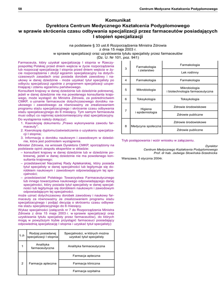 58 Centrum Medyczne Kształcenia Podyplomowego Komunikat Dyrektora Centrum Medycznego Kształcenia Podyplomowego w sprawie skrócenia czasu odbywania specjalizacji przez farmaceutów posiadających I stopień specjalizacji na podstawie § 33 ust.6 Rozporządzenia Ministra Zdrowia z dnia 15 maja 2003 r. w sprawie specjalizacji oraz uzyskiwania tytułu specjalisty przez farmaceutów (Dz. U. Nr 101, poz. 941) Farmaceuta, który uzyskał specjalizację I stopnia w Rzeczy pospolitej Polskiej przed dniem wejścia w życie rozporządzenia lub rozpoczął specjalizację I stopnia przed dniem wejścia w ży cie rozporządzenia i złożył egzamin specjalizacyjny na dotych czasowych zasadach oraz posiada dorobek zawodowy i na ukowy w danej dziedzinie - może uzyskać tytuł specjalisty po odbyciu specjalizacji zgodnie z programem specjalizacji uzupe łniającej i zdaniu egzaminu państwowego. Konsultant krajowy w danej dziedzinie lub dziedzinie pokrewnej, jeżeli w danej dziedzinie nie ma powołanego konsultanta krajo wego, może wystąpić do Ministra Zdrowia, za pośrednictwem CMKP, o uznanie farmaceucie dotychczasowego dorobku na ukowego i zawodowego za równoważny ze zrealizowaniem programu stażu specjalizacyjnego i skrócenie czasu odbywania stażu specjalizacyjnego do 6 miesięcy. Tym samym farmaceuta musi odbyć co najmniej sześciomiesięczny staż specjalizacyjny. Do wystąpienia należy dołączyć: 1. Kserokopię dokumentu „Prawo wykonywania zawodu far maceuty"; 2. Kserokopię dyplomu/zaświadczenia o uzyskaniu specjaliza cji I stopnia; 3. Informację o dorobku naukowym i zawodowym w dziedzi nie, która jest podmiotem wystąpienia. Minister Zdrowia, na wniosek Dyrektora CMKP, sporządzony na podstawie opinii zespołu ekspertów w składzie: – konsultant krajowy w danej dziedzinie lub w dziedzinie po krewnej, jeżeli w danej dziedzinie nie ma powołanego kon sultanta krajowego; – przedstawiciel Naczelnej Rady Aptekarskiej, który posiada tytuł specjalisty w danej specjalności lub legitymuje się do robkiem naukowym i zawodowym odpowiadającym tej spe cjalności; – przedstawiciel Polskiego Towarzystwa Farmaceutycznego lub innego towarzystwa naukowego odpowiadającego danej specjalności, który posiada tytuł specjalisty w danej specjal ności lub legitymuje się dorobkiem naukowym i zawodowym odpowiadającym tej specjalności. może uznać dotychczasowy dorobek zawodowy i naukowy far maceuty za równoważny ze zrealizowaniem programu stażu specjalizacyjnego i podjąć decyzję o skróceniu czasu odbywa nia stażu specjalizacyjnego do 6 miesięcy. Wykaz specjalności (załącznik nr 7 do Rozporządzenia Ministra Zdrowia z dnia 15 maja 2003 r. w sprawie specjalizacji oraz uzyskiwania tytułu specjalisty przez farmaceutów), do których mogą w powyższym trybie przystąpić farmaceuci posiadający odpowiednią specjalizację I stopnia i uzyskać tytuł specjalisty): L.p. Rodzaj posiadanej specjalizacji I stopnia Specjalności, w których można uzyskać tytuł specjalisty 1 Analityka farmaceutyczna Analityka farmaceutyczna Farmacja apteczna 2 Farmacja apteczna Farmacja kliniczna Farmacja szpitalna 3 Farmakologia i zielarstwo Farmakologia Lek roślinny 4 Farmakologia Farmakologia 5 Mikrobiologia Mikrobiologia i biotechnologia farmaceutyczna 6 Toksykologia Toksykologia 7 Higiena i epidemiologia Zdrowie środowiskowe Zdrowie publiczne Zdrowie środowiskowe 8 Medycyna społeczna Zdrowie publiczne Tryb postępowania i wzór wniosku w załączeniu. Dyrektor Centrum Medycznego Kształcenia Podyplomowego Prof. dr hab. Jadwiga Słowińska-Srzednicka Warszawa, 5 stycznia 2004r. Tryb postępowania w sprawie w sprawie skrócenia czasu odbywania stażu specjalizacyjnego przez farmaceutów posiadających I stopień specjalizacji na podstawie § 33 Rozporządzenia Ministra Zdrowia z dnia 15 maja 2003r. w sprawie specjalizacji oraz uzyskiwania tytułu specjalisty przez farmaceutów (Dz. U. Nr 101, poz. 941) 1. Farmaceuta ubiegający się o skrócenie stażu specjalizacyjnego występuje z podaniem do konsultanta krajowego o rozważenie możliwości wystąpienia do Ministra Zdrowia z wnioskiem o skrócenie czasu odbywania stażu specjalizacyjnego. 2. Konsultant Krajowy występuje do Ministra Zdrowia, za pośrednictwem CMKP, korespondencja przesyłana jest na adres CMKP. 3. Jeżeli do wniosku nie dołączono następujących dokumentów: 1) kserokopii dokumentu „Prawo wykonywania zawodu farmaceuty"; 2) kserokopii dyplomu/zaświadczenia o uzyskaniu specjalizacji I stopnia; 3) informacji o dorobku naukowym i zawodowym w dziedzinie, która jest podmiotem wystąpienia, w tym o realizacji w ramach dotychczasowego doświadczenia zawodowego wybranych elementów programu stażu specjalizacyjnego CMKP występuje do wnioskodawców o ich uzupełnienie. 4. Dyrektor CMKP powołuje zespół ekspertów, ustala termin i miejsce posiedzenia i przekazuje przewodniczącemu zespołu doku menty wraz z drukiem protokołu. 5. Zespół w protokole wpisuje ocenę merytoryczną wniosku dotyczącą możliwości uznania farmaceucie dorobku zawodowego i naukowego za równoważny ze zrealizowaniem stażu specjalizacyjnego w danej dziedzinie i skróceniu czasu odbywania stażu specjalizacji , tak aby farmaceuta musiał zrealizować co najmniej 6 miesięczny program specjalizacji. 6. Na podstawie oceny zespołu ekspertów, Dyrektor CMKP kieruje wniosek do Ministra Zdrowia. 7. Posiedzenia zespołu ekspertów odbywają się cztery razy w roku; po 1 stycznia, 1 kwietnia, 1 lipca, 1 września. Załącznik do komunikatu Dyrektora Centrum Medycznego Kształcenia Podyplomowego w sprawie skrócenia czasu odbywania specjalizacji przez farmaceutów posiadających I stopień specjalizacji WZÓR Minister Zdrowia za pośrednictwem Dyrektora Centrum Medycznego Kształcenia Podyplomowego Wniosek o uznanie przez Ministra Zdrowia farmaceucie posiadającemu I stopień specjalizacji dorobku zawodowego i naukowego za rów noważny ze zrealizowan