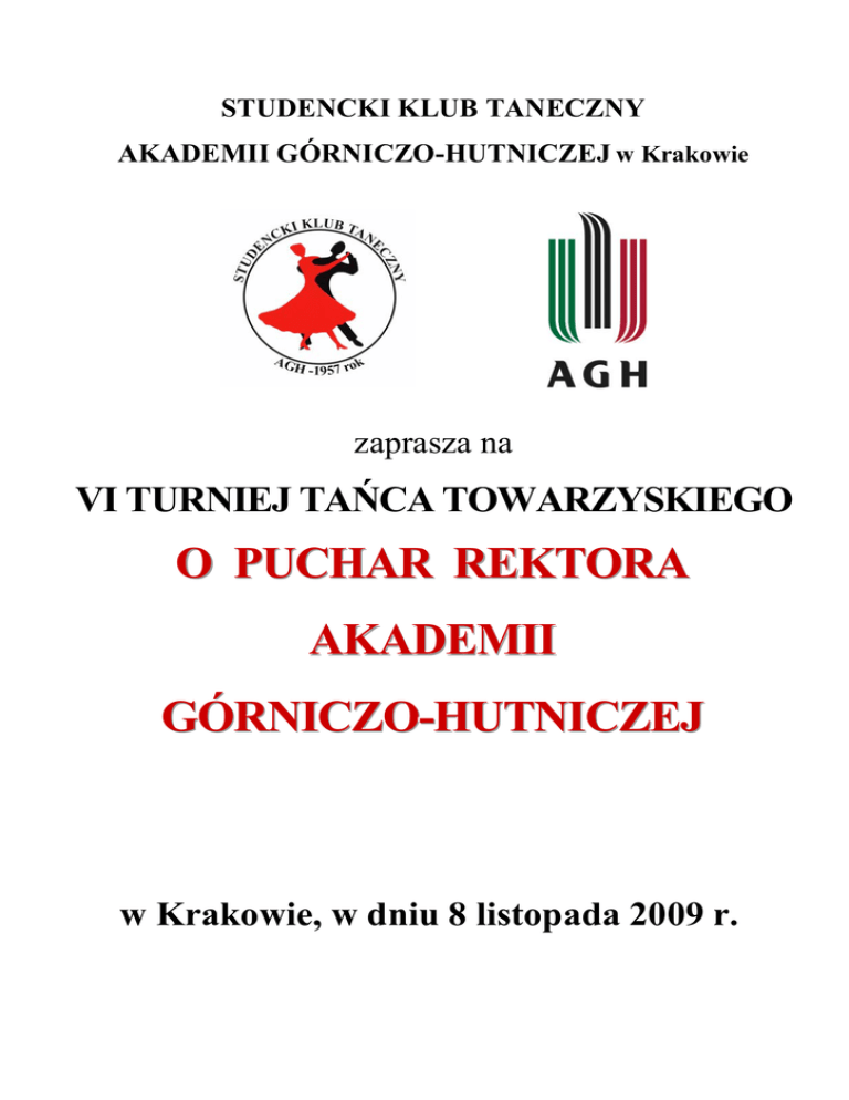 STUDENCKI KLUB TANECZNY AKADEMII GÓRNICZO-HUTNICZEJ w Krakowie zaprasza na VI TURNIEJ TAŃCA TOWARZYSKIEGO O PUCHAR REKTORA AKADEMII GÓRNICZO-HUTNICZEJ w Krakowie, w dniu 8 listopada 2009 r. Termin: 8 listopada 2009 r. (niedziela) Miejsce: Kraków, ul. Reymonta 15 1. Uczestnicy imprezy: ¾ kat. 10-11 lat klasa E ¾ kat. 10-11 lat klasa D ¾ kat. 12-13 lat klasa E ¾ kat. 12-13 lat klasa D ¾ kat. 12-13 lat klasa C ¾ kat. 14-15 lat klasa D ¾ kat. 14-15 lat klasa B ¾ ¾ ¾ ¾ ¾ Kat. pow.15 lat klasa E kat. pow.15 lat klasa D kat. pow.15 lat klasa C kat. pow.15 lat klasa B kat. pow.15 lat klasa A 2. Charakter turnieju: ¾ punktowy, indywidualny; ¾ w kombinacji - klasa E i D ¾ w stylach dla klasy C, B, A 3. Warunki uczestnictwa: ¾ Zarejestrowanie pary w Centralnej Bazie PTT z aktualną opłatą ¾ Przesłanie zgłoszenia do dnia 4. listopada 2009 r. e-mail: [email protected] tel./fax (0-12) 423-36-65 tel. 692-422-282 ¾ Wniesienie opłaty startowej: klasa E i D - 25 zł , klasa C, B,A - 20 zł za styl (od osoby) 4. Wymiary parkietu: 10 x 20 m; Sala klimatyzowana. Wymagane obuwie bez metalowych okuć 5. Organizator zapewnia: ¾ dyplomy dla par finałowych, ¾ puchary i nagrody dla par finałowych, ¾ opiekę medyczną 6. Turniej rozgrywany jest zgodnie z przepisami PTT. 7. Uwagi: ¾ Organizator nie odpowiada za rzeczy pozostawione w szatniach oraz za osoby niepełnoletnie, uczestniczące w turnieju. ¾ Koszty przejazdu i ubezpieczenia pokrywają pary lub instytucje delegujące. ¾ Organizator nie wysyła potwierdzenia przyjętych par. ¾ Uczestnictwo jest wyrażeniem zgody na publikowanie zdjęć oraz nagrań przez organizatorów. ¾ Wszelkie sprawy sporne lub nie ujęte w niniejszym regulaminie rozstrzyga Kierownik Turnieju w porozumieniu z Sędzią Głównym. Kierownik organizacyjny Stanisław Smoroń PROGRAM IMPREZY Część I: kat. 10-11 lat kl. E, D kat. 12-13 lat kl. E, D 8 30 – 9 00 rejestracja par 8 30 – 9 30 próba parkietu 10 00 eliminacje i finały Część II: kat. 12-13 lat kl. C kat. 14-15 lat kl. D, B kat. pow.15 lat kl. D, 12 00 – 12 30 rejestracja par 12 00 – 13 00 próba parkietu 13 30 eliminacje i finały Część III: kat. pow.15 lat kl. E, C, B, A 16 30 – 17 00 rejestracja par 16 30 – 17 30 próba parkietu 18 00 eliminacje i finały