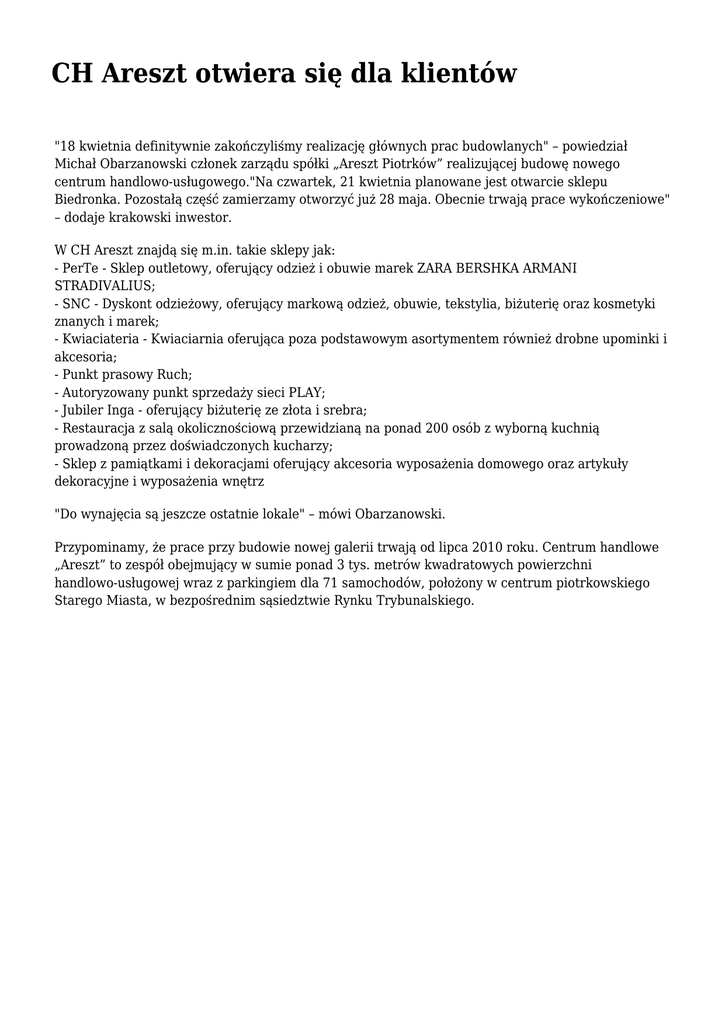 CH Areszt otwiera się dla klientów "18 kwietnia definitywnie zakończyliśmy realizację głównych prac budowlanych" – powiedział Michał Obarzanowski członek zarządu spółki „Areszt Piotrków” realizującej budowę nowego centrum handlowo-usługowego."Na czwartek, 21 kwietnia planowane jest otwarcie sklepu Biedronka. Pozostałą część zamierzamy otworzyć już 28 maja. Obecnie trwają prace wykończeniowe" – dodaje krakowski inwestor. W CH Areszt znajdą się m.in. takie sklepy jak: - PerTe - Sklep outletowy, oferujący odzież i obuwie marek ZARA BERSHKA ARMANI STRADIVALIUS; - SNC - Dyskont odzieżowy, oferujący markową odzież, obuwie, tekstylia, biżuterię oraz kosmetyki znanych i marek; - Kwiaciateria - Kwiaciarnia oferująca poza podstawowym asortymentem również drobne upominki i akcesoria; - Punkt prasowy Ruch; - Autoryzowany punkt sprzedaży sieci PLAY; - Jubiler Inga - oferujący biżuterię ze złota i srebra; - Restauracja z salą okolicznościową przewidzianą na ponad 200 osób z wyborną kuchnią prowadzoną przez doświadczonych kucharzy; - Sklep z pamiątkami i dekoracjami oferujący akcesoria wyposażenia domowego oraz artykuły dekoracyjne i wyposażenia wnętrz "Do wynajęcia są jeszcze ostatnie lokale" – mówi Obarzanowski. Przypominamy, że prace przy budowie nowej galerii trwają od lipca 2010 roku. Centrum handlowe „Areszt” to zespół obejmujący w sumie ponad 3 tys. metrów kwadratowych powierzchni handlowo-usługowej wraz z parkingiem dla 71 samochodów, położony w centrum piotrkowskiego Starego Miasta, w bezpośrednim sąsiedztwie Rynku Trybunalskiego.