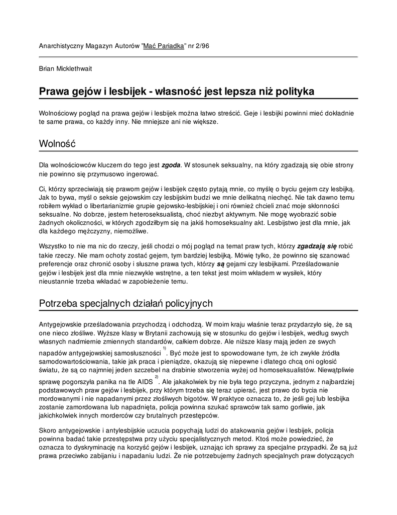 Anarchistyczny Magazyn Autorów ”Mać Pariadka” nr 2/96 Brian Micklethwait Prawa gejów i lesbijek - własność jest lepsza niż polityka Wolnościowy pogląd na prawa gejów i lesbijek można łatwo streścić. Geje i lesbijki powinni mieć dokładnie te same prawa, co każdy inny. Nie mniejsze ani nie większe. Wolność Dla wolnościowców kluczem do tego jest zgoda. W stosunek seksualny, na który zgadzają się obie strony nie powinno się przymusowo ingerować. Ci, którzy sprzeciwiają się prawom gejów i lesbijek często pytają mnie, co myślę o byciu gejem czy lesbijką. Jak to bywa, myśl o seksie gejowskim czy lesbijskim budzi we mnie delikatną niechęć. Nie tak dawno temu robiłem wykład o libertarianizmie grupie gejowsko-lesbijskiej i oni również chcieli znać moje skłonności seksualne. No dobrze, jestem heteroseksualistą, choć niezbyt aktywnym. Nie mogę wyobrazić sobie żadnych okoliczności, w których zgodziłbym się na jakiś homoseksualny akt. Lesbijstwo jest dla mnie, jak dla każdego mężczyzny, niemożliwe. Wszystko to nie ma nic do rzeczy, jeśli chodzi o mój pogląd na temat praw tych, którzy zgadzają się robić takie rzeczy. Nie mam ochoty zostać gejem, tym bardziej lesbijką. Mówię tylko, że powinno się szanować preferencje oraz chronić osoby i słuszne prawa tych, którzy są gejami czy lesbijkami. Prześladowanie gejów i lesbijek jest dla mnie niezwykle wstrętne, a ten tekst jest moim wkładem w wysiłek, który nieustannie trzeba wkładać w zapobieżenie temu. Potrzeba specjalnych działań policyjnych Antygejowskie prześladowania przychodzą i odchodzą. W moim kraju właśnie teraz przydarzyło się, że są one nieco złośliwe. Wyższe klasy w Brytanii zachowują się w stosunku do gejów i lesbijek, według swych własnych nadmiernie zmiennych standardów, całkiem dobrze. Ale niższe klasy mają jeden ze swych 1) napadów antygejowskiej samosłuszności . Być może jest to spowodowane tym, że ich zwykłe źródła samodowartościowania, takie jak praca i pieniądze, okazują się niepewne i dlatego chcą oni ogłosić światu, że są co najmniej jeden szczebel na drabinie stworzenia wyżej od homoseksualistów. Niewątpliwie 2) sprawę pogorszyła panika na tle AIDS . Ale jakakolwiek by nie była tego przyczyna, jednym z najbardziej podstawowych praw gejów i lesbijek, przy którym trzeba się teraz upierać, jest prawo do bycia nie mordowanymi i nie napadanymi przez złośliwych bigotów. W praktyce oznacza to, że jeśli gej lub lesbijka zostanie zamordowana lub napadnięta, policja powinna szukać sprawców tak samo gorliwie, jak jakichkolwiek innych morderców czy brutalnych przestępców. Skoro antygejowskie i antylesbijskie uczucia popychają ludzi do atakowania gejów i lesbijek, policja powinna badać takie przestępstwa przy użyciu specjalistycznych metod. Ktoś może powiedzieć, że oznacza to dyskryminację na korzyść gejów i lesbijek, uznając ich sprawy za specjalne przypadki. Że są już prawa przeciwko zabijaniu i napadaniu ludzi. Że nie potrzebujemy żadnych specjalnych praw dotyczących tej szczególnej okoliczności, że pobitymi są geje czy lesbijki. Rzeczywiście nie ma potrzeby zmieniać tu prawa. Morderstwo jest morderstwem. Napaść jest napaścią. Ale byłoby czymś oburzającym, gdyby policja pozostawała w ignorancji co do tej szczególnej klasy morderstw i napaści, które są motywowane wrogością do gejów i lesbijek, odmawiając traktowania tych przestępstw jako odrębnego typu ludzkiego działania. Jeśli zdarzyłaby się nieoczekiwana „eksplozja” podpaleń katolickich kościołów, policja próbowałaby dowiedzieć się, czy istnieje jakiś wzorzec tych przestępstw, zakładając jakąś specjalną grupę do ich rozpatrywania i próbując dojść, co też jest takiego w katolicyzmie lub jego kościołach, co tak denerwuje podpalaczy, tak, że w stosownym czasie mogliby oni zostać aresztowani. Gdyby policja tego nie robiła zasłaniając się tym, że byłaby to „dyskryminacja na korzyść katolików”, byłoby to absurdalne zaniedbanie jej obowiązków. To, że już istnieje prawo zabraniające podkładania ognia pod budynki jakiegokolwiek rodzaju, nie ma nic do rzeczy. Ci działacze ze środowiska gejów i lesbijek, którzy nastają na to, by policja traktowała antygejowskie i antylesbijskie przestępstwa jako odrębną rzecz mają tu całkowitą rację. Zdawkowe oglądanie telewizji daje mi podstawy przypuszczać, że 3) co najmniej część policji to rozumie . Prawo do dyskryminacji Ale, powtarzam, prawo nie powinno od nikogo wymagać, by lubił gejów czy lesbijki, ogólnie czy w szczególności. Złą - w obliczu tego - nowiną o libertarianizmie, z gejowskiego i lesbijskiego punktu widzenia, jest to, że popieramy prawo każdego do tego, by w granicach swego majątku, korzystając ze swych własnych zasobów, był tak niegrzeczny w stosunku do gejów i lesbijek, jak tylko chce. Pracodawcom powinno być wolno dyskryminować gejów i lesbijki, jeśli im się tak podoba, bo to oni płacą za pracę swych pracowników i to są ich pieniądze. Dokładnie ta sama reguła, mówiąca, że geje i lesbijki mogą robić ze swym majątkiem to, co im się podoba, powinna stosować się również do tych, którzy nie akceptują gejów czy lesbijek. Ujmując to w najbardziej prowokacyjny sposób, ludzie powinni mieć prawo zwalniać swych pracowników, jeśli nabiorą odrazy do koloru ich oczu. Jedynym ograniczeniem powinno być to, że nie mogą się w ten sposób zachowywać, jeśli zobowiążą się tego nie robić, jak to często pracodawcy czynią. Tak jak powiedziałem, brzmi to jak bardzo złe nowiny dla gejów i lesbijek. Ale przypuśćmy, że niektórzy geje zechcą otworzyć biznes i zatrudniać jedynie innych gejów, to jest dyskryminować na korzyść gejów. Czy powinni mieć do tego prawo? Wolnościowcy odpowiadają głośnym i kategorycznym tak. Wolnościowy