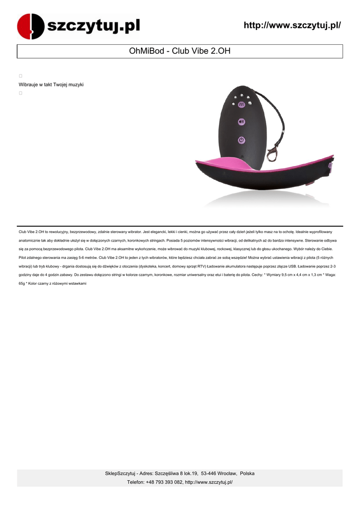 http://www.szczytuj.pl/ OhMiBod - Club Vibe 2.OH Wibrauje w takt Twojej muzyki Club Vibe 2.OH to rewolucyjny, bezprzewodowy, zdalnie sterowany wibrator. Jest elegancki, lekki i cienki, można go używać przez cały dzień jeżeli tylko masz na to ochotę. Idealnie wyprofilowany anatomicznie tak aby dokładnie ułożył się w dołączonych czarnych, koronkowych stringach. Posiada 5 poziomów intensywności wibracji, od delikatnych aż do bardzo intensywne. Sterowanie odbywa się za pomocą bezprzewodowego pilota. Club Vibe 2.OH ma aksamitne wykończenie, może wibrować do muzyki klubowej, rockowej, klasycznej lub do głosu ukochanego. Wybór należy do Ciebie. Pilot zdalnego sterowania ma zasięg 5-6 metrów. Club Vibe 2.OH to jeden z tych wibratorów, które będziesz chciała zabrać ze sobą wszędzie! Można wybrać ustawienia wibracji z pilota (5 różnych wibracji) lub tryb klubowy - drgania dostosują się do dźwięków z otoczenia (dyskoteka, koncert, domowy sprzęt RTV) Ładowanie akumulatora następuje poprzez złącze USB. Ładowanie poprzez 2-3 godziny daje do 4 godzin zabawy. Do zestawu dołączono stringi w kolorze czarnym, koronkowe, rozmiar uniwersalny oraz etui i baterię do pilota. Cechy: * Wymiary 9,5 cm x 4,4 cm x 1,3 cm * Waga: 65g * Kolor czarny z różowymi wstawkami SklepSzczytuj - Adres: Szczęśliwa 8 lok.19, 53-446 Wrocław, Polska Telefon: +48 793 393 082, http://www.szczytuj.pl/ http://www.szczytuj.pl/ SklepSzczytuj - Adres: Szczęśliwa 8 lok.19, 53-446 Wrocław, Polska Telefon: +48 793 393 082, http://www.szczytuj.pl/