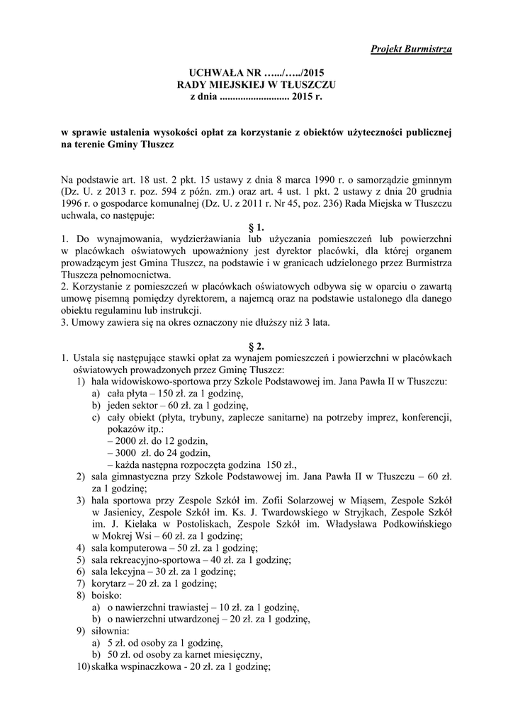 Projekt Burmistrza UCHWAŁA NR ….../…../2015 RADY MIEJSKIEJ W TŁUSZCZU z dnia ........................... 2015 r. w sprawie ustalenia wysokości opłat za korzystanie z obiektów użyteczności publicznej na terenie Gminy Tłuszcz Na podstawie art. 18 ust. 2 pkt. 15 ustawy z dnia 8 marca 1990 r. o samorządzie gminnym (Dz. U. z 2013 r. poz. 594 z późn. zm.) oraz art. 4 ust. 1 pkt. 2 ustawy z dnia 20 grudnia 1996 r. o gospodarce komunalnej (Dz. U. z 2011 r. Nr 45, poz. 236) Rada Miejska w Tłuszczu uchwala, co następuje: § 1. 1. Do wynajmowania, wydzierżawiania lub użyczania pomieszczeń lub powierzchni w placówkach oświatowych upoważniony jest dyrektor placówki, dla której organem prowadzącym jest Gmina Tłuszcz, na podstawie i w granicach udzielonego przez Burmistrza Tłuszcza pełnomocnictwa. 2. Korzystanie z pomieszczeń w placówkach oświatowych odbywa się w oparciu o zawartą umowę pisemną pomiędzy dyrektorem, a najemcą oraz na podstawie ustalonego dla danego obiektu regulaminu lub instrukcji. 3. Umowy zawiera się na okres oznaczony nie dłuższy niż 3 lata. § 2. 1. Ustala się następujące stawki opłat za wynajem pomieszczeń i powierzchni w placówkach oświatowych prowadzonych przez Gminę Tłuszcz: 1) hala widowiskowo-sportowa przy Szkole Podstawowej im. Jana Pawła II w Tłuszczu: a) cała płyta – 150 zł. za 1 godzinę, b) jeden sektor – 60 zł. za 1 godzinę, c) cały obiekt (płyta, trybuny, zaplecze sanitarne) na potrzeby imprez, konferencji, pokazów itp.: – 2000 zł. do 12 godzin, – 3000 zł. do 24 godzin, – każda następna rozpoczęta godzina 150 zł., 2) sala gimnastyczna przy Szkole Podstawowej im. Jana Pawła II w Tłuszczu – 60 zł. za 1 godzinę; 3) hala sportowa przy Zespole Szkół im. Zofii Solarzowej w Miąsem, Zespole Szkół w Jasienicy, Zespole Szkół im. Ks. J. Twardowskiego w Stryjkach, Zespole Szkół im. J. Kielaka w Postoliskach, Zespole Szkół im. Władysława Podkowińskiego w Mokrej Wsi – 60 zł. za 1 godzinę; 4) sala komputerowa – 50 zł. za 1 godzinę; 5) sala rekreacyjno-sportowa – 40 zł. za 1 godzinę; 6) sala lekcyjna – 30 zł. za 1 godzinę; 7) korytarz – 20 zł. za 1 godzinę; 8) boisko: a) o nawierzchni trawiastej – 10 zł. za 1 godzinę, b) o nawierzchni utwardzonej – 20 zł. za 1 godzinę, 9) siłownia: a) 5 zł. od osoby za 1 godzinę, b) 50 zł. od osoby za karnet miesięczny, 10) skałka wspinaczkowa - 20 zł. za 1 godzinę; 11) powierzchnia pod automat do napojów, artykułów spożywczych itp. – 200 zł. za miesiąc. 2. Czas korzystania z pomieszczeń określa się w pełnych godzinach zegarowych. 3. Podane stawki opłat są określone w wysokości brutto. § 3. 1. Opłatę za wynajem powierzchni na prowadzenie bufetu, sklepiku szkolnego itp. ustala się w drodze konkursu ofert cenowych. 2. Konkurs ofert przeprowadza dyrektor placówki oświatowej wybierając najkorzystniejszą cenowo ofertę. § 4. 1. Dyrektor placówki oświatowej może udzielić podmiotom stale korzystającym z pomieszczeń i powierzchni, zniżki do 20 % stawki określonej w § 2, pod warunkiem zawarcia umowy na okres co najmniej jednego miesiąca i obejmujący korzystanie z pomieszczeń w wymiarze co najmniej 8 godzin miesięcznie. 2. W szczególnie uzasadnionych przypadkach, za zgodą Burmistrza Tłuszcza, dyrektor placówki oświatowej może zwolnić z opłat za korzystanie z obiektu. § 5. 1. Gminne obiekty użyteczności publicznej mogą być udostępniane nieodpłatnie następującym podmiotom: 1) organizatorom imprez zleconych przez gminę lub organizowanych przy współudziale gminy oraz pod patronatem Burmistrza Tłuszcza; 2) gminnym jednostkom organizacyjnym realizującym swoje zadania statutowe; 3) klubom sportowym, stowarzyszeniom kultury fizycznej oraz organizacjom pozarządowym, mającym siedzibę na terenie Gminy Tłuszcz, realizującym zadania publiczne powierzone przez Gminę Tłuszcz. 2. Zgodę w sprawie nieodpłatnego udostępnienia obiektów użyteczności publicznej wyraża dyrektor placówki, po uzgodnieniu z Burmistrzem Tłuszcza. § 6. Umowy wynajmu, dzierżawy lub użyczenia zawarte przed dniem wejścia w życie niniejszej uchwały obowiązują do czasu ich zakończenia. § 7. Wykonanie uchwały powierza się Burmistrzowi Tłuszcza. § 8. Traci moc uchwała Nr XI/150/07 Rady Miejskiej w Tłuszczu z dnia 19 grudnia 2007 r. w sprawie ustalenia zasad korzystania z obiektów użyteczności publicznej na terenie Gminy Tłuszcz oraz uchwała Nr XI/116/2011 Rady Miejskiej w Tłuszczu z dnia 28 grudnia 2011 r. w sprawie zmiany uchwały Nr XI/150/07 Rady Miejskiej w Tłuszczu z dnia 19 grudnia 2007 r. w sprawie ustalenia zasad korzystania z obiektów użyteczności publicznej na terenie Gminy Tłuszcz. § 9. Uchwała wchodzi w życie z dniem podjęcia. Dokument przygotował: Tomasz Jusiński Data utworzenia dokumentu: 20.03.2015 r. Podpis pracownika: UZASADNIENIE do projektu uchwały Rady Miejskiej w Tłuszczu w sprawie ustalenia wysokości opłat za korzystanie z obiektów użyteczności publicznej na terenie Gminy Tłuszcz Zgodnie z art. 4 ust. 1 pkt. 2 ustawy z dnia 20 grudnia 1996 r. o gospodarce komunalnej (dz. U. z 2011 r. Nr 45, poz. 236) organy stanowiące jednostek samorządu terytorialnego ustalają wysokość cen i opłat za korzystanie z obiektów i urządzeń użyteczności publicznej. W związku z otwarciem nowopowstałej hali widowiskowo-sportowej przy Szkole Podstawowej w Tłuszczu istnieje konieczność ustalenie wysokości opłat za korzystanie z przedmiotowego obiektu. Wobec powyższego podjęcie niniejszej uchwały jest w pełni uzasadnione.