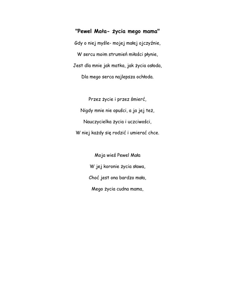 "Pewel Mała- życia mego mama" Gdy o niej myśle- mojej małej ojczyźnie, W sercu moim strumień miłości płynie, Jest dla mnie jak matka, jak życia osłoda, Dla mego serca najlepsza ochłoda. Przez życie i przez śmierć, Nigdy mnie nie opuści, a ja jej też, Nauczycielka życia i uczciwości, W niej każdy się rodzić i umierać chce. Moja wieś Pewel Mała W jej koronie życia sława, Choć jest ona bardzo mała, Mego życia cudna mama,