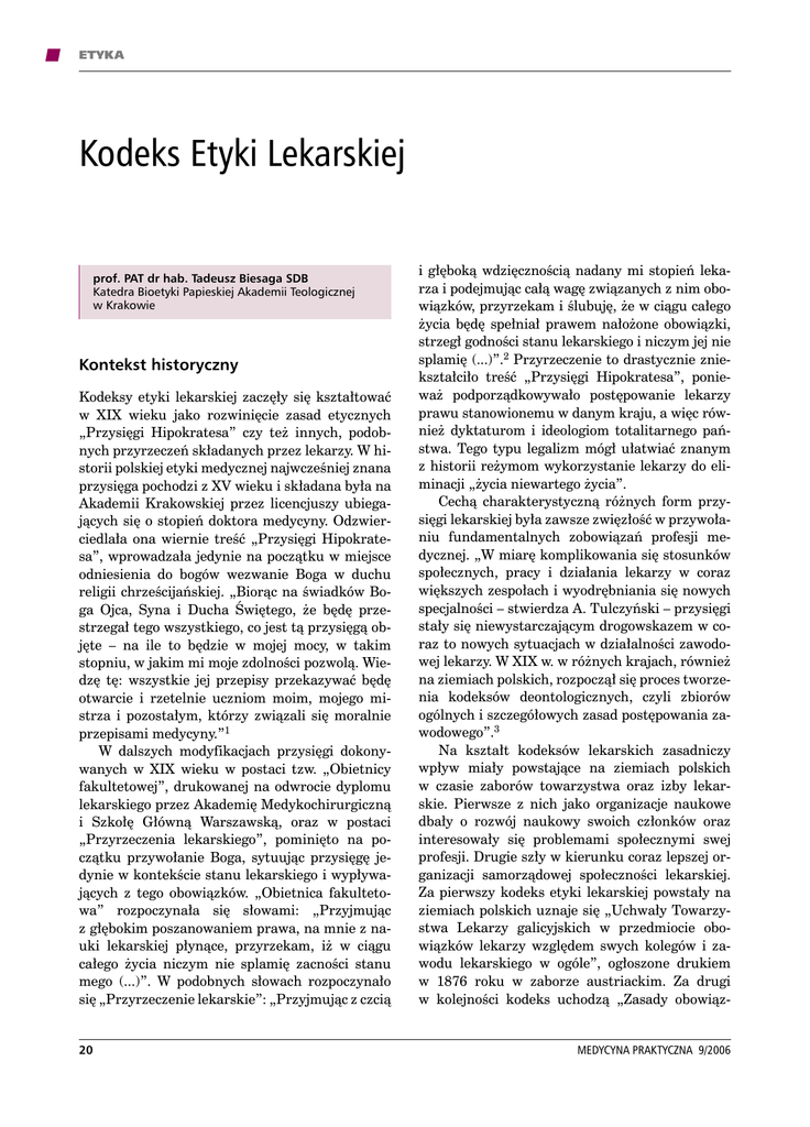 ETYKA Kodeks Etyki Lekarskiej prof. PAT dr hab. Tadeusz Biesaga SDB Katedra Bioetyki Papieskiej Akademii Teologicznej w Krakowie Kontekst historyczny Kodeksy etyki lekarskiej zaczęły się kształtować w XIX wieku jako rozwinięcie zasad etycznych „Przysięgi Hipokratesa” czy też innych, podobnych przyrzeczeń składanych przez lekarzy. W historii polskiej etyki medycznej najwcześniej znana przysięga pochodzi z XV wieku i składana była na Akademii Krakowskiej przez licencjuszy ubiegających się o stopień doktora medycyny. Odzwierciedlała ona wiernie treść „Przysięgi Hipokratesa”, wprowadzała jedynie na początku w miejsce odniesienia do bogów wezwanie Boga w duchu religii chrześcijańskiej. „Biorąc na świadków Boga Ojca, Syna i Ducha Świętego, że będę przestrzegał tego wszystkiego, co jest tą przysięgą objęte – na ile to będzie w mojej mocy, w takim stopniu, w jakim mi moje zdolności pozwolą. Wiedzę tę: wszystkie jej przepisy przekazywać będę otwarcie i rzetelnie uczniom moim, mojego mistrza i pozostałym, którzy związali się moralnie przepisami medycyny.”1 W dalszych modyfikacjach przysięgi dokonywanych w XIX wieku w postaci tzw. „Obietnicy fakultetowej”, drukowanej na odwrocie dyplomu lekarskiego przez Akademię Medykochirurgiczną i Szkołę Główną Warszawską, oraz w postaci „Przyrzeczenia lekarskiego”, pominięto na początku przywołanie Boga, sytuując przysięgę jedynie w kontekście stanu lekarskiego i wypływających z tego obowiązków. „Obietnica fakultetowa” rozpoczynała się słowami: „Przyjmując z głębokim poszanowaniem prawa, na mnie z nauki lekarskiej płynące, przyrzekam, iż w ciągu całego życia niczym nie splamię zacności stanu mego (...)”. W podobnych słowach rozpoczynało się „Przyrzeczenie lekarskie”: „Przyjmując z czcią 20 i głęboką wdzięcznością nadany mi stopień lekarza i podejmując całą wagę związanych z nim obowiązków, przyrzekam i ślubuję, że w ciągu całego życia będę spełniał prawem nałożone obowiązki, strzegł godności stanu lekarskiego i niczym jej nie splamię (...)”.2 Przyrzeczenie to drastycznie zniekształciło treść „Przysięgi Hipokratesa”, ponieważ podporządkowywało postępowanie lekarzy prawu stanowionemu w danym kraju, a więc również dyktaturom i ideologiom totalitarnego państwa. Tego typu legalizm mógł ułatwiać znanym z historii reżymom wykorzystanie lekarzy do eliminacji „życia niewartego życia”. Cechą charakterystyczną różnych form przysięgi lekarskiej była zawsze zwięzłość w przywołaniu fundamentalnych zobowiązań profesji medycznej. „W miarę komplikowania się stosunków społecznych, pracy i działania lekarzy w coraz większych zespołach i wyodrębniania się nowych specjalności – stwierdza A. Tulczyński – przysięgi stały się niewystarczającym drogowskazem w coraz to nowych sytuacjach w działalności zawodowej lekarzy. W XIX w. w różnych krajach, również na ziemiach polskich, rozpoczął się proces tworzenia kodeksów deontologicznych, czyli zbiorów ogólnych i szczegółowych zasad postępowania zawodowego”.3 Na kształt kodeksów lekarskich zasadniczy wpływ miały powstające na ziemiach polskich w czasie zaborów towarzystwa oraz izby lekarskie. Pierwsze z nich jako organizacje naukowe dbały o rozwój naukowy swoich członków oraz interesowały się problemami społecznymi swej profesji. Drugie szły w kierunku coraz lepszej organizacji samorządowej społeczności lekarskiej. Za pierwszy kodeks etyki lekarskiej powstały na ziemiach polskich uznaje się „Uchwały Towarzystwa Lekarzy galicyjskich w przedmiocie obowiązków lekarzy względem swych kolegów i zawodu lekarskiego w ogóle”, ogłoszone drukiem w 1876 roku w zaborze austriackim. Za drugi w kolejności kodeks uchodzą „Zasady obowiązMEDYCYNA PRAKTYCZNA 9/2006 ETYKA ków i praw lekarzy” ogłoszone drukiem na terenie zaboru rosyjskiego w 1884 roku przez Towarzystwo Lekarskie Warszawskie. W roku 1907 na X Zjeździe Lekarzy i Przyrodników Polskich we Lwowie opracowano i zaakceptowano wspólny dla lekarzy polskich wszystkich trzech zaborów „Kodeks Deontologii Lekarskiej”. Powtórnie został on ogłoszony drukiem już w niepodległej Polsce w 1925 roku.4 Za pierwszy kodeks opracowany w niepodległej Polsce uchodzi „Zbiór zasad deontologii lekarskiej” przyjęty na Walnym Zebraniu Naczelnej Izby Lekarskiej 16 VI 1935 roku. Zbiór ten ogłoszony powtórnie po drugiej wojnie światowej w 1947 roku obowiązywał do 1950 roku, czyli do rozwiązania przez władze komunistyczne Izb Lekarskich. „Od momentu likwidacji Izb Lekarskich do 1967 roku w Polsce przez siedemnaście lat nie funkcjonował formalnie żaden kodeks deontologiczny, żaden zbiór profesjonalnych norm powinności zawodowej”.5 W 1959 roku powstał projekt „Kodeksu Polskiej Służby Zdrowia” opracowany przez prof. Tadeusza Kielanowskiego. W przygotowaniu ostatecznej wersji uczestniczyło Polskie Towarzystwo Lekarskie, Polskie Towarzystwo Stomatologiczne i ówczesne Ministerstwo Zdrowia i Opieki Społecznej. Dnia 3 VI 1967 roku Walne Zgromadzenie Delegatów Polskiego Towarzystwa Lekarskiego z udziałem przedstawicieli innych towarzystw zatwierdziło ów kodeks zatytułowany „Zasady Etyczno-Deontologiczne PTL”. Kodeks ten znowelizowano w 1977 roku i nadano mu nazwę: „Zbiór Zasad Etyczno-Deontologicznych Polskiego Lekarza”. Wraz z upadkiem rządów komunistycznych, na mocy ustawy o izbach lekarskich z 17 V 1989 roku, lekarze w Polsce odzyskali swój samorząd czyli właściwie umocowanie Izb Lekarskich. Po przedłożeniu przez komisję powołaną do opracowania kodeksu etyki lekarskiej stosownego projektu oraz po burzliwych dyskusjach na Nadzwyczajnym II Krajowym Zjeździe Izb Lekarskich, 13–14 XII 1991 został przyjęty „Kodeks Etyki Lekarskiej”. Znowelizowano go 12–14 XII 1993 roku na III zjeździe o