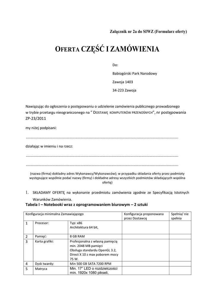 Załącznik nr 2a do SIWZ (Formularz oferty) OFERTA CZĘŚĆ I ZAMÓWIENIA Do: Babiogórski Park Narodowy Zawoja 1403 34-223 Zawoja Nawiązując do ogłoszenia o postępowaniu o udzielenie zamówienia publicznego prowadzonego w trybie przetargu nieograniczonego na ” DOSTAWĘ KOMPUTERÓW PRZENOŚNYCH”, nr postępowania ZP-23/2011 my niżej podpisani: ......................................................................................................................................................... działając w imieniu i na rzecz: ......................................................................................................................................................... ......................................................................................................................................................... (nazwa (firma) dokładny adres Wykonawcy/Wykonawców); w przypadku składania oferty przez podmioty występujące wspólnie podad nazwy (firmy) i dokładne adresy wszystkich podmiotów składających wspólna ofertę) 1. SKŁADAMY OFERTĘ na wykonanie przedmiotu zamówienia zgodnie ze Specyfikacją Istotnych Warunków Zamówienia. Tabela I – Notebooki wraz z oprogramowaniem biurowym – 2 sztuki Konfiguracja minimalna Zamawiającego 1 Procesor: Typ: x86 Architektura 64 bit, 2 3 Pamięd: Karta grafiki: 4 5 Dysk twardy: Matryca 8 GB RAM Profesjonalna z własną pamięcią min. 2048 MB pamięci Obsługa standardu OpenGL 3.2, Direct X 10 z max poborem mocy 75 W. Min 500 GB SATA 7200 RPM Min. 17” LED o rozdzielczości min. 1920x 1080 pikseli, Konfiguracja proponowana przez Dostawcę Spełnia/ nie spełnia 8 9 10 Napęd optyczny: Komunikacja przewodowa i bezprzewodowa: Karta dźwiękowa: Wskaźnik: Porty we/wy: 11 Bateria: 12 13 Waga Benchmarki: 14 Cechy dodatkowe: 15 16 Gwarancja System operacyjny: 17 Oprogramowanie biurowe: 6 7 matowa, o szerokim kącie widzenia, z powłoką antyrefleksyjną Combo Blu-ray, DVD +/-RW DL LAN 1 Gbps, WIFI IEEE 802.11a/b/g/n, Bluetooth Wbudowana HD Audio Touchpad i trackpoint Min. 4 x USB, eSATa FireWire, SmartCard, ExpressCard Min. 8 komorowa litowo- jonowa Min 3 godziny pracy Poniżej 3,80 kg 3DMark 2001 SE powyżej 36000 pkt. Wbudowana kamera internetowa min. 1,3 Mpix Min. 36 mies. System 64 bit. umożliwiający podłączenie do sieci i pracę w domenie (sieć w dyrekcji Parku oparta jest o oprogramowanie Windows SBS 2003), szyfrowanie EPS, tworzenie kopi zapasowych i przywracania systemu, Oprogramowanie ma posiadad interfejs w języku polskim i zawierad: edytor tekstu, arkusz kalkulacyjny, program do tworzenia prezentacji, program do obsługi baz danych umożliwiający obsługę posiadanych geobaz w formacie mdb., program do obsługi poczty mogący działad jako klient posiadanego w Parku oprogramowania pocztowego Exchange Server, program do tworzenia materiałów marketingowych, składu publikacji, program do łatwego tworzenia i organizowania notatek. Oprogramowanie pakietu ma umożliwiad odczyt informacji zawartych w plikach następujących formatów: *.doc, *.docx, *.xls, *.xlsx, *.ppt, *.pptx, *mdb, *.accdb, *.pub (Zamawiający posiada informacje zapisane w wyżej wymienionych formatach). Pakiet musi współpracowad z posiadanym oprogramowaniem biurowym (pakiety Microsoft Office w wersjach od 2000 do 2010), Gis-owym (ArcView 9.xx, ArcPad 7.x). Oprogramowanie ma byd objęte darmowym wsparcie technicznym. Oprogramowanie powinno byd dostarczone w najnowszej wersji, która jest dostępna na rynku w chwili publikacji ogłoszenia Torba dwukomorowa wzmacniana (sztywne boki na notebook 17”) 18 19 Cena brutto zł za dostawę sprzętu wraz z oprogramowaniem i torbą (2 sztuki Producent Model Dostawa 2 licencji oprogramowania antywirusowego Symantec Endpoint Protection SBS PL (pod Windows XP) z rocznym abonamentem lub równoważnego. A B C D L.p. Oprogramowanie Parametr wymagany (równoważny) Opis spełniania wymagao 1 Dwie licencje oprogramowania antywirusowego Symantec Endpoint Protection SBS PL (pod Windows) z rocznym Za równoważne Zamawiający uzna oprogramowanie antywirusowe chroniące przed wirusami i programami typu spyware, zapobiegające zagrożeniom, chroniące przed zagrożeniami sieciowymi. Oprogramowanie ma pozwalad na sporządzanie kopi zapasowych i współpracujące z zainstalowaną u zamawiającego konsolą TAK/NIE** zarządzającą Symantec Protection Center abonamentem 19 ) Cena brutto zł za dostawę oprogramowania dwie licencje Producent …………………………………………………………………………………………………………… Nazwa programu Dostawca dostarczy sprzęt z zainstalowanym i skonfigurowanym do pracy systemem operacyjnym, oraz zainstalowanym pakietem biurowym wraz z nośnikiem instalacyjnym pakietu biurowego. Tabela II – Oprogramowanie GIS-owe wraz modułami - 2 komplety licencji A L.p. 1. B C D Oprogramowanie Parametr wymagany (równoważny) Opis spełniania wymagao Dostawa 2 licencji jednostanowiskowych oprogramowania GIS ArcInfo w wersji 10 lub wyższej lub oprogramowania równoważnego, wraz z modułami: Spatial Analyst 10 lub równoważny - 2 szt., 3D Analyst: 10 lub równoważny - 2 szt., Network Analyst 10 lub równoważny - 2 szt., wraz z nośnikami instalacyjnymi. Za równoważne Zamawiający uzna oprogramowanie, które ma możliwośd bezpośredniej, poprawnej pracy z plikami w formacie ESRI ArcMap Document wytworzonymi w posiadanym przez Zamawiającego oprogramowaniu ESRI ArcView w wersji 9.x – pliki w formacie *.shp. Bezpośrednia i poprawna praca oznacza, że program będzie: - umożliwiał integrację wielu różnych typów danych ułatwiając wizualizację i prowadzenie analiz przestrzennych; umożliwiał bezpośrednie czytanie i integrację wielu formatów danych łącznie z danymi wektorowymi i rastrowymi, a także pochodzącymi z serwerów WMS; - łączył dane adresowe z lokalizacją geograficzną i wyświetlał je w określonym układ