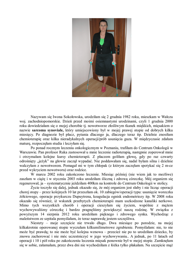 Nazywam się Iwona Sokołowska, urodziłam się 2 grudnia 1982 roku, mieszkam w Wałczu woj. zachodniopomorskie. Dzień przed moimi osiemnastymi urodzinami, czyli 1 grudnia 2000 roku dowiedziałam się o mojej chorobie tj. nowotworze złośliwym tkanek miękkich, mięsakiem o nazwie sarcoma synoviale, który umiejscowiony był w mojej prawej stopie od dobrych kilku miesięcy. Po diagnozie był płacz, pytania dlaczego ja, dlaczego teraz itp. Dzielnie znosiłam chemioterapię oraz kilka nieradykalnych operacji/prób usunięcia guza. W międzyczasie zdałam maturę, rozpoczęłam studia i leczyłam się. Po ponad rocznym leczeniu onkologicznym w Poznaniu, trafiłam do Centrum Onkologii w Warszawie. Pan profesor Ruka zastosował u mnie leczenie radioterapią, następnie zoperował mnie i otrzymałam kolejne kursy chemioterapii. Z płaczem goliłam głowę, gdy po raz czwarty odrośnięty „jeżyk” na głowie zaczął wypadać. Nie poddawałam się, nadal byłam silna i dzielnie walczyłam z nowotworem. Pomagał mi w tym chłopak (z którym zaczęłam spotykać się 2 m-ce przed wykryciem nowotworu) oraz rodzice. W marcu 2002 roku zakończono leczenie. Miesiąc później (nie wiem jak to możliwe) zaszłam w ciążę i w styczniu 2003 roku urodziłam śliczną i zdrową córeczkę. Mój organizm się regenerował, ja – systematycznie jeździłam 400km na kontrole do Centrum Onkologii w stolicy. Życie toczyło się dalej, jednak okazało się, że mój organizm jest słaby i nie licząc operacji chorej stopy – przez kolejnych 10 lat przeszłam ok. 10 zabiegów/operacji typu: usunięcie woreczka żółciowego, operacje przykurczu Dupuytrena, koagulacja ognisk endometriozy itp. W 2008 roku okazało się również, iż wskutek przebytych chemioterapii mam uszkodzone kanaliki nerkowe. Mimo tych wszystkich chorób i operacji cieszyłam się życiem, wspólnie z mężem wychowywaliśmy córeczkę i bardzo pragnęliśmy powiększyć naszą rodzinę. W związku z powyższym 14 sierpnia 2012 roku urodziłam pięknego i zdrowego synka. Wychodząc z maleństwem ze szpitala pomyślałam, że teraz naprawdę jestem szczęśliwa. Niestety – moje szczęście nie trwało długo. Dwa miesiące po porodzie, na mojej kilkakrotnie operowanej stopie wyczułam kilkumilimetrowe zgrubienie. Pomyślałam: nie, to nie może być prawdą; to nie może być kolejna wznowa – przecież nie po to urodziłam dziecko, by znowu zachorować i nie móc uczestniczyć w jego wychowywaniu.. A jednak, po 11 latach od operacji i 10 i pół roku po zakończeniu leczenia mięsak ponownie był w mojej stopie. Zamknęłam się w sobie, załamałam, przez dwa dni nie wychodziłam z łóżka tylko płakałam. Na szczęście mąż wyciągnął mnie z tego, wytłumaczył: że tak nie można, że muszę walczyć i się nie poddawać jak dawniej; że muszę to zrobić dla niego, dla niego i dzieci; że przecież za kilka lat muszę żyć, gdy synek w przedszkolu będzie mówił wierszyk z okazji Dnia Mamy; bo nikt nie zastąpi im mnie – mamy i żony... Piątego listopada 2012 roku pojechałam więc z mężem do Centrum Onkologii w Warszawie i profesor Rutkowski potwierdził moją diagnozę. Zostawiłam wynik tomografii komputerowej, zrobiłam RTG klatki piersiowej i czekałam na wyrok... Po dwóch dniach otrzymałam telefon z wiadomością, której nigdy nie chciałam usłyszeć.. „Dzień dobry Pani Iwono, mówi Piotr Rutkowski... Jest wynik RTG klatki – przerzutów nie ma, ale niestety po skonsultowaniu się z lekarzami stwierdziliśmy, iż jedyną metodą leczenia Pani jest amputacja, amputacja w podudziu...”. Telefon odebrałam niczego nieświadoma, trzymając dziecko na rękach i zamarłam. To była najgorsza wiadomość jaką w moim trzydziestoletnim życiu usłyszałam. Był to kolejny cios, którego następstwem była ogromna rozpacz, bezsilność.. Postanowiłam walczyć i żyć. Nie ważne czy z nogą czy bez niej, ale żyć. Szóstego grudnia 2012 roku mąż dostarczył mnie do CO, a następnego dnia amputowano mi nogę. Nie załamałam się, nie płakałam z tego powodu. Uczyłam się chodzić o kulach, bandażować kikut, pokonywać wiele przeszkód architektonicznych typu schody... . Zewsząd słyszę, że jestem dzielna, że walczę i się nie poddaję, że potrafię się uśmiechać i w miarę możliwości uczestniczę w wychowywaniu moich dzieci... Nie uważam, że jestem jakaś wyjątkowa. Ja po prostu cieszę się: że żyję; że mogę przytulać i całować moje dzieci; że mogę uczestniczyć w życiu rodzinnym, wytłumaczyć córce niezrozumiałe zadania z matematyki :); czuć że mąż mnie nadal mocno kocha (może nawet mocniej?)... Do szczęścia w życiu brakuje mi tylko nogi :( Nie, nie mojej – tej, która od 12 lat mnie bolała. Brakuje mi protezy, bym mogła po prostu chodzić i jeździć na rowerze. Chciałabym wziąć synka za rączkę i iść z nim na spacer (aktualnie brakuje mi spacerów, tęsknię za tym gdy mogłam włożyć synka do wózka i iść...). Na razie walczę z bólem, rana powoli się goi (wymaz z rany wykazał gronkowca, no ale przecież ja mam całe życie pod górę :), niedługo pojadę do protezowni obejrzeć te cuda – protezy. Dobra proteza podudzia kosztuje kilkadziesiąt tys. zł – chciałabym mieć dobrą protezę, gdyż mam dopiero 30 lat i chcę żyć normalnie. Nie chcę być osobą niepełnosprawną, gdyż mam silny organizm i silną psychikę. Na gorszej protezie nie da się chodzić, uciska kikut i go rani lub jeżeli da się chodzić, to tylko przy pomocy kul. Z całego serca pragnę, by Państwo pomogli mi uzyskać środki na protezę i co za tym idzie pomogli mi wrócić do normalności. Kocham życie mimo wielu kłód rzucanych mi pod nogi, chciałabym tylko mieć nogę... Można pomóc przekazując 1% swojego podatku na moją rzecz: Fundacja „Złotowianka” Ul. Widokowa 1 77-400 Złotów NIP 767-165-65-24 KRS-0000308316 Cel szczegółowy 1%: dla S