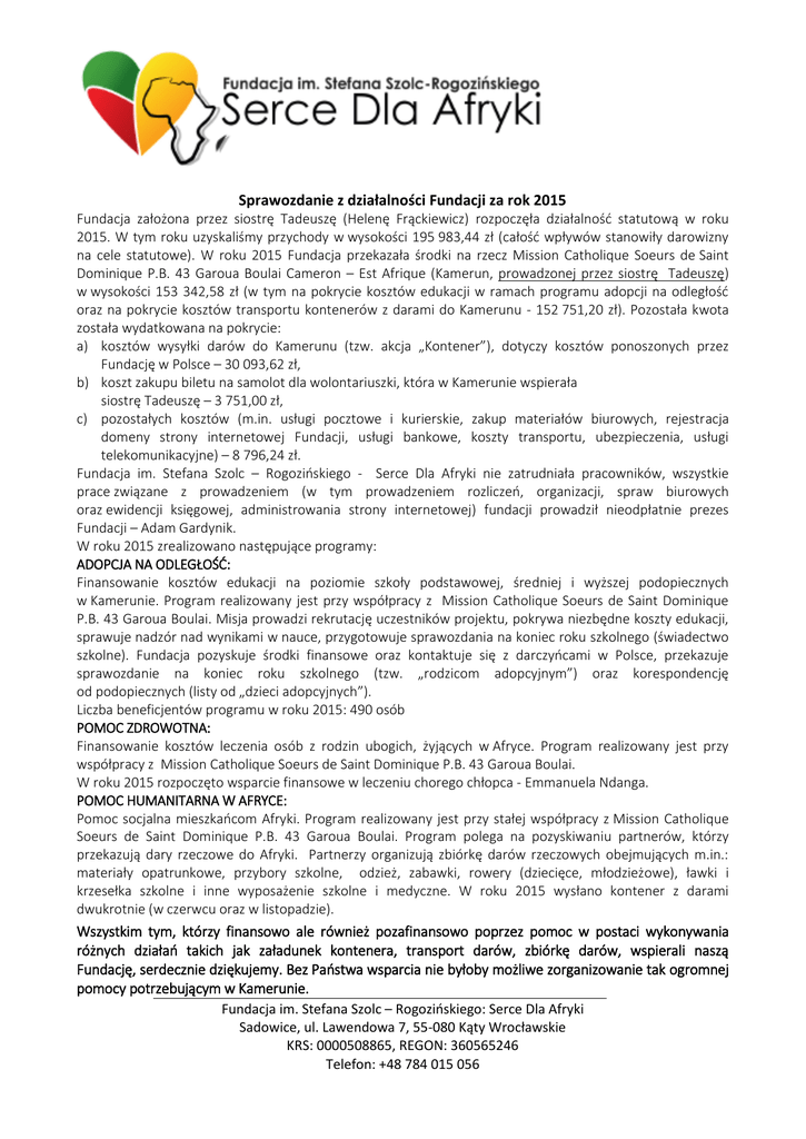 Sprawozdanie z działalności Fundacji za rok 2015 Fundacja założona przez siostrę Tadeuszę (Helenę Frąckiewicz) rozpoczęła działalność statutową w roku 2015. W tym roku uzyskaliśmy przychody w wysokości 195 983,44 zł (całość wpływów stanowiły darowizny na cele statutowe). W roku 2015 Fundacja przekazała środki na rzecz Mission Catholique Soeurs de Saint Dominique P.B. 43 Garoua Boulai Cameron – Est Afrique (Kamerun, prowadzonej przez siostrę Tadeuszę) w wysokości 153 342,58 zł (w tym na pokrycie kosztów edukacji w ramach programu adopcji na odległość oraz na pokrycie kosztów transportu kontenerów z darami do Kamerunu - 152 751,20 zł). Pozostała kwota została wydatkowana na pokrycie: a) kosztów wysyłki darów do Kamerunu (tzw. akcja „Kontener”), dotyczy kosztów ponoszonych przez Fundację w Polsce – 30 093,62 zł, b) koszt zakupu biletu na samolot dla wolontariuszki, która w Kamerunie wspierała siostrę Tadeuszę – 3 751,00 zł, c) pozostałych kosztów (m.in. usługi pocztowe i kurierskie, zakup materiałów biurowych, rejestracja domeny strony internetowej Fundacji, usługi bankowe, koszty transportu, ubezpieczenia, usługi telekomunikacyjne) – 8 796,24 zł. Fundacja im. Stefana Szolc – Rogozińskiego - Serce Dla Afryki nie zatrudniała pracowników, wszystkie prace związane z prowadzeniem (w tym prowadzeniem rozliczeń, organizacji, spraw biurowych oraz ewidencji księgowej, administrowania strony internetowej) fundacji prowadził nieodpłatnie prezes Fundacji – Adam Gardynik. W roku 2015 zrealizowano następujące programy: ADOPCJA NA ODLEGŁOŚĆ: Finansowanie kosztów edukacji na poziomie szkoły podstawowej, średniej i wyższej podopiecznych w Kamerunie. Program realizowany jest przy współpracy z Mission Catholique Soeurs de Saint Dominique P.B. 43 Garoua Boulai. Misja prowadzi rekrutację uczestników projektu, pokrywa niezbędne koszty edukacji, sprawuje nadzór nad wynikami w nauce, przygotowuje sprawozdania na koniec roku szkolnego (świadectwo szkolne). Fundacja pozyskuje środki finansowe oraz kontaktuje się z darczyńcami w Polsce, przekazuje sprawozdanie na koniec roku szkolnego (tzw. „rodzicom adopcyjnym”) oraz korespondencję od podopiecznych (listy od „dzieci adopcyjnych”). Liczba beneficjentów programu w roku 2015: 490 osób POMOC ZDROWOTNA: Finansowanie kosztów leczenia osób z rodzin ubogich, żyjących w Afryce. Program realizowany jest przy współpracy z Mission Catholique Soeurs de Saint Dominique P.B. 43 Garoua Boulai. W roku 2015 rozpoczęto wsparcie finansowe w leczeniu chorego chłopca - Emmanuela Ndanga. POMOC HUMANITARNA W AFRYCE: Pomoc socjalna mieszkańcom Afryki. Program realizowany jest przy stałej współpracy z Mission Catholique Soeurs de Saint Dominique P.B. 43 Garoua Boulai. Program polega na pozyskiwaniu partnerów, którzy przekazują dary rzeczowe do Afryki. Partnerzy organizują zbiórkę darów rzeczowych obejmujących m.in.: materiały opatrunkowe, przybory szkolne, odzież, zabawki, rowery (dziecięce, młodzieżowe), ławki i krzesełka szkolne i inne wyposażenie szkolne i medyczne. W roku 2015 wysłano kontener z darami dwukrotnie (w czerwcu oraz w listopadzie). Wszystkim tym, którzy finansowo ale również pozafinansowo poprzez pomoc w postaci wykonywania różnych działań takich jak załadunek kontenera, transport darów, zbiórkę darów, wspierali naszą Fundację, serdecznie dziękujemy. Bez Państwa wsparcia nie byłoby możliwe zorganizowanie tak ogromnej pomocy potrzebującym w Kamerunie. Fundacja im. Stefana Szolc – Rogozińskiego: Serce Dla Afryki Sadowice, ul. Lawendowa 7, 55-080 Kąty Wrocławskie KRS: 0000508865, REGON: 360565246 Telefon: +48 784 015 056