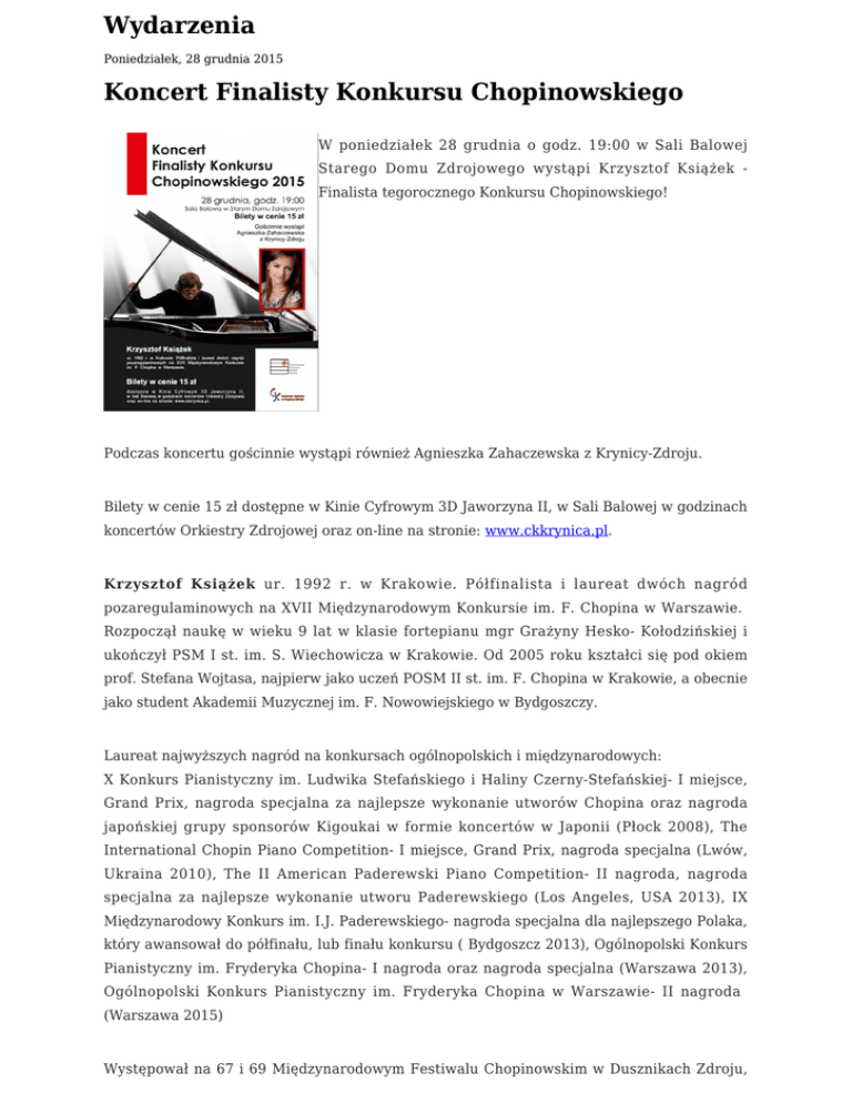 Wydarzenia Poniedziałek, 28 grudnia 2015 Koncert Finalisty Konkursu Chopinowskiego W poniedziałek 28 grudnia o godz. 19:00 w Sali Balowej Starego Domu Zdrojowego wystąpi Krzysztof Książek Finalista tegorocznego Konkursu Chopinowskiego! Podczas koncertu gościnnie wystąpi również Agnieszka Zahaczewska z Krynicy-Zdroju. Bilety w cenie 15 zł dostępne w Kinie Cyfrowym 3D Jaworzyna II, w Sali Balowej w godzinach koncertów Orkiestry Zdrojowej oraz on-line na stronie: www.ckkrynica.pl. Krzysztof Książek ur. 1992 r. w Krakowie. Półfinalista i laureat dwóch nagród pozaregulaminowych na XVII Międzynarodowym Konkursie im. F. Chopina w Warszawie. Rozpoczął naukę w wieku 9 lat w klasie fortepianu mgr Grażyny Hesko- Kołodzińskiej i ukończył PSM I st. im. S. Wiechowicza w Krakowie. Od 2005 roku kształci się pod okiem prof. Stefana Wojtasa, najpierw jako uczeń POSM II st. im. F. Chopina w Krakowie, a obecnie jako student Akademii Muzycznej im. F. Nowowiejskiego w Bydgoszczy. Laureat najwyższych nagród na konkursach ogólnopolskich i międzynarodowych: X Konkurs Pianistyczny im. Ludwika Stefańskiego i Haliny Czerny-Stefańskiej- I miejsce, Grand Prix, nagroda specjalna za najlepsze wykonanie utworów Chopina oraz nagroda japońskiej grupy sponsorów Kigoukai w formie koncertów w Japonii (Płock 2008), The International Chopin Piano Competition- I miejsce, Grand Prix, nagroda specjalna (Lwów, Ukraina 2010), The II American Paderewski Piano Competition- II nagroda, nagroda specjalna za najlepsze wykonanie utworu Paderewskiego (Los Angeles, USA 2013), IX Międzynarodowy Konkurs im. I.J. Paderewskiego- nagroda specjalna dla najlepszego Polaka, który awansował do półfinału, lub finału konkursu ( Bydgoszcz 2013), Ogólnopolski Konkurs Pianistyczny im. Fryderyka Chopina- I nagroda oraz nagroda specjalna (Warszawa 2013), Ogólnopolski Konkurs Pianistyczny im. Fryderyka Chopina w Warszawie- II nagroda (Warszawa 2015) Występował na 67 i 69 Międzynarodowym Festiwalu Chopinowskim w Dusznikach Zdroju, XVIII Międzynarodowym Festiwalu Młodych Laureatów Konkursów Muzycznych „Silesia” w Katowicach oraz na II Festiwalu Premia Filharmonii Łódzkiej im. Artura Rubinsteina. Koncertował w Japonii, Wielkiej Brytanii, Niemczech, Francji, Włoszech, RPA, USA, Polsce, na Słowacji i na Węgrzech. Jest stypendystą Ministerstwa Nauki i Szkolnictwa Wyższego, Ministerstwa Kultury i Dziedzictwa Narodowego oraz Fundacji Pro Musica Bona, programu stypendialnego "Młoda Polska". W latach 2005-2011 był objęty programem Krajowego Funduszu na rzecz Dzieci. W marcu 2014 roku otrzymał Stypendium Krystiana Zimermana. W kręgu jego zainteresowań znajduje się również kameralistyka, której uczy się pod kierunkiem prof. Kai Danczowskiej, mgr Justyny Danczowskiej i dr hab. Sławomira Cierpika. Agnieszka Zahaczewska – ur. 19.02.1991 r. w Krynicy-Zdroju. Naukę gry na fortepianie rozpoczęła w wieku 7 lat. Była uczennicą Państwowej Szkoły Muzycznej w Nowym Sączu, którą ukończyła z wyróżnieniem. Uczyła się u mgr Danuty Jarząbek, a następnie, od 2007 r. u prof. Stefana Wojtasa. W 2015 r. ukończyła z wyróżnieniem Akademię Muzyczną w Krakowie w klasie prof. Stefana Wojtasa, a obecnie kontynuuje studia w Akademii Muzycznej im. Karola Szymanowskiego w Katowicach w klasie prof. Wojciecha Świtały. W czasie studiów doskonaliła swoje umiejętności kameralne pod okiem prof. Kai Danczowskiej, Justyny Danczowskiej oraz dr hab. Sławomira Cierpika. Występowała z takimi muzykami jak Aleksandra Kuls, Aleksandra Lelek, Aleksander Daszkiewicz czy Krzysztof Książek. Jest laureatką kilku Małopolskich Przeglądów Uczniów Klas Fortepianu w Krynicy-Zdroju. W 2006 r. otrzymała III nagrodę na Ogólnopolskim Konkursie im. Stefanii Wojtowicz w Jaśle oraz wyróżnienie na Ogólnopolskim Konkursie Chopinowskim im. Władysława Kędry w Łodzi. W 2007 oraz 2015 r. została laureatką II nagrody oraz nagrody za najlepsze wykonanie utworu Juliusza Zarębskiego na Międzynarodowym Konkursie im. Juliusza Zarębskiego w Warszawie- Łomiankach. W 2010 r. wzięła udział w programie „Chopin Inspiruje” organizowanym przez krakowski oddział Telewizji Polskiej oraz otrzymała wyróżnienie na VII Ogólnopolskim Festiwalu „Chopinowskie Interpretacje Młodych” w Koninie-Żychlinie. W 2015 r. jako członkini kwintetu fortepianowego otrzymała III nagrodę na Ogólnopolskim Turnieju Kameralnym w Bydgoszczy. Wystąpiła w domu narodzin Fryderyka Chopina w Żelazowej Woli oraz w Muzeum Chopina w Warszawie w ramach recitali organizowanych przez Narodowy Instytut Fryderyka Chopina. Kilkakrotnie brała udział w kursach mistrzowskich, pracując pod kierunkiem takich profesorów jak Mariola Cieniawa, Tamas Ungar, Andrzej Tatarski, Jerzy Sterczyński i inni. Była stypendystką Rektora Akademii Muzycznej w Krakowie, Burmistrza Krynicy-Zdroju, wiele razy otrzymywała także stypendia artystyczne przyznawane przez fundację stypendialną Almanachu Muszyny.