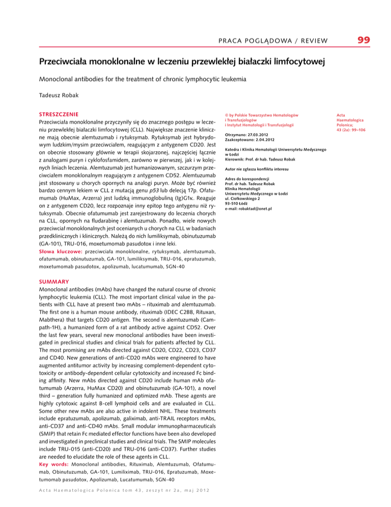 praca poglądowa / review 99 Przeciwciała monoklonalne w leczeniu przewlekłej białaczki limfocytowej Monoclonal antibodies for the treatment of chronic lymphocytic leukemia Tadeusz Robak Streszczenie Przeciwciała monoklonalne przyczyniły się do znacznego postępu w leczeniu przewlekłej białaczki limfocytowej (CLL). Największe znaczenie kliniczne mają obecnie alemtuzumab i rytuksymab. Rytuksymab jest hybrydowym ludzkim/mysim przeciwciałem, reagującym z antygenem CD20. Jest on obecnie stosowany głównie w terapii skojarzonej, najczęściej łącznie z analogami puryn i cyklofosfamidem, zarówno w pierwszej, jak i w kolejnych liniach leczenia. Alemtuzumab jest humanizowanym, szczurzym przeciwciałem monoklonalnym reagującym z antygenem CD52. Alemtuzumab jest stosowany u chorych opornych na analogi puryn. Może być również bardzo cennym lekiem w CLL z mutacją genu p53 lub delecją 17p. Ofatumumab (HuMax, Arzerra) jest ludzką immunoglobuliną (Ig)G1κ. Reaguje on z antygenem CD20, lecz rozpoznaje inny epitop tego antygenu niż rytuksymab. Obecnie ofatumumab jest zarejestrowany do leczenia chorych na CLL, opornych na fludarabinę i alemtuzumab. Ponadto, wiele nowych przeciwciał monoklonalnych jest ocenianych u chorych na CLL w badaniach przedklinicznych i klinicznych. Należą do nich lumiliksymab, obinutuzumab (GA-101), TRU-016, moxetumomab pasudotox i inne leki. Słowa kluczowe: przeciwciała monoklonalne, rytuksymab, alemtuzumab, ofatumumab, obinutuzumab, GA-101, lumiliksymab, TRU-016, epratuzumab, moxetumomab pasudotox, apolizumab, lucatumumab, SGN-40 Summary Monoclonal antibodies (mAbs) have changed the natural course of chronic lymphocytic leukemia (CLL). The most important clinical value in the patients with CLL have at present two mAbs – rituximab and alemtuzumab. The first one is a human mouse antibody, rituximab (IDEC C2B8, Rituxan, Mabthera) that targets CD20 antigen. The second is alemtuzumab (Campath-1H), a humanized form of a rat antibody active against CD52. Over the last few years, several new monoclonal antibodies have been investigated in preclinical studies and clinical trials for patients affected by CLL. The most promising are mAbs directed against CD20, CD22, CD23, CD37 and CD40. New generations of anti-CD20 mAbs were engineered to have augmented antitumor activity by increasing complement-dependent cytotoxicity or antibody-dependent cellular cytotoxicity and increased Fc binding affinity. New mAbs directed against CD20 include human mAb ofatumumab (Arzerra, HuMax CD20) and obinutuzumab (GA-101), a novel third – generation fully humanized and optimized mAb. These agents are highly cytotoxic against B-cell lymphoid cells and are evaluated in CLL. Some other new mAbs are also active in indolent NHL. These treatments include epratuzumab, apolizumab, galiximab, anti-TRAIL receptors mAbs, anti-CD37 and anti-CD40 mAbs. Small modular immunopharmaceuticals (SMIP) that retain Fc mediated effector functions have been also developed and investigated in preclinical studies and clinical trials. The SMIP molecules include TRU-015 (anti-CD20) and TRU-016 (anti-CD37). Further studies are needed to elucidate the role of these agents in CLL. Key words: Monoclonal antibodies, Rituximab, Alemtuzumab, Ofatumumab, Obinutuzumab, GA-101, Lumiliximab, TRU-016, Epratuzumab, Moxetumomab pasudotox, Apolizumab, Lucatumumab, SGN-40 Ac t a H aemato l og ic a Po l o nic a to m 43, ze s z y t nr 2a , maj 2012 © by Polskie Towarzystwo Hematologów i Transfuzjologów i Instytut Hematologii i Transfuzjologii Otrzymano: 27.03.2012 Zaakceptowano: 2.04.2012 Katedra i Klinika Hematologii Uniwersytetu Medycznego w Łodzi Kierownik: Prof. dr hab. Tadeusz Robak Autor nie zgłasza konfliktu interesu Adres do korespondencji Prof. dr hab. Tadeusz Robak Klinika Hematologii Uniwersytetu Medycznego w Łodzi ul. Ciołkowskiego 2 93-510 Łódź e-mail: [email protected] Acta Haematologica Polonica; 43 (2a): 99–106 100 praca poglądowa / review Wstęp Przewlekła białaczka limfocytowa (chronic lymphocytic leukemia; CLL) jest chorobą nowotworową morfologicznie dojrzałych limfocytów B, występujących we krwi, szpiku kostnym, tkance limfatycznej i w innych narządach. Jest to najczęstsza białaczka w zachodnim świecie z 3–4 nowych zachorowań w ciągu roku wśród 100 000 osób [1]. CLL występuje najczęściej u ludzi starszych, a średnia wieku podczas rozpoznania wynosi około 65–70 lat. Naturalny przebieg choroby jest bardzo zróżnicowany, a chorzy z nieprogresywną i bezobjawową postacią białaczki nie wymagają leczenia. Przez wiele lat chlorambucyl był lekiem z wyboru w pierwszej linii leczenia chorych na CLL [2]. Obecnie chlorambucyl w monoterapii lub skojarzeniu z prednizonem jest zalecany u chorych starszych lub ze współistniejącymi innymi chorobami. W monoterapii chlorambucyl stosuje się p.o. 4–8 mg/m2/d przez 4–8 tygodni, w dawkach pulsacyjnych 15–30 mg/m2 co 2–4 tygodni albo 12 mg/m2/d w cyklach 5–7‑dniowych raz w miesiącu [2]. Skojarzenie chlorambucylu z prednizonem zaleca się u chorych z cytopenią autoimmunologiczną. U chorych wcześniej nieleczonych odpowiedź hematologiczną uzyskiwano w 30–70%, lecz stosunkowo rzadko stwierdza się całkowite remisje [2–5]. Analogi nukleozydów purynowych (PNA) fludarabinę lub kladrybinę stosuje się obecnie najczęściej w skojarzeniu z cyklofosfamidem, głównie ze względu na większy odsetek odpowiedzi i dłuższy czas trwania remisji w porównaniu z monoterapią [6, 7]. Randomizowane badania grupy PALG (PALG CLL3) wykazały, że programy FC (fludarabina + cyklofosfamid i kladrybina + cyklofosfamid) są tak samo skuteczne i ich tolerancja jest podobna [8]. W ostatnich latach szereg przeciwciał monoklonalnych i immunotoksyn poddano badaniom klinicznym u chorych na CLL [9]. Największe znaczenie mają obecnie trzy przeciwciała – rytuksymab (Mabthera), ofatumumab (HuMax, Arzerra) i alemtuzumab (Campath