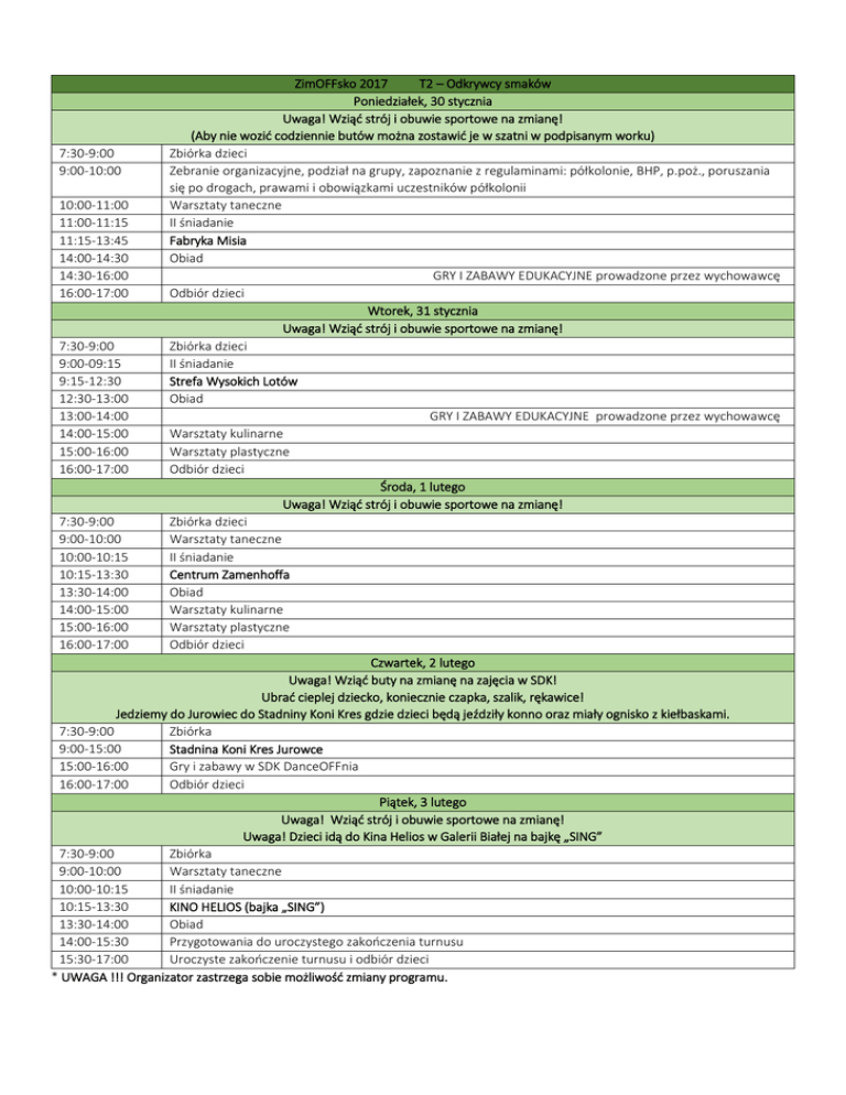 ZimOFFsko 2017 T2 – Odkrywcy smaków Poniedziałek, 30 stycznia Uwaga! Wziąć strój i obuwie sportowe na zmianę! (Aby nie wozić codziennie butów można zostawić je w szatni w podpisanym worku) 7:30-9:00 Zbiórka dzieci 9:00-10:00 Zebranie organizacyjne, podział na grupy, zapoznanie z regulaminami: półkolonie, BHP, p.poż., poruszania się po drogach, prawami i obowiązkami uczestników półkolonii 10:00-11:00 Warsztaty taneczne 11:00-11:15 II śniadanie 11:15-13:45 Fabryka Misia 14:00-14:30 Obiad 14:30-16:00 GRY I ZABAWY EDUKACYJNE prowadzone przez wychowawcę 16:00-17:00 Odbiór dzieci Wtorek, 31 stycznia Uwaga! Wziąć strój i obuwie sportowe na zmianę! 7:30-9:00 Zbiórka dzieci 9:00-09:15 II śniadanie 9:15-12:30 Strefa Wysokich Lotów 12:30-13:00 Obiad 13:00-14:00 GRY I ZABAWY EDUKACYJNE prowadzone przez wychowawcę 14:00-15:00 Warsztaty kulinarne 15:00-16:00 Warsztaty plastyczne 16:00-17:00 Odbiór dzieci Środa, 1 lutego Uwaga! Wziąć strój i obuwie sportowe na zmianę! 7:30-9:00 Zbiórka dzieci 9:00-10:00 Warsztaty taneczne 10:00-10:15 II śniadanie 10:15-13:30 Centrum Zamenhoffa 13:30-14:00 Obiad 14:00-15:00 Warsztaty kulinarne 15:00-16:00 Warsztaty plastyczne 16:00-17:00 Odbiór dzieci Czwartek, 2 lutego Uwaga! Wziąć buty na zmianę na zajęcia w SDK! Ubrać cieplej dziecko, koniecznie czapka, szalik, rękawice! Jedziemy do Jurowiec do Stadniny Koni Kres gdzie dzieci będą jeździły konno oraz miały ognisko z kiełbaskami. 7:30-9:00 Zbiórka 9:00-15:00 Stadnina Koni Kres Jurowce 15:00-16:00 Gry i zabawy w SDK DanceOFFnia 16:00-17:00 Odbiór dzieci Piątek, 3 lutego Uwaga! Wziąć strój i obuwie sportowe na zmianę! Uwaga! Dzieci idą do Kina Helios w Galerii Białej na bajkę „SING” 7:30-9:00 Zbiórka 9:00-10:00 Warsztaty taneczne 10:00-10:15 II śniadanie 10:15-13:30 KINO HELIOS (bajka „SING”) 13:30-14:00 Obiad 14:00-15:30 Przygotowania do uroczystego zakończenia turnusu 15:30-17:00 Uroczyste zakończenie turnusu i odbiór dzieci * UWAGA !!! Organizator zastrzega sobie możliwość zmiany programu.