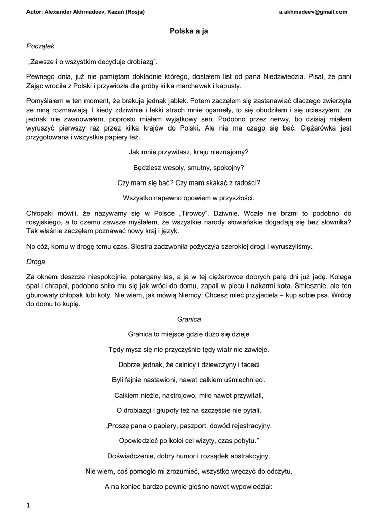 Autor: Alexander Akhmadeev, Kazań (Rosja) [email protected] Polska a ja Początek „Zawsze i o wszystkim decyduje drobiazg”. Pewnego dnia, już nie pamiętam dokładnie którego, dostałem list od pana Niedźwiedzia. Pisał, że pani Zając wrociła z Polski i przywiozła dla próby kilka marchewek i kapusty. Pomyślałem w ten moment, że brakuje jednak jabłek. Potem zaczęłem się zastanawiać dlaczego zwierzęta ze mną rozmawiają. I kiedy zdziwinie i lekki strach mnie ogarneły, to się obudziłem i się ucieszyłem, że jednak nie zwariowałem, poprostu miałem wyjątkowy sen. Podobno przez nerwy, bo dzisiaj miałem wyruszyć pierwszy raz przez kilka krajów do Polski. Ale nie ma czego się bać. Ciężarówka jest przygotowana i wszystkie papiery też. Jak mnie przywitasz, kraju nieznajomy? Będziesz wesoły, smutny, spokojny? Czy mam się bać? Czy mam skakać z radości? Wszystko napewno opowiem w przyszłości. Chłopaki mówili, że nazywamy się w Polsce „Tirowcy”. Dziwnie. Wcale nie brzmi to podobno do rosyjskiego, a to czemu zawsze myślałem, że wszystkie narody słowiańskie dogadają się bez słownika? Tak właśnie zaczęłem poznawać nowy kraj i język. No cóż, komu w drogę temu czas. Siostra zadzwoniła pożyczyła szerokiej drogi i wyruszyliśmy. Droga Za oknem deszcze niespokojnie, potargany las, a ja w tej ciężarowce dobrych parę dni już jadę. Kolega spał i chrapał, podobno sniło mu się jak wróci do domu, zapali w piecu i nakarmi kota. Śmiesznie, ale ten gburowaty chłopak lubi koty. Nie wiem, jak mówią Niemcy: Chcesz mieć przyjaciela – kup sobie psa. Wrócę do domu to kupię. Granica Granica to miejsce gdzie dużo się dzieje Tędy mysz się nie przyczyśnie tędy wiatr nie zawieje. Dobrze jednak, że celnicy i dziewczyny i faceci Byli fajnie nastawioni, nawet całkiem uśmiechnięci. Całkiem nieźle, nastrojowo, miło nawet przywitali, O drobiazgi i głupoty też na szczęście nie pytali. „Proszę pana o papiery, paszport, dowód rejestracyjny. Opowiedzieć po kolei cel wizyty, czas pobytu.” Doświadczenie, dobry humor i rozsądek abstrakcyjny, Nie wiem, coś pomogło mi zrozumieć, wszystko wręczyć do odczytu. A na koniec bardzo pewnie głośno nawet wypowiedział: 1 Autor: Alexander Akhmadeev, Kazań (Rosja) [email protected] „Ja Tirowiec, towarzysze”, wiedźcie jeśli kto nie wiedział. Restauracja Jak dotarliśmy do celu to czas już był późny byliśmy głodni i żeby nie iść spać na pusty żołądek poszliśmy do restauracji „Pod Wawelem”. Spodobało nam się: wielkie porcje, smaczne jedzenie: bigos, pierogi, żurek i inne smakołyki. Potem śpiewaliśmy „...bo wszyscy Polacy to jedna rodzina”. Poczułem się jak w domu, tak przyjemnie mi było. Czułem, że spodoba mi się tu i tu zostanę, jeśli zawsze będzie takie dobre jedzenie i tacy mili ludzi. Po drodze do hotelu Wracając do hotelu smuciłem się mimo wszystko, chciałem zamienić każdy oddech w niespokojny wiatr, by zabrał mnie z powrotem - tam, gdzie mam swój świat. Gdzieś w środku poskładały się wszystkie szepty w jeden ciepły krzyk. Ale jak się okazało krzyczeć w środku nocy nie było zbyt dobrym pomysłem, usłyszałem kilka niezadowolonych głosów dookoła i zrozumiałem, że nawet ciepły krzyk w nocy nie może być dobrym, mimo, że polska poetka Halina Poświatowska mówiła, że „cisza rozdziela bardziej niż przestrzeń, że nie przynosi słów i nawet zabija myśli”. No cóź, zbliżyłem się do tych, co krzyczeli, bo słowa były, nieważne jakie, ale nie wiadomo czy udało się uratować myśli. Byłem tak zmęczony po podróży, że chciało mi się tylko spać. Pamiątki Następnego dnia do wizyty w hurtowni owoców skoczyłem po pamiątki. Tak naprawdę dla mnie jedyne co się liczy i w ogóle jest rzeczą najważniejszą mięso, dlatego najpierw kupiłem kilka kilogramów pamiątek dla siebie – kiełbasy Krakowsie, Myśliwskie oraz opakowanie schabowych. Nie mam dużo ale wiem czy starczy tego dobrego na długo, ale chociaż nawet przez krótki czas będę gdzieś za tysiąc kilometrów przypominał sobie ten kraj gościnny. Co ciekawe, właśnie zauważyłem, że akurat tutaj ludzi się na tym znają. Jak tłumaczył mi jeden polski tirowiec: „Ja nie jem ziemniaków z mięsem, tylko mięso z ziemniakami”. To jest prawdziwa filozofia życia. Niestety nie mogłem kupić samych mięsnych rzeczy, ponieważ siostra i mama pytały o słodycze. Matko bosko, wytłumacz mi, proszę Cię, jak można woleć słodyczę od mięsa? Trzeba jednak się przyznać, że cukiernie i piekarnie podobno są znaczącą częścią polskiej kultury, bo wybór jest wielki. Kupiłem kilka opakowań cukierek Wawelskich oraz Wedelskich, oryginalne Ptasie mleczko, czekoladki. Cukiernie Od zewnątrz i w środku ładnie wygłądające Za kilometer już czuć jak dobrze pachnące. Z pólek zajączki patrzą nastrojowo, Wszystko jest jadalne, bo czekoladowe. Byłbym kobietą, co jest na diece, Nie wyrzekłbym się drożdżówek za nic w świecie. Dzisiaj Po tamtej pierwszej delegacji minęło już parę lat. Póki pracowałem w tej branży miałem szczęście odwiedzieć wielu polskich miejsc. Każde ma coś własnego, niesamowitego. Kraków – to nie tylko Stare miasto, to jest też specjalne podejście ludzi do życia oraz Wieliczka i Zakopane. Miasto Łódź jest sławne pod kątem historii przemysłu w kraju oraz pokojowe współistnienie wielu różnych narodowości: Polaków, Niemców, Żydów, Rosjan. Jej kamienicy i fabryczne budynki przypominają o byłej znaczności. Śląsk 2 Autor: Alexander Akhmadeev, Kazań (Rosja) [email protected] podziwia poziomem urbanizacji sięgającym 80 procent. procent Warszawa wa przyciąga z kulturalnego punktu widzenia. Pierwszy raz widziałem takie wspaniałe musicale jak tam. Palac Kultury, co wznosi się w niebo jako wielkolud, przyciąg wzrok.. Ale to jest moja Polska, inny jej nie m