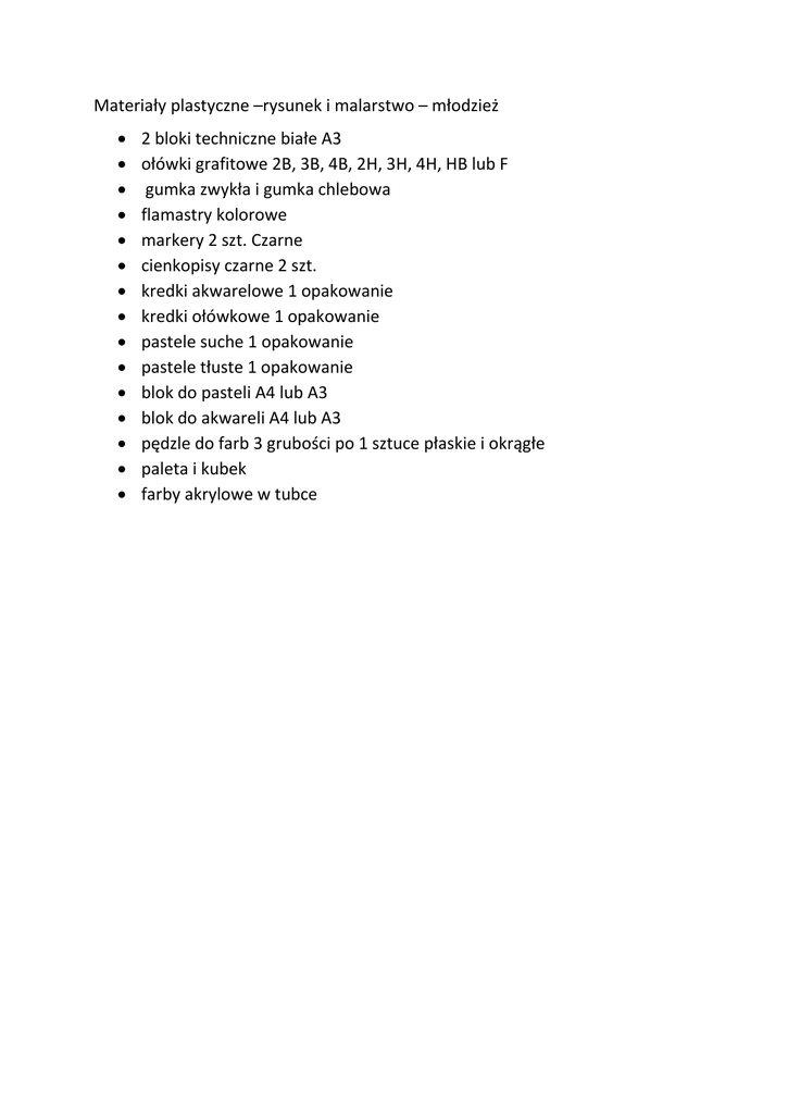 Materiały plastyczne –rysunek i malarstwo – młodzież                2 bloki techniczne białe A3 ołówki grafitowe 2B, 3B, 4B, 2H, 3H, 4H, HB lub F gumka zwykła i gumka chlebowa flamastry kolorowe markery 2 szt. Czarne cienkopisy czarne 2 szt. kredki akwarelowe 1 opakowanie kredki ołówkowe 1 opakowanie pastele suche 1 opakowanie pastele tłuste 1 opakowanie blok do pasteli A4 lub A3 blok do akwareli A4 lub A3 pędzle do farb 3 grubości po 1 sztuce płaskie i okrągłe paleta i kubek farby akrylowe w tubce