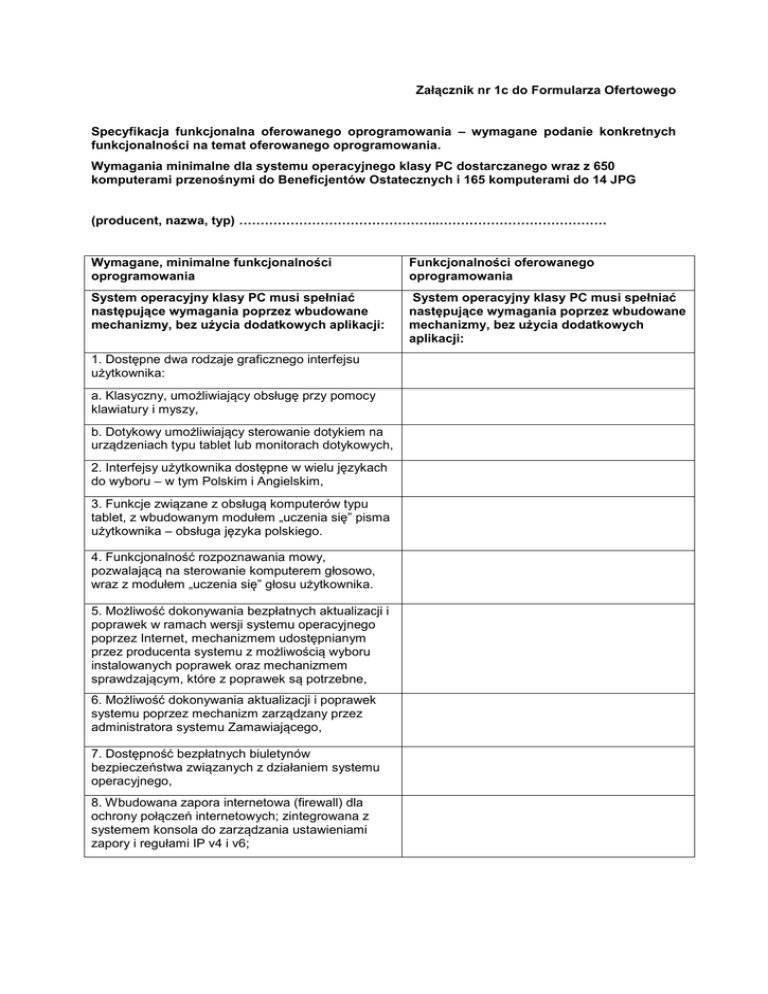 Załącznik nr 1c do Formularza Ofertowego Specyfikacja funkcjonalna oferowanego oprogramowania – wymagane podanie konkretnych funkcjonalności na temat oferowanego oprogramowania. Wymagania minimalne dla systemu operacyjnego klasy PC dostarczanego wraz z 650 komputerami przenośnymi do Beneficjentów Ostatecznych i 165 komputerami do 14 JPG (producent, nazwa, typ) ………………………………………..………………………………… Wymagane, minimalne funkcjonalności oprogramowania Funkcjonalności oferowanego oprogramowania System operacyjny klasy PC musi spełniać następujące wymagania poprzez wbudowane mechanizmy, bez użycia dodatkowych aplikacji: System operacyjny klasy PC musi spełniać następujące wymagania poprzez wbudowane mechanizmy, bez użycia dodatkowych aplikacji: 1. Dostępne dwa rodzaje graficznego interfejsu użytkownika: a. Klasyczny, umożliwiający obsługę przy pomocy klawiatury i myszy, b. Dotykowy umożliwiający sterowanie dotykiem na urządzeniach typu tablet lub monitorach dotykowych, 2. Interfejsy użytkownika dostępne w wielu językach do wyboru – w tym Polskim i Angielskim, 3. Funkcje związane z obsługą komputerów typu tablet, z wbudowanym modułem „uczenia się” pisma użytkownika – obsługa języka polskiego. 4. Funkcjonalność rozpoznawania mowy, pozwalającą na sterowanie komputerem głosowo, wraz z modułem „uczenia się” głosu użytkownika. 5. Możliwość dokonywania bezpłatnych aktualizacji i poprawek w ramach wersji systemu operacyjnego poprzez Internet, mechanizmem udostępnianym przez producenta systemu z możliwością wyboru instalowanych poprawek oraz mechanizmem sprawdzającym, które z poprawek są potrzebne, 6. Możliwość dokonywania aktualizacji i poprawek systemu poprzez mechanizm zarządzany przez administratora systemu Zamawiającego, 7. Dostępność bezpłatnych biuletynów bezpieczeństwa związanych z działaniem systemu operacyjnego, 8. Wbudowana zapora internetowa (firewall) dla ochrony połączeń internetowych; zintegrowana z systemem konsola do zarządzania ustawieniami zapory i regułami IP v4 i v6; 9. Wbudowane mechanizmy ochrony antywirusowej i przeciw złośliwemu oprogramowaniu z zapewnionymi bezpłatnymi aktualizacjami, 10. Zlokalizowane w języku polskim, co najmniej następujące elementy: menu, odtwarzacz multimediów, pomoc, komunikaty systemowe, 11. Graficzne środowisko instalacji i konfiguracji dostępne w języku polskim, 12. Wsparcie dla większości powszechnie używanych urządzeń peryferyjnych (drukarek, urządzeń sieciowych, standardów USB, Plug & Play, WiFi), 13. Funkcjonalność automatycznej zmiany domyślnej drukarki w zależności od sieci, do której podłączony jest komputer, 14. Możliwość zarządzania stacją roboczą poprzez polityki grupowe – przez politykę rozumiemy zestaw reguł definiujących lub ograniczających funkcjonalność systemu lub aplikacji, 15. Rozbudowane, definiowalne polityki bezpieczeństwa – polityki dla systemu operacyjnego i dla wskazanych aplikacji, 16. Zabezpieczony hasłem hierarchiczny dostęp do systemu, konta i profile użytkowników zarządzane zdalnie; praca systemu w trybie ochrony kont użytkowników. 17. Zintegrowany z systemem moduł wyszukiwania informacji (plików różnego typu, tekstów, metadanych) dostępny z kilku poziomów: poziom menu, poziom otwartego okna systemu operacyjnego; system wyszukiwania oparty na konfigurowalnym przez użytkownika module indeksacji zasobów lokalnych, 18. Zintegrowany z systemem operacyjnym moduł synchronizacji komputera z urządzeniami zewnętrznymi. 19. Wbudowany system pomocy w języku polskim; 20. Możliwość przystosowania stanowiska dla osób niepełnosprawnych (np. słabo widzących); 21. Wsparcie dla IPSEC oparte na politykach – wdrażanie IPSEC oparte na zestawach reguł definiujących ustawienia zarządzanych w sposób centralny; 22. Automatyczne występowanie i używanie (wystawianie) certyfikatów PKI X.509; 23. Mechanizmy logowania w oparciu o: a. Login i hasło, b. Karty z certyfikatami (smartcard), c. Wirtualne karty (logowanie w oparciu o certyfikat chroniony poprzez moduł TPM), 24. Wsparcie dla uwierzytelniania na bazie Kerberos v.5, 25. Wsparcie do uwierzytelnienia urządzenia na bazie certyfikatu, 26. Wsparcie dla algorytmów Suite B (RFC 4869), 27. Wsparcie wbudowanej zapory ogniowej dla Internet Key Exchange v. 2 (IKEv2) dla warstwy transportowej IPsec, 28. Wbudowane narzędzia służące do administracji, do wykonywania kopii zapasowych polityk i ich odtwarzania oraz generowania raportów z ustawień polityk; 29. Wsparcie dla środowisk Java i .NET Framework 1.1 i 2.x, 3.x i 4.x – możliwość uruchomienia aplikacji działających we wskazanych środowiskach, 30. Wsparcie dla JScript i VBScript – możliwość uruchamiania interpretera poleceń, 31. Zdalna pomoc i współdzielenie aplikacji – możliwość zdalnego przejęcia sesji zalogowanego użytkownika celem rozwiązania problemu z komputerem, 32. Rozwiązanie służące do automatycznego zbudowania obrazu systemu wraz z aplikacjami. Obraz systemu służyć ma do automatycznego upowszechnienia systemu operacyjnego inicjowanego i wykonywanego w całości poprzez sieć komputerową, 33. Rozwiązanie ma umożliwiające wdrożenie nowego obrazu poprzez zdalną instalację, 34. Transakcyjny system plików pozwalający na stosowanie przydziałów (ang. quota) na dysku dla użytkowników oraz zapewniający większą niezawodność i pozwalający tworzyć kopie zapasowe, 35. Zarządzanie kontami użytkowników sieci oraz urządzeniami sieciowymi tj. drukarki, modemy, woluminy dyskowe, usługi katalogowe 36. Udostępnianie modemu, 37. Oprogramowanie dla tworzenia kopii zapasowych (Backup); automatyczne wykonywanie kopii plików z możliwością automatycznego przywrócenia wersji wcześniejszej, 38. Możliwość przywracania obrazu plików systemowych do uprzednio zapisanej postaci, 39. Iden