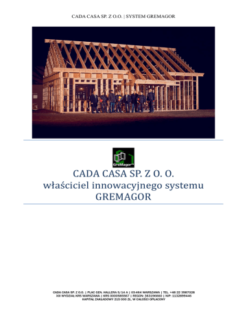 CADA CASA SP. Z O.O. | SYSTEM GREMAGOR CADA CASA SP. Z O. O. właściciel innowacyjnego systemu GREMAGOR CADA CASA SP. Z O.O. | PLAC GEN. HALLERA 5/14 A | 03-464 WARSZAWA | TEL. +48 22 3987028 XIII WYDZIAŁ KRS WARSZAWA | KRS 0000585567 | REGON: 363196660 | NIP: 1132899446 KAPITAŁ ZAKŁADOWY 215 000 ZŁ, W CAŁOŚCI OPŁACONY CADA CASA SP. Z O.O. | SYSTEM GREMAGOR Uwaga – każdy „Stan GreMagor” stanowi osobną pozycję cenową (pozycje A i B nie sumują się). Ceny mogą ulec zmianie – precyzyjna kalkulacja jest dokonywana na podstawie projektu architektonicznego, zaadoptowanego do systemu GreMagor. Szacowany poziom dokładności około +- 15%. Ceny zależą m.in.: - od aktualnych cen drewna, obecny szacunek wykonano dla parametrów drewna C24 certyfikowanych CE - grubości i gęstości stropów w zależności od wyliczeń statyczno-wytrzymałościowych - rodzaju wypełnienia termoizolacją - rodzaju materiałów dla budowy przegród (np. producent płyt konstrukcyjnych, typ płyt konstrukcyjnych OSB) - stawki VAT zależą od wyboru wariantu Przyjęty wariant: konstrukcja będzie posadowiona na ścianach fundamentowych (nie wliczono w cenę), na których będzie zastosowany system GreMagor w połączeniu ze stropem z dwuteowników. Takie rozwiązanie zapewni pasywne odgrodzenie termiczne od fundamentu. Założenia: kalkulacja według rysunków https://www.extradom.pl/projekt-domu-dom-przy-bukowej-5-KRK1284 Obraz 1. Źródło: extradom.pl Stan GreMagor A – „Szkielet” Płyta fundamentowa GreMagor - wliczona w cenę (przy naszym systemie z izolacją od gruntu na 300 mm nie jest wymagana tzw. płyta ciepła). Szacowana cena: 120000 PLN netto Stawka VAT: +23% A. Konstrukcja (ściany zewnętrzne) 1. Konstrukcja w systemie GreMagor – grubość standardowa 320 mm. B. Ściany wewnętrzne 1. Konstrukcja w systemie GreMagor – 230 mm. C. Ściany działowe 1. Konstrukcja w systemie GreMagor – 90 mm. CADA CASA SP. Z O.O. | PLAC GEN. HALLERA 5/14 A | 03-464 WARSZAWA | TEL. +48 22 3987028 XIII WYDZIAŁ KRS WARSZAWA | KRS 0000585567 | REGON: 363196660 | NIP: 1132899446 KAPITAŁ ZAKŁADOWY 215 000 ZŁ, W CAŁOŚCI OPŁACONY CADA CASA SP. Z O.O. | SYSTEM GREMAGOR D. Strop* 1. Płyta konstrukcyjna – 15 mm. 2. Belki dwuteowe Steico – 300 mm. E. Konstrukcja dachu 1. Konstrukcja z belek dwuteowych Steico – 300 mm. * w tym strop na fundamencie, celem termicznego odgrodzenia pasywnego od gruntu Stan GreMagor B – „Stan półdeweloperski” – pasywny Szacowana cena: 215000 PLN netto Stawki VAT: +8% osoby prywatne, +23% firmy Płyta fundamentowa GreMagor – pasywna - wliczona w cenę (przy naszym systemie z izolacją od gruntu na 300 mm nie jest wymagana tzw. płyta ciepła). A. Konstrukcja (ściany zewnętrzne) 1. Płyta konstrukcyjna z pióro wpustem – 12 mm. 2. Konstrukcja w systemie GreMagor - 320 mm. 3. Izolacja termiczna (wełna mineralna)*. 4. Płyta izolacyjna – Steico Protect - 40 mm. * zalecana wełna drzewna (droższa), ale o lepszych parametrach cieplnych i fizykochemicznych m.in. dla paroprzepuszczalności, akumulacji cieplnej B. 1. 2. 3. 4. Ściany wewnętrzne Płyta konstrukcyjna – 12 mm. Konstrukcja w systemie GreMagor – 230 mm. Izolacja akustyczna (wełna mineralna). Płyta konstrukcyjna – 12 mm. C. 1. 2. 3. 4. Ściany działowe – poszycie zgodnie z przeznaczeniem Płyta akustyczna – 8 mm. Konstrukcja w systemie GreMagor – 90 mm. Izolacja akustyczna (wełna mineralna). Płyta akustyczna – 8 mm. D. 1. 2. 3. 4. Strop nad parterem Płyta konstrukcyjna – 15 mm. Belki dwuteowe Steico – 300 mm. Izolacja akustyczna (wełna mineralna). Płyta konstrukcyjna – 10 mm. E. Strop nad fundamentem 5. Płyta konstrukcyjna – 15 mm. 6. Belki dwuteowe Steico – 300 mm. 7. Izolacja akustyczna (wełna mineralna)*. 8. Płyta konstrukcyjna – 10 mm. * zalecana wełna drzewna (droższa), ale o lepszych parametrach cieplnych i fizykochemicznych m.in. dla paroprzepuszczalności, akumulacji cieplnej F. Konstrukcja dachu (płatwiowo-kleszczowy) 1. Płyta konstrukcyjna – 12 mm. 2. Konstrukcja z belek dwuteowych Steico – 300 mm. CADA CASA SP. Z O.O. | PLAC GEN. HALLERA 5/14 A | 03-464 WARSZAWA | TEL. +48 22 3987028 XIII WYDZIAŁ KRS WARSZAWA | KRS 0000585567 | REGON: 363196660 | NIP: 1132899446 KAPITAŁ ZAKŁADOWY 215 000 ZŁ, W CAŁOŚCI OPŁACONY CADA CASA SP. Z O.O. | SYSTEM GREMAGOR 3. Izolacja termiczna (wełna mineralna). 4. Płyta konstrukcyjna typu MFP 12 mm 5. Membrana dachowa. 6. Kontrłaty – 25 x 55 mm. 7. Łaty dachowe – 60 x 50 mm. 8. Pokrycie dachowe do uzgodnienia cenowego (nie wliczone w cenę) Okna i drzwi zewnętrzne zgodne z parametrami budynku energooszczędnego, montowane w termoizolacji (do wyceny indywidualnej). Szczegółowy opis przygotowania i składu Stanu GreMagor B: 1. Posadowienie ramy dolnej (podwaliny) na płycie GreMagor. Rama dolna wykonana z drewna klejonego warstwowo z fornirów - LVL. Przekroje belek nośnych o rozmiarach 60 x 60 mm. Rama ułożona na folii izolacyjnej i mocowana kotwami do fundamentu. Rozstaw kotew mocujących maksymalnie 1200 mm na odcinkach prostych i 800 mm przy narożnikach. 2. Układanie konstrukcji podłogi parteru w systemie GreMagor. Konstrukcja podłogi parteru, układana na kompletnej powierzchni gabarytów zewnętrznych budowli. Materiał konstrukcyjny stanowią belki dwuteowe Steico Joist 300 mm. Jako materiał termo-izolacyjny zastosowano wełnę mineralna, która wypełnia konstrukcje podłogi na grubość 261 mm. Poszyciem zewnętrznym konstrukcji jest płyta cementowo-drzazgowa Cetris Basic z pióro-wpustem o grubości 12 mm. Poszycie wewnętrzne stanowi płyta konstrukcyjna OSB-III z pióro-wpustem o grubości 15 mm i płyta podłogowa Steico Therm 30 mm. Plyta Steico Therm, ułożona na powierzchni gabarytów wewnętrznych pomieszczeń. 3. Układanie konstrukcji ścian zewnętrznych w systemie GreMagor. Konstrukcja ścian zewnętrznych o grubości 320 mm, składana do wysokości 2700 mm. 