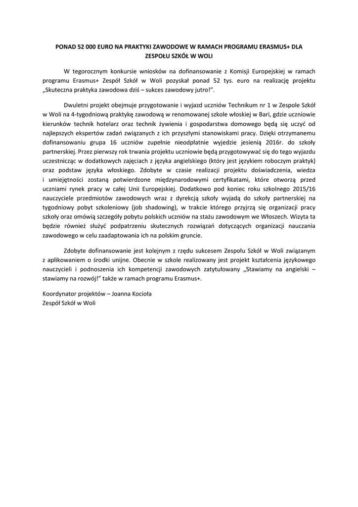 PONAD 52 000 EURO NA PRAKTYKI ZAWODOWE W RAMACH PROGRAMU ERASMUS+ DLA ZESPOŁU SZKÓŁ W WOLI W tegorocznym konkursie wniosków na dofinansowanie z Komisji Europejskiej w ramach programu Erasmus+ Zespół Szkół w Woli pozyskał ponad 52 tys. euro na realizację projektu „Skuteczna praktyka zawodowa dziś – sukces zawodowy jutro!”. Dwuletni projekt obejmuje przygotowanie i wyjazd uczniów Technikum nr 1 w Zespole Szkół w Woli na 4-tygodniową praktykę zawodową w renomowanej szkole włoskiej w Bari, gdzie uczniowie kierunków technik hotelarz oraz technik żywienia i gospodarstwa domowego będą się uczyć od najlepszych ekspertów zadań związanych z ich przyszłymi stanowiskami pracy. Dzięki otrzymanemu dofinansowaniu grupa 16 uczniów zupełnie nieodpłatnie wyjedzie jesienią 2016r. do szkoły partnerskiej. Przez pierwszy rok trwania projektu uczniowie będą przygotowywać się do tego wyjazdu uczestnicząc w dodatkowych zajęciach z języka angielskiego (który jest językiem roboczym praktyk) oraz podstaw języka włoskiego. Zdobyte w czasie realizacji projektu doświadczenia, wiedza i umiejętności zostaną potwierdzone międzynarodowymi certyfikatami, które otworzą przed uczniami rynek pracy w całej Unii Europejskiej. Dodatkowo pod koniec roku szkolnego 2015/16 nauczyciele przedmiotów zawodowych wraz z dyrekcją szkoły wyjadą do szkoły partnerskiej na tygodniowy pobyt szkoleniowy (job shadowing), w trakcie którego przyjrzą się organizacji pracy szkoły oraz omówią szczegóły pobytu polskich uczniów na stażu zawodowym we Włoszech. Wizyta ta będzie również służyć podpatrzeniu skutecznych rozwiązań dotyczących organizacji nauczania zawodowego w celu zaadaptowania ich na polskim gruncie. Zdobyte dofinansowanie jest kolejnym z rzędu sukcesem Zespołu Szkół w Woli związanym z aplikowaniem o środki unijne. Obecnie w szkole realizowany jest projekt kształcenia językowego nauczycieli i podnoszenia ich kompetencji zawodowych zatytułowany „Stawiamy na angielski – stawiamy na rozwój!” także w ramach programu Erasmus+. Koordynator projektów – Joanna Kocioła Zespół Szkół w Woli