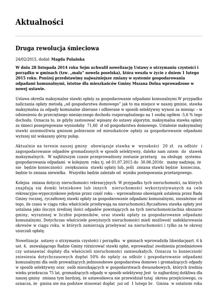 Aktualności Druga rewolucja śmieciowa 24/02/2015, dodał: Magda Polańska W dniu 28 listopada 2014 roku Sejm uchwalił nowelizację Ustawy o utrzymaniu czystości i porządku w gminach (tzw. „mała” nowela poselska), która weszła w życie z dniem 1 lutego 2015 roku. Poniżej przedstawimy najważniejsze zmiany w systemie gospodarowania odpadami komunalnymi, istotne dla mieszkańców Gminy Mszana Dolna wprowadzone w nowej ustawie. Ustawa określa maksymalne stawki opłaty za gospodarowanie odpadami komunalnymi.W przypadku naliczania opłaty metodą „od gospodarstwa domowego” jak to ma miejsce w naszej gminie, stawka maksymalna za odpady komunalne zbierane i odbierane w sposób selektywny wynosi za miesiąc – w odniesieniu do przeciętnego miesięcznego dochodu rozporządzalnego na 1 osobę ogółem -5,6 % tego dochodu. Oznacza to, że gdyby zastosować wpisany do ustawy algorytm, maksymalna stawka opłaty za śmieci posegregowane wyniosłaby 71,60 zł od gospodarstwa domowego. Ustalenie maksymalnej stawki uniemożliwia gminom pobieranie od mieszkańców opłaty za gospodarowanie odpadami wyższej niż wskazany górny pułap. Aktualnie na terenie naszej gminy obowiązuje stawka w wysokości 20 zł. za odbiór i zagospodarowanie odpadów gromadzonych w sposób selektywny, daleko nam zatem do stawek maksymalnych. W najbliższym czasie przeprowadzony zostanie przetarg na obsługę systemu gospodarowania odpadami w kolejnym roku tj. od 01.07.2015 do 30.06.2016r. mamy nadzieję, że nie będzie konieczności zwiększania stawki opłaty lub, jeśli zmiana stawki będzie konieczna, będzie to zmiana niewielka. Wszystko będzie zależało od wyniku postepowania przetargowego. Kolejna zmiana dotyczy nieruchomości rekreacyjnych. W przypadku tych nieruchomości, na których znajdują się domki letniskowe lub innych nieruchomości wykorzystywanych na cele rekreacyjno-wypoczynkowe jedynie przez część roku – wprowadzono obowiązek ustalenia przez Radę Gminy rocznej, ryczałtowej stawki opłaty za gospodarowanie odpadami komunalnymi, niezależnie od tego, ile czasu w ciągu roku właściciele przebywają na nieruchomości.Ryczałtowa stawka opłaty jest ustalana jako iloczyn średniej ilości odpadów powstających na tych nieruchomościachna obszarze gminy, wyrażonej w liczbie pojemników, oraz stawki opłaty za gospodarowanie odpadami komunalnymi. Dotychczas właściciele powyższych nieruchomości mieli możliwość zadeklarowania okresów w ciągu roku, w których zamierzają przebywać na nieruchomości i tylko za te okresy uiszczali opłatę. Nowelizacja ustawy o utrzymaniu czystości i porządku w gminach wprowadziła likwidacjęart. 6 k ust. 4, zezwalającego Radzie Gminy różnicować stawki opłat, wprowadzać zwolnienia przedmiotowe czy ustanawiać dopłaty dla właścicieli nieruchomości zamieszkałych. Oznacza to konieczność zniesienia dotychczasowych dopłat 50% do opłaty za odbiór i gospodarowanie odpadami komunalnymi dla osób prowadzących jednoosobowe gospodarstwa domowe i gromadzących odpady w sposób selektywny oraz osób mieszkających w gospodarstwach dwuosobowych, których średnia wieku przekracza 75 lat, gromadzących odpady w sposób selektywny.Jest to najbardziej dotkliwa dla naszej gminy zmiana tym bardziej, że ustawodawca nie przewidział tutaj okresu przejściowego, co oznacza, że gmina nie ma podstaw stosować dopłat już od 1 lutego br. Gmina w ostatnim roku wprowadziła dopiero dopłaty dla tych mieszkańców, którzy spełniają powyższe kryteria. Wydawało się to sprawiedliwe rozwiązanie, gdyż z pewnością osoby te wytwarzają mniej odpadów niż większe gospodarstwa. Niestety w nowym stanie prawnym gminy zostały pozbawione takich możliwości. Oznacza to, że ponownie Rada Gminy będzie musiała pochylić się nad tym problemem ustalając nowe stawki opłat, zaś osoby korzystające z dopłat zobligowane są do ponoszenia opłat w kwotach podstawowych tj. 20 zł/miesiąc. Zainteresowane osoby otrzymają stosowne informacje drogą pocztową. O wszelkich zmianach w gminnym systemie gospodarowania odpadami komunalnymi wynikających ze zmiany przepisów oraz wyniku przetargu, będziemy mieszkańców informować na bieżąco. Katarzyna Szybiak