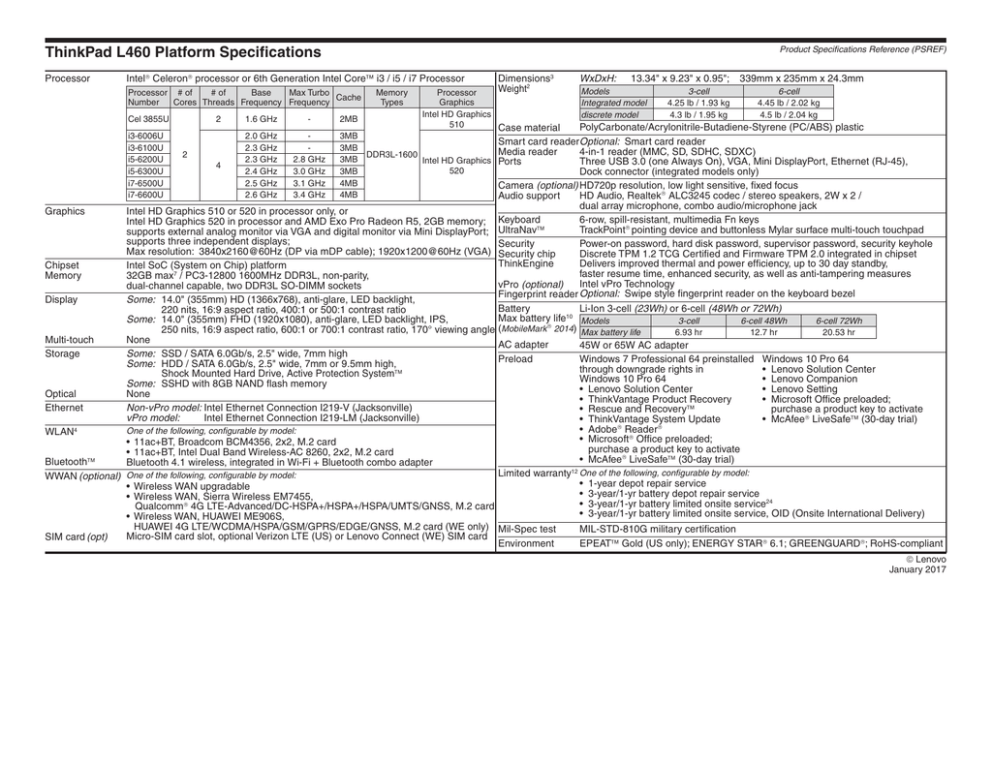 Product Specifications Reference (PSREF) ThinkPad L460 Platform Specifications Processor Intel® Celeron® processor or 6th Generation Intel Core™ i3 / i5 / i7 Processor Processor # of # of Base Max Turbo Cache Number Cores Threads Frequency Frequency Cel 3855U 2 1.6 GHz - 2.0 GHz 2.3 GHz 2.3 GHz 2.4 GHz 2.5 GHz 2.6 GHz 2.8 GHz 3.0 GHz 3.1 GHz 3.4 GHz 2MB Memory Types Dimensions3 Weight2 Processor Graphics Intel HD Graphics 510 Case material WxDxH: 13.34" x 9.23" x 0.95"; Models Integrated model discrete model 3-cell 4.25 lb / 1.93 kg 4.3 lb / 1.95 kg 339mm x 235mm x 24.3mm 6-cell 4.45 lb / 2.02 kg 4.5 lb / 2.04 kg PolyCarbonate/Acrylonitrile-Butadiene-Styrene (PC/ABS) plastic Smart card readerOptional: Smart card reader Media reader 4-in-1 reader (MMC, SD, SDHC, SDXC) 2 Ports Three USB 3.0 (one Always On), VGA, Mini DisplayPort, Ethernet (RJ-45), 4 Dock connector (integrated models only) Camera (optional) HD720p resolution, low light sensitive, fixed focus Audio support HD Audio, Realtek® ALC3245 codec / stereo speakers, 2W x 2 / dual array microphone, combo audio/microphone jack Graphics Intel HD Graphics 510 or 520 in processor only, or 6-row, spill-resistant, multimedia Fn keys Intel HD Graphics 520 in processor and AMD Exo Pro Radeon R5, 2GB memory; Keyboard TrackPoint® pointing device and buttonless Mylar surface multi-touch touchpad supports external analog monitor via VGA and digital monitor via Mini DisplayPort; UltraNav™ supports three independent displays; Security Power-on password, hard disk password, supervisor password, security keyhole Max resolution: 3840x2160@60Hz (DP via mDP cable); 1920x1200@60Hz (VGA) Security chip Discrete TPM 1.2 TCG Certified and Firmware TPM 2.0 integrated in chipset ThinkEngine Delivers improved thermal and power efficiency, up to 30 day standby, Chipset Intel SoC (System on Chip) platform faster resume time, enhanced security, as well as anti-tampering measures Memory 32GB max7 / PC3-12800 1600MHz DDR3L, non-parity, Intel vPro Technology vPro (optional) dual-channel capable, two DDR3L SO-DIMM sockets Fingerprint reader Optional: Swipe style fingerprint reader on the keyboard bezel Display Some: 14.0" (355mm) HD (1366x768), anti-glare, LED backlight, Battery Li-Ion 3-cell (23Wh) or 6-cell (48Wh or 72Wh) 220 nits, 16:9 aspect ratio, 400:1 or 500:1 contrast ratio Max battery life10 Models Some: 14.0" (355mm) FHD (1920x1080), anti-glare, LED backlight, IPS, 3-cell 6-cell 48Wh 6-cell 72Wh ® 250 nits, 16:9 aspect ratio, 600:1 or 700:1 contrast ratio, 170° viewing angle (MobileMark 2014) Max battery life 6.93 hr 12.7 hr 20.53 hr Multi-touch None AC adapter 45W or 65W AC adapter Storage Some: SSD / SATA 6.0Gb/s, 2.5" wide, 7mm high Preload Windows 7 Professional 64 preinstalled Windows 10 Pro 64 Some: HDD / SATA 6.0Gb/s, 2.5" wide, 7mm or 9.5mm high, through downgrade rights in • Lenovo Solution Center Shock Mounted Hard Drive, Active Protection System™ Windows 10 Pro 64 • Lenovo Companion Some: SSHD with 8GB NAND flash memory • Lenovo Solution Center • Lenovo Setting None Optical • ThinkVantage Product Recovery • Microsoft Office preloaded; Ethernet Non-vPro model: Intel Ethernet Connection I219-V (Jacksonville) • Rescue and Recovery™ purchase a product key to activate vPro model: Intel Ethernet Connection I219-LM (Jacksonville) • ThinkVantage System Update • McAfee® LiveSafe™ (30-day trial) ® ® • Adobe Reader One of the following, configurable by model: WLAN4 • Microsoft® Office preloaded; • 11ac+BT, Broadcom BCM4356, 2x2, M.2 card purchase a product key to activate • 11ac+BT, Intel Dual Band Wireless-AC 8260, 2x2, M.2 card • McAfee® LiveSafe™ (30-day trial) Bluetooth™ Bluetooth 4.1 wireless, integrated in Wi-Fi + Bluetooth combo adapter Limited warranty12 One of the following, configurable by model: WWAN (optional) One of the following, configurable by model: • 1-year depot repair service • Wireless WAN upgradable • 3-year/1-yr battery depot repair service • Wireless WAN, Sierra Wireless EM7455, • 3-year/1-yr battery limited onsite service24 Qualcomm® 4G LTE-Advanced/DC-HSPA+/HSPA+/HSPA/UMTS/GNSS, M.2 card • 3-year/1-yr battery limited onsite service, OID (Onsite International Delivery) • Wireless WAN, HUAWEI ME906S, HUAWEI 4G LTE/WCDMA/HSPA/GSM/GPRS/EDGE/GNSS, M.2 card (WE only) Mil-Spec test MIL-STD-810G military certification Micro-SIM card slot, optional Verizon LTE (US) or Lenovo Connect (WE) SIM card SIM card (opt) Environment EPEAT™ Gold (US only); ENERGY STAR® 6.1; GREENGUARD®; RoHS-compliant i3-6006U i3-6100U i5-6200U i5-6300U i7-6500U i7-6600U 3MB 3MB DDR3L-1600 3MB Intel HD Graphics 520 3MB 4MB 4MB © Lenovo January 2017