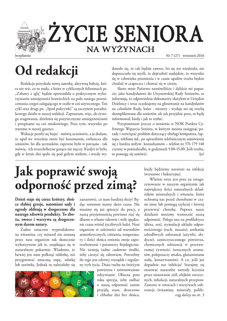 bezpłatnie Nr 7 (27) wrzesień 2016 Od redakcji Redakcja pozyskała nową autorkę, aktywną babcię, która nie wie, co to nuda, a która w cyklicznych felietonach pt. „Zabawy z igłą” będzie opowiadała o praktycznym wykorzystaniu umiejętności krawieckich na polu taniego przenicowania czegoś zalegającego w szafie w coś użytecznego. Ten cykl oraz drugi pn. „Spod pokrywki” są zaczynem poradnikowego działu w naszej redakcji. Zapraszam, więc, do żywego reagowania, dzielenia się pożytecznymi umiejętnościami i przepisami na coś smakowitego. Poza tym, wszystko po staremu w naszej gazetce. Wakacje poszły się bujać - mówią uczniowie, a ja dodam, że upał we wrześniu może być koszmarem, zwłaszcza dla seniorów, bo dla uczniaków, zapewne było w porząsiu - tak mówią - ich wszechobecne gorąco nie męczy. Kiedyż to było, gdy w letnie dni spało się pod gołym niebem, i wtedy wy- dawało się, że tak będzie zawsze, bo się nie wiedziało, nie dopuszczało się myśli, że dojrzałość nadejdzie, że wszystko się w człowieku pozmienia i w czasie upałów trzeba będzie chodzić w czapeczce i chować się w cieniu. Skoro mnie Państwo namówiliście i daliście mi poparcie, jako kandydatowi do Ursynowskiej Rady Seniorów, to informuję, że odpowiednie dokumenty złożyłem w Urzędzie Dzielnicy i teraz oczekujemy na głosowanie na kandydatów na członków Rady, które - niestety - wydaje mi się trochę skomplikowane dla seniorów, ale jak przyjdzie pora, to będę informował, kiedy i jak to zrobić. Przypominam jeszcze o istnieniu w NOK Punktu Cyfrowego Wsparcia Seniora, w którym można zasięgnąć porady i rozwiązać problem dotyczący obsługi komputera, laptopa, telefonu itd., po uprzednim telefonicznym umówieniu się z bardzo miłym konsultantem – telefon nr 576 179 148 czynny w poniedziałki, w godzinach 9.00-15.00. Jeśli trzeba, to pomogę się umówić. /jo/ Jak poprawić swoją odporność przed zimą? Dzień staje się coraz krótszy, słońce słabiej grzeje, natomiast sady i ogrody obfitują w drogocenne dla naszego zdrowia produkty. To zboża, owoce i warzywa są drogocennym darem natury. Żadna sztucznie wyprodukowana witamina, czy minerał nie zostaną przez nasz organizm tak skutecznie wykorzystane jak te, znajdujące się w naturalnym pokarmie. Wiadomo, że łatwiej jest nam połknąć tabletkę, niż przygotować smaczną zupę, sałatkę lub surówkę. Jednak tu należałoby się zastanowić, co nam bardziej służy? Będąc seniorem mamy dużo czasu. Nie musimy się już spieszyć do pracy, a naszą przyjemnością powinno stać się dbanie o własne zdrowie i miłe spędzanie czasu wśród życzliwych ludzi. Nasz organizm w zależności od warunków atmosferycznych, ciśnienia, temperatury i ilości słońca zmienia swoje zapotrzebowanie i parametry fizjologiczne. Nie istnieją żadne cudowne środki, żeby cieszyć się zdrowiem. Potrzebny do tego jest zdrowy rozsądek i regularny tryb życia. Dużo ruchu na świeżym powietrzu i zrównoważone odżywianie. Obecna pora roku sprzyja, żeby zadbać o naszą odporność zanim przyjdą szare, deszczowe i chłodne dni bez słońca, kiedy będziemy narażeni na infekcje (wirusowe i bakteryjne). Właśnie teraz jest pora na zmagazynowanie w naszym organizmie jak największej ilości naturalnych składników mineralnych i witamin, które ochronią nas przed chorobami w czasie zimy lub pomogą szybciej i łatwiej przetrwać chorobę. Poprzez nasze działanie możemy wzmocnić naszą odporność. Polega ona na profilaktyce (dieta, sen), stymulacji układu odpornościowego (ruch, masaże), unikaniu szkodliwych substancji (używki, słodycze), zanieczyszczonego powietrza, chemicznych substancji w przetworzonej żywności (sztucznych aromatów, polepszaczy smaku, glutaminianu sodu, konserwantów). A co, jeśli już dopadnie nas infekcja? Starajmy się stosować naturalne metody leczenia przez stosowanie ziół, olejków eterycznych, inhalacji, naturalnych przypraw. Zawarte w owocach i warzywach substancje (witaminy, minerały, polifeciąg dalszy na str. 3 Felieton trochę nie wiadomo o czym Lato jest cudowne zawsze, wszędzie i pod każdym względem. Przede wszystkim w lecie jest ciepło, a nawet jak jest chłodno, to nie jest zimno. No, chyba, żeby się jakaś anomalia pogodowa przytrafiła… Ale dlaczego miałaby się przytrafiać? W lecie jest kolorowo. W lecie wszystko dojrzewa i rozkwita. Jest pięknie. Lato to czas wakacji. Dla nas, mieszczuchów nie ma to jak wakacje! Na przykład moje tegoroczne w Nałęczowie oczywiście, bo gdzieżby? Wydawało mi się, że po tylu pobytach wszystko już widziałam, wszędzie każbyłam, dą dróżkę przedeptałam. Tak mi się właśnie wydawało, a tu, proszę – niespodzianka. Skręciłam w uliczkę, którą zawsze, nie wiadomo czemu, omijałam i odkryłam przepiękne miejsce. Uliczka , a właściwie droga prowadząca przez coś w rodzaju lasu czy raczej podmokłe zarośla zawiodła mnie nad stawy. Potem się dowiedziałam, że kiedyś były to stawy hodowlane, a teraz to jest miejsce dla wędkarzy oraz osób, które tak jak ja, lubią posiedzieć w ciszy i pozachwycać się pięknem natury i mieć święty spokój. Chyba właśnie ze względu na ten święty spokój tak lubię Nałęczów. Nad stawem jest porządny, duży pomost dla wędkarzy, wiata, a pod nią stół i ławki, miejsce na ognisko – kultura pełna. Siedzisz sobie człowieku, słonko grzeje i opala, a tu witamina D3 ci się w organizmie syntetyzuje oddalając widmo 2 • ŻYCIE SENIORA osteoporozy, wietrzyk leciutki wieje, pachnie woda, wilgotna ziemia i tylko od czasu do czasu ryba wyskoczy, owada chwyci i tylko kręgi się po wodzie rozchodzą… I tak patrzysz, człowieku, na te rozchodzące się kręgi i myśli różne ci do głowy przychodzą, i refleksje snujesz, niektóre całkiem nawet dorzeczne i niegłupie. Albo i nie snujesz, boś rozleniwiony w tym słonec