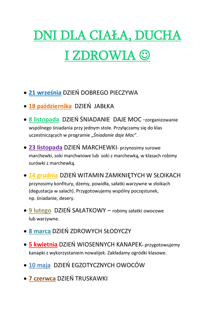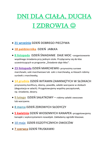 DNI DLA CIAŁA, DUCHA I ZDROWIA 21 września DZIEŃ DOBREGO PIECZYWA 18 października DZIEŃ JABŁKA 8 listopada DZIEŃ ŚNIADANIE DAJE MOC -zorganizowanie wspólnego śniadania przy jednym stole. Przyłączamy się do klas uczestniczących w programie „Śniadanie daje Moc”. 23 listopada DZIEŃ MARCHEWKI- przynosimy surowe marchewki, soki marchwiowe lub soki z marchewką, w klasach robimy surówki z marchewką. 14 grudnia DZIEŃ WITAMIN ZAMKNIĘTYCH W SŁOIKACH przynosimy konfitury, dżemy, powidła, sałatki warzywne w słoikach (degustacja w salach). Przygotowujemy wspólny poczęstunek, np. śniadanie, desery. 9 lutego DZIEŃ SAŁATKOWY – robimy sałatki owocowe lub warzywne. 8 marca DZIEŃ ZDROWYCH SŁODYCZY 5 kwietnia DZIEŃ WIOSENNYCH KANAPEK- przygotowujemy kanapki z wykorzystaniem nowalijek. Zakładamy ogródki klasowe. 10 maja DZIEŃ EGZOTYCZNYCH OWOCÓW 7 czerwca DZIEŃ TRUSKAWKI