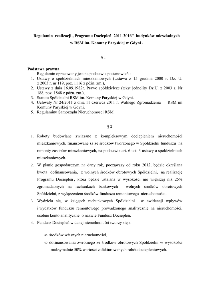 Regulamin realizacji „Programu Dociepleń 2011-2016” budynków mieszkalnych w RSM im. Komuny Paryskiej w Gdyni . §1 Podstawa prawna Regulamin opracowany jest na podstawie postanowień : 1. Ustawy o spółdzielniach mieszkaniowych (Ustawa z 15 grudnia 2000 r. Dz. U. z 2003 r. nr 119, poz. 1116 z późn. zm.), 2. Ustawy z dnia 16.09.1982r. Prawo spółdzielcze (tekst jednolity Dz.U. z 2003 r. Nr 188, poz. 1848 z późn. zm.), 3. Statutu Spółdzielni RSM im. Komuny Paryskiej w Gdyni. 4. Uchwały Nr 24/2011 z dnia 11 czerwca 2011 r. Walnego Zgromadzenia RSM im Komuny Paryskiej w Gdyni. 5. Regulaminu Samorządu Nieruchomości RSM. §2 1. Roboty budowlane związane z kompleksowym dociepleniem nieruchomości mieszkaniowych, finansowane są ze środków tworzonego w Spółdzielni funduszu na remonty zasobów mieszkaniowych, na podstawie art. 6 ust. 3 ustawy o spółdzielniach mieszkaniowych. 2. W planie gospodarczym na dany rok, począwszy od roku 2012, będzie określana kwota dofinansowania, z wolnych środków obrotowych Spółdzielni, na realizację Programu Dociepleń , która będzie ustalana w wysokości nie większej niż 25% zgromadzonych na rachunkach bankowych wolnych środków obrotowych Spółdzielni, z wyłączeniem środków funduszu remontowego nieruchomości. 3. Wydziela się, w księgach rachunkowych Spółdzielni w ewidencji wpływów i wydatków funduszu remontowego prowadzonego analitycznie na nieruchomości, osobne konto analityczne o nazwie Fundusz Dociepleń. 4. Fundusz Dociepleń w danej nieruchomości tworzy się z: • środków własnych nieruchomości, • dofinansowania zwrotnego ze środków obrotowych Spółdzielni w wysokości maksymalnie 50% wartości zafakturowanych robót dociepleniowych. 5. Obowiązek świadczenia na Fundusz Dociepleń, na pokrycie kosztów związanych z dociepleniem budynku, mają wszyscy uprawnieni do lokalu znajdującego się w danej nieruchomości. Rada Nadzorcza na wniosek Samorządu Nieruchomości podejmuje uchwałę o wysokości opłat na fundusz remontowy, z przeznaczeniem na Fundusz Dociepleń, który stanowi podstawę ewidencji kosztów remontowych. §3 1. Zarząd Spółdzielni podejmie decyzje o dofinansowaniu zwrotnym z wolnych środków obrotowych Spółdzielni po spełnieniu przez nieruchomość następujących warunków: • zgromadzenia minimum 50% wartości planowanych robót dociepleniowych ścian budynku, stropodachu wyszczególnionej w przewidywanym kosztorysie wykonawczym (dopuszcza się docieplenie częściowe ścian), • złożenia wniosku Samorządu Nieruchomości lub Rad Osiedli, zawierającego zgodę większości mieszkańców danej nieruchomości, zgodnie z § 8 ust 3 regulaminu Samorządu Nieruchomości, wg załącznika nr 1 do niniejszego regulaminu. • wysokość stawki na fundusz remontowy winna zapewnić spłatę dofinansowania zwrotnego w okresie nieprzekraczającym 48 miesięcy. 2. Uważa się, że mieszkańcy wyrażają zgodę na docieplenie nieruchomości, jeżeli wszyscy właściciele lokali w danej nieruchomości wyrażą zgodę na jej docieplenie, z tym zastrzeżeniem, że w przypadku kilku współuprawnionych do danego lokalu przysługuje im prawo do oddania tylko jednego głosu za wszystkich współuprawnionych do lokalu w danej nieruchomości, §4 1. Koszty robót związanych z dociepleniem budynku pokrywane będą ze środków własnych danej nieruchomości, i ze środków obrotowych dofinansowania zwrotnego w wysokości nie większej spółdzielni w formie niż 50% wartości zrealizowanych i zafakturowanych robót dociepleniowych. 2. Spółdzielnia w celu realizacji robót dociepleniowych w danej nieruchomości uruchomi wewnętrzne źródła finansowania w postaci wolnych środków obrotowych. Uprawnieni do lokali w remontowanej nieruchomości są zobowiązani dokonać spłat dofinansowania zwrotnego w okresie nieprzekraczającym 48 miesięcy tj. zgodnie z Uchwałą Nr 24/2011 Walnego Zgromadzenia. §5 1. Koszty docieplenia danego budynku ustala się dwuetapowo: - wstępnie – przed rozpoczęciem prac, na podstawie szacunkowego kosztu wykonania, - ostatecznie – po zakończeniu realizacji robót i rozliczeniu z wykonawcą. 2. Jednostką rozliczeniową kosztów kompleksowego ocieplenia danego budynku jest 1 m2 powierzchni użytkowej wszystkich samodzielnych lokali znajdujących się w nieruchomości. §6 Ustala się dwa sposoby wyliczenia kwoty dofinansowania zwrotnego poprzez jego oprocentowanie lub dyskontowanie. 1. Oprocentowanie 1)Dofinansowanie zwrotne, o którym mowa w paragrafach poprzedzających, podlega zwrotowi wraz z oprocentowaniem. Oznacza to, że podlegająca zwrotowi kwota dofinansowania robót dociepleniowych danej nieruchomości, zostanie powiększona o wartość średniego oprocentowania uzyskanego z lokat wolnych środków obrotowych Spółdzielni. Oprocentowanie to będzie ustalone na dzień uruchomienia środków, tj. zapłaty za wykonaną usługę. 2)Kwoty wynikające z wyliczenia oprocentowania będą zaewidencjonowane w księgach rachunkowych spółdzielni na osobnym koncie i będą rozliczane kwartalnie zwiększając odpowiednio fundusz remontowy nieruchomości. 3)Wielkość ustalonego oprocentowania dofinansowania zwrotnego będzie potrącona w pierwszej kolejności z konta Funduszu Dociepleń danej nieruchomości. 4)Jednostką rozliczeniową kosztów oprocentowania dofinansowania zwrotnego jest 1m2 powierzchni użytkowej wszystkich samodzielnych lokali znajdujących się w budynku. 2. Dyskontowanie 1)Dofinansowanie zwrotne, o którym mowa w paragrafach poprzedzających, podlega dyskontowaniu. Oznacza to, że podlegająca zwrotowi kwota dofinansowania będzie miała po okresie spłaty, taką sama wartość nabywczą jak w momencie udzielenia dofinansowania . Będzie stosowana następująca metoda dyskontowania środków: Wartość przyszła (urealniona) = dofinansowanie pomnożone przez (1+ ilość okresów spłaty razy % stopy dyskonta* ) *Stopa procentowa dyskont