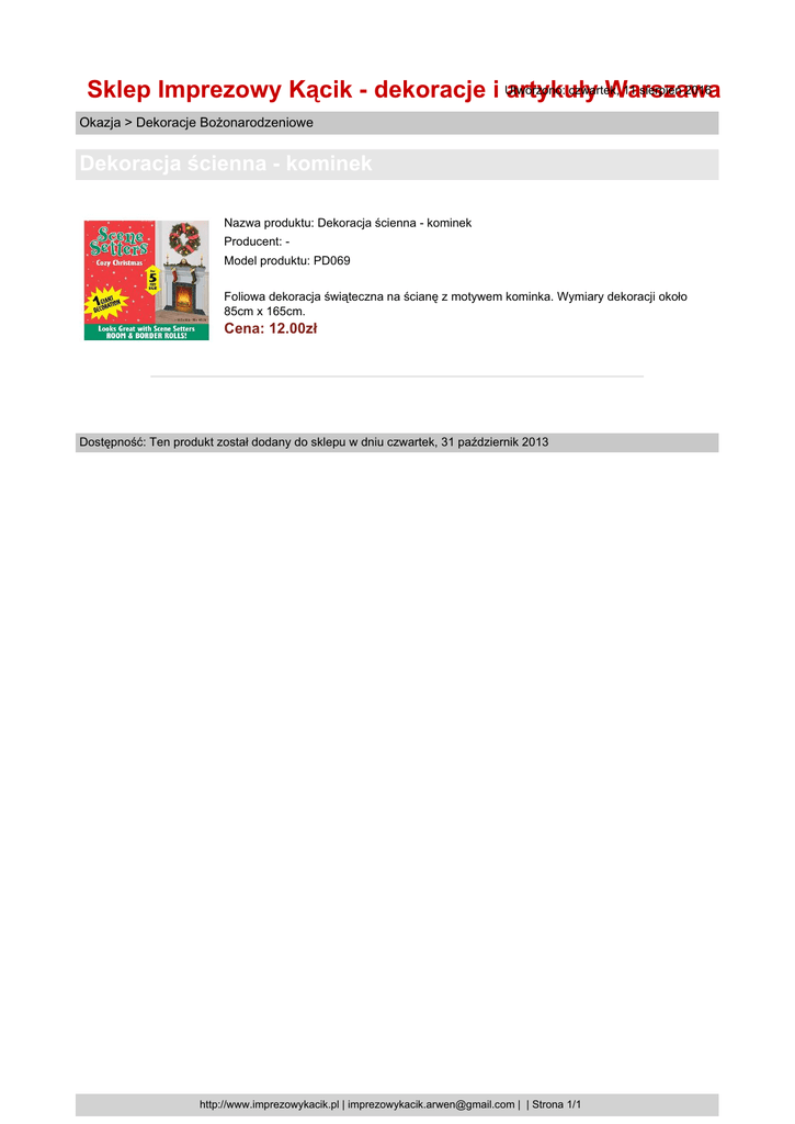 czwartek, 11 sierpień 2016 Sklep Imprezowy Kącik - dekoracje i Utworzono: artykuły Warszawa Okazja > Dekoracje Bożonarodzeniowe Dekoracja ścienna - kominek Nazwa produktu: Dekoracja ścienna - kominek Producent: Model produktu: PD069 Foliowa dekoracja świąteczna na ścianę z motywem kominka. Wymiary dekoracji około 85cm x 165cm. Cena: 12.00zł Dostępność: Ten produkt został dodany do sklepu w dniu czwartek, 31 październik 2013 http://www.imprezowykacik.pl | [email protected] | | Strona 1/1