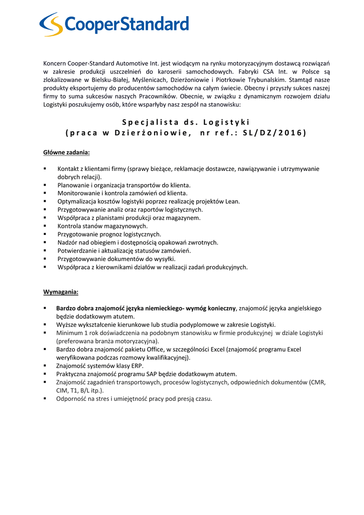 Koncern Cooper-Standard Automotive Int. jest wiodącym na rynku motoryzacyjnym dostawcą rozwiązań w zakresie produkcji uszczelnień do karoserii samochodowych. Fabryki CSA Int. w Polsce są zlokalizowane w Bielsku-Białej, Myślenicach, Dzierżoniowie i Piotrkowie Trybunalskim. Stamtąd nasze produkty eksportujemy do producentów samochodów na całym świecie. Obecny i przyszły sukces naszej firmy to suma sukcesów naszych Pracowników. Obecnie, w związku z dynamicznym rozwojem działu Logistyki poszukujemy osób, które wsparłyby nasz zespół na stanowisku: Specjalista ds. Logistyki (praca w Dzierżoniowie, nr ref.: SL/DZ/2016) Główne zadania: Kontakt z klientami firmy (sprawy bieżące, reklamacje dostawcze, nawiązywanie i utrzymywanie dobrych relacji). Planowanie i organizacja transportów do klienta. Monitorowanie i kontrola zamówień od klienta. Optymalizacja kosztów logistyki poprzez realizację projektów Lean. Przygotowywanie analiz oraz raportów logistycznych. Współpraca z planistami produkcji oraz magazynem. Kontrola stanów magazynowych. Przygotowanie prognoz logistycznych. Nadzór nad obiegiem i dostępnością opakowań zwrotnych. Potwierdzanie i aktualizację statusów zamówień. Przygotowywanie dokumentów do wysyłki. Współpraca z kierownikami działów w realizacji zadań produkcyjnych. Wymagania: Bardzo dobra znajomość języka niemieckiego- wymóg konieczny, znajomość języka angielskiego będzie dodatkowym atutem. Wyższe wykształcenie kierunkowe lub studia podyplomowe w zakresie Logistyki. Minimum 1 rok doświadczenia na podobnym stanowisku w firmie produkcyjnej w dziale Logistyki (preferowana branża motoryzacyjna). Bardzo dobra znajomość pakietu Office, w szczególności Excel (znajomość programu Excel weryfikowana podczas rozmowy kwalifikacyjnej). Znajomość systemów klasy ERP. Praktyczna znajomość programu SAP będzie dodatkowym atutem. Znajomość zagadnień transportowych, procesów logistycznych, odpowiednich dokumentów (CMR, CIM, T1, B/L itp.). Odporność na stres i umiejętność pracy pod presją czasu. Ponadto od kandydatów oczekujemy: Umiejętności pracy w zespole, determinacji w dążeniu do realizacji wyznaczonych celów, systematyczności, dyspozycyjności, samodzielności oraz zaangażowania w wykonywaną pracę. Oferujemy: Profesjonalny rozwój w dziale Logistyki. Możliwość rozwijania swoich umiejętności poprzez szkolenia oraz wynagrodzenie adekwatne do posiadanej wiedzy i kompetencji. Ciekawą pracę w nowoczesnym i dynamicznie rozwijającym się koncernie produkcyjnym, o ugruntowanej pozycji na rynku. Dodatkowo oferujemy: możliwość podniesienia swoich kwalifikacji i realizacji własnych pomysłów pakiet Multisport dofinansowany pakiet medyczny udział w imprezach integracyjnych o charakterze sportowym. Zainteresowanych prosimy o przesłanie CV i list motywacyjnego na adres e-mail (prosimy o podanie w temacie nr ref.): [email protected] Z dopiskiem: Specjalista ds. Logistyki (SL/DZ/2016) Informujemy, że skontaktujemy się z wybranymi osobami. Prosimy o dopisanie klauzuli o ochronie danych osobowych: Wyrażam zgodę na przetwarzanie moich danych osobowych zawartych w mojej ofercie pracy dla potrzeb niezbędnych do realizacji procesu tej rekrutacji i następnych (zgodnie z ustawą z dn. 29.08.97 roku o Ochronie Danych Osobowych Dz. Ust Nr 133 poz. 883.Informujemy, że skontaktujemy się z wybranymi osobami. Prosimy o dopisanie klauzuli o ochronie danych osobowych.