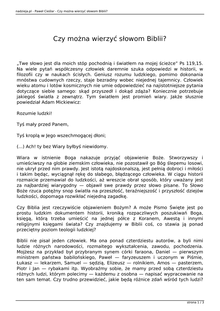 nadzieja.pl - Paweł Cieślar - Czy można wierzyć słowom Biblii? Czy można wierzyć słowom Biblii? „Twe słowo jest dla moich stóp pochodnią i światłem na mojej ścieżce” Ps 119,15. Na wiele pytań współczesny człowiek daremnie szuka odpowiedzi w historii, w filozofii czy w naukach ścisłych. Geniusz rozumu ludzkiego, pomimo dokonania mnóstwa cudownych rzeczy, staje bezradny wobec niejednej tajemnicy. Człowiek wieku atomu i lotów kosmicznych nie umie odpowiedzieć na najistotniejsze pytania dotyczące siebie samego: skąd przyszedł i dokąd zdąża? Koniecznie potrzebuje jakiegoś światła z zewnątrz. Tym światłem jest promień wiary. Jakże słusznie powiedział Adam Mickiewicz: Rozumie ludzki! Tyś mały przed Panem, Tyś kroplą w Jego wszechmogącej dłoni; (...) Ach! ty bez Wiary byłbyś niewidomy. Wiara w istnienie Boga nakazuje przyjąć objawienie Boże. Stworzywszy i umieściwszy na globie ziemskim człowieka, nie pozostawił go Bóg ślepemu losowi, nie ukrył przed nim prawdy. Jest istotą najdoskonalszą, jest pełnią dobroci i miłości i takim będąc, wyciągnął rękę do słabego, błądzącego człowieka. W ciągu historii rozmaicie przemawiał do ludzkości, aż wreszcie obrał sposób, który uważany jest za najbardziej wiarygodny — objawił swe prawdy przez słowo pisane. To Słowo Boże rzuca potężny snop światła na przeszłość, teraźniejszość i przyszłość dziejów ludzkości, dopomaga rozwikłać niejedną zagadkę. Czy Biblia jest rzeczywiście objawieniem Bożym? A może Pismo Święte jest po prostu ludzkim dokumentem historii, kroniką rozpaczliwych poszukiwań Boga, księgą, którą trzeba umieścić na jednej półce z Koranem, Awestą i innymi religijnymi księgami świata? Czy znajdujemy w Biblii coś, co stawia ją ponad przeciętny poziom teologii ludzkiej? Biblii nie pisał jeden człowiek. Ma ona ponad czterdziestu autorów, a byli nimi ludzie różnych narodowości, rozmaitego wykształcenia, zawodu, pochodzenia. Mojżesz na przykład był przybranym synem córki faraona, Daniel — pierwszym ministrem państwa babilońskiego, Paweł — faryzeuszem i uczonym w Piśmie, Łukasz — lekarzem, Samuel — sędzią, Elizeusz — rolnikiem, Amos — pasterzem, Piotr i Jan — rybakami itp. Wyobraźmy sobie, że mamy przed sobą czterdziestu różnych ludzi, którym polecimy — każdemu z osobna — napisać wypracowanie na ten sam temat. Czy trudno przewidzieć, jakie będą różnice zdań wśród tych ludzi? strona 1 / 3 nadzieja.pl - Paweł Cieślar - Czy można wierzyć słowom Biblii? Albo uczyńmy jeszcze inaczej. Zadajmy czterdziestu teologom jedno z pytań: W jaki sposób Chrystus powtórnie przyjdzie na ziemię? Co cechuje prawdziwy Kościół? Czy należy chrzcić niemowlęta? Czy można człowieka tytułować ojcem świętym? Czy biblijny Dekalog nadal obowiązuje wszystkich ludzi? Można przypuszczać, że zdania teologów byłyby podzielone, poglądy na daną kwestię różne i być może byłoby tyle opinii, ilu teologów. A jak jest z autorami biblijnymi? Na pytanie: „Kto powołał świat do istnienia?” najstarszy pisarz Biblii, Mojżesz, odpowiada: „Na początku stworzył Bóg niebo i ziemię” Rdz 1,1. Odpowiedź żyjącego wiele lat później króla Dawida brzmi: „Przez słowo Pana powstały niebiosa i wszystkie ich zastępy przez tchnienie ust Jego. Bo sam powiedział, a wszystko powstało; On sam nakazał, a zaczęły istnieć” Ps 33,6.9. Tę samą myśl zgodnie podtrzymuje apostoł Paweł: „W Nim zostało wszystko stworzone: i to, co w niebiosach, i to, co na ziemi, byty widzialne i niewidzialne” Kol 1,16. Przykładów jednomyślności autorów biblijnych można przytoczyć bardzo wiele, ale nie jest to w tym miejscu konieczne: każdy może wziąć Biblię do ręki i sam się o tym przekonać. Warto się zastanowić, co jest przyczyną tej jednomyślności. Co powoduje, że król i pasterz, lekarz i rolnik, minister i tkacz, podczaszy i rybak, żyjący w różnych miejscowościach i w różnych czasach, są ze sobą całkowicie zgodni? Popatrzmy przez moment na Biblię jak na niezwykłą księgę proroczą. Prorok Izajasz przepowiedział o Babilonie, że będzie zniszczony i nigdy więcej nie podniesie się z gruzów: „Wtedy Babilon, perła królestw, klejnot, duma Chaldejczyków, stanie się Sodomą i Gomorą, gdy je Bóg wywrócił. Nie będzie nigdy więcej zamieszkany ani zaludniony z pokolenia w pokolenie. Nie rozbije tam Arab namiotu ani pasterze nie staną na postój. Dziki zwierz tam mieć będzie swe leże, sowy napełnią ich domy...” Iz 13,19-22. Na kartach księgi Sofoniasza znajdujemy podobną przepowiednię o Niniwie: „I wyciągnie swą rękę na północ, i zniszczy Asyrię, i obróci Niniwę w pustynię, w suchy step, jak pustynię. I będą się wylegiwać w obrębie jej stada, wszelkie zwierzęta narodów: tak pelikan jak jeż zanocują na głowicach jej kolumn. Głos zaświszcze w otworze okna, a na progu [zalegnie] rumowisko, bo cedrowe obicie zostanie zerwane. Oto huczne miasto, które bezpiecznie mieszkało, które mówiło w sercu swym: «Ja, i nic więcej!» Jakże stało się pustkowiem, legowiskiem dzikich zwierząt? Każdy, kto mimo niej przechodzić będzie, syknie i ręką potrząśnie” So 2,13-15. Oba wspomniane tu miasta były ongiś wielkimi ośrodkami kultury, miały wielkie znaczenie polityczne. Znane były ich bogactwa, ogromne budowle, świątynie, mury obronne. Dziś trudno nawet odszukać ich ruin, choć okoliczne państwa przetrwały do naszych czasów. Prorok Daniel wyraźnie przepowiedział powstanie i upadek wielkich królestw świata, jak Babilonia, Medo-Persja, Grecja, Rzym, przepowiedział również powstanie po upadku Rzymu wielu nowych państw europejskich. Biblia przewidziała wiele innych zdarzeń, które z idealną dokładnością się wypełniły. Kto dał tę wiedzę i mądrość piszącym księgi święte? strona 2 /