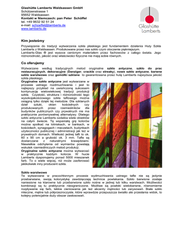 Glashütte Lamberts Waldsassen GmbH Schützenstrasse 1 95652 Waldsassen Kontakt w Niemczech: pan Peter Schöffel tel. +49 9632 92 51 24 e-mail: [email protected] www.lamberts.de Kim jesteśmy Przywiązanie do tradycji wytwarzania szkła płaskiego jest fundamentem działania Huty Szkła Lamberts z Waldsassen. Produkowane przez nas szkło czyni otoczenie piękniejszym. Lamberts-Glas ® jest wysoce cenionym materiałem przez fachowców z całego świata. Jego różnorodność, jakość oraz właściwości fizyczne nie mają sobie równych. Co oferujemy Wytwarzane według tradycyjnych metod oryginalne szkło antyczne, szkło do prac restauracyjnych, dekoracyjne (Danziger, crackle oraz streaky), nowe szkło antyczne, barwne szkło warstwowe oraz gomółki szklane to gwarantowana przez hutę Lamberts najwyższa jakość szkła płaskiego. Oryginalne szkło antyczne jest wytwarzane w procesie ustnego rozdmuchiwania i jest to najlepszy przykład na uwieńczoną sukcesem kontynuację wielowiekowej tradycji produkcji szkła. Czystość, struktura i różnorodność tego wysokojakościowego szkła taflowego można osiągną tylko dzięki tej metodzie. Dla szklanych dzieł sztuki, okien kościelnych czy produkowanych przez rzemieślników dla budynków publicznych czy prywatnych nie ma praktycznie porównywalnej alternatywy. Dlatego szkło antyczne Lamberts ozdabia wiele obiektów na całym świecie. Tę wspaniałą grę kolorów można spotkać na lotniskach, w bankach, w kościołach, synagogach i meczetach, budynkach użyteczności publicznej i administracji jak też w prywatnych domach. Wielkość jednej tafli to ok. 60 x 90 cm a grubość ok. 3 mm. Tafle są dostarczane z naturalnymi krawędziami. Niewielkie odchylenia od wymiarów powstają wskutek rzemieślniczych metod produkcji. Oryginalne szkło antyczne można wytwarzać w praktycznie każdym kolorze. W hucie Lamberts dysponujemy ponad 5000 mieszanek farb. To o wiele więcej, niż może zaoferować jakikolwiek inny producent szkła. Szkło warstwowe Te wytwarzane w pracochłonnym procesie wydmuchiwania ustnego tafle nie są jedynie przebarwiane, swoją kolorystykę zawdzięczają technice powlekania. Szkło barwione zostaje naniesione na klarowne lub przebarwione szkło nośne w jednej lub kilku warstwach. Możliwości kombinacji są tu praktycznie nieograniczone. Możliwe są powłoki wielobarwne, równomierne rozpływanie się farb, lekkie cieniowania jak też akcenty mętności lub zarysowań. Białe szkło mleczne, mętne lub półprzezroczyste, które wprawdzie przepuszcza światło ale przesłania widok, to kolejny potencjalnie duży obszar zastosowań. Huta Lamberts, jako ostatnia manufaktura tego rodzaju w Niemczech, produkuje tradycyjnymi metodami autentyczne szkło okienne stosowane w restauracji historycznych okien i mebli, gdzie wymagana jest szczególna dbałość o detale. Produkcja LambertsGlas restauro ® to tradycyjne rękodzieło związane z pracochłonnymi procesami, tak jak to było przed wieloma setkami lat. Szklarze formują za pomocą piszczeli żarzącą się masę ciągliwego szkła w cylindry, które zostają rozciągnięte i przeformowane w tafle. Każda pojedyncza tafla podlega kontroli jakości i dopiero wtedy zostaje wysłana do zamawiającego. Szkło ozdobne Danziger-Glas Danziger-Glas to szkło wydmuchiwane ustnie, będące specjalną formą LambertsGlas®, ze wspaniałą strukturą nici i smug, powodującą wrażenie ruchu w szkle. Typową strukturę tego szkła osiąga się dzięki dodaniu do płynnej masy jeszcze w piecu, krótko przed wyciągnięciem porcji szkła, specjalnej niestopionej stłuczki. Dalszy proces produkcji przebiega podobnie jak w przypadku szkła antycznego. Streaky-Glas - każda tafla szkła to osobne rękodzieło. Oryginalne szkło streaky odzwierciedla wielowiekową sztukę wytwarzania. Tradycyjne rękodzieło czyni każdą taflę dziełem sztuki z własnym charakterem – nie ma dwóch takich samych! Błyszczące kolory o niepowtarzalnej czystości nadają szkłu nieporównywalną z niczym aurę. Więcej o naszym przedsiębiorstwie, oferowanych produktach oraz informacje techniczne znajdą Państwo na stronie www.lamberts.de. Prosimy o zwrócenie uwagi na listę referencyjną z setkami już zrealizowanych projektów ze szkłem LambertsGlas ®. Kogo poszukujemy W Polsce poszukujemy przede wszystkim kontaktów z potencjalnymi klientami. Są to warsztaty oraz studia szklarskie jak też zakłady zajmujące się pracami restauracyjnymi. Jesteśmy też zainteresowani współpracą z firmami handlowymi, oferującymi wysokiej jakości szkło. Ważnymi dla nas partnerami są także instytucje zajmujące się ochroną zabytków oraz przedstawiciele zajmującymi się budową / konserwacją kościołów w diecezjach.