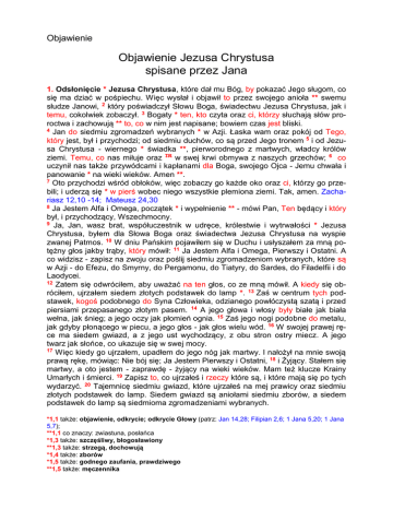 Objawienie Objawienie Jezusa Chrystusa spisane przez Jana 1. Odsłonięcie * Jezusa Chrystusa, które dał mu Bóg, by pokazać Jego sługom, co się ma dziać w pośpiechu. Więc wysłał i objawił to przez swojego anioła ** swemu słudze Janowi, 2 który poświadczył Słowu Boga, świadectwu Jezusa Chrystusa, jak i temu, cokolwiek zobaczył. 3 Bogaty * ten, kto czyta oraz ci, którzy słuchają słów proroctwa i zachowują ** to, co w nim jest napisane; bowiem czas jest bliski. 4 Jan do siedmiu zgromadzeń wybranych * w Azji. Łaska wam oraz pokój od Tego, który jest, był i przychodzi; od siedmiu duchów, co są przed Jego tronem 5 i od Jezusa Chrystusa - wiernego * świadka **, pierworodnego z martwych, władcy królów ziemi. Temu, co nas miłuje oraz TR w swej krwi obmywa z naszych grzechów; 6 co uczynił nas także przywódcami i kapłanami dla Boga, swojego Ojca - Jemu chwała i panowanie * na wieki wieków. Amen **. 7 Oto przychodzi wśród obłoków, więc zobaczy go każde oko oraz ci, którzy go przebili; i uderzą się * w pierś wobec niego wszystkie plemiona ziemi. Tak, amen. Zachariasz 12,10 -14; Mateusz 24,30 8 Ja Jestem Alfa i Omega, początek * i wypełnienie ** - mówi Pan, Ten będący i który był, i przychodzący, Wszechmocny. 9 Ja, Jan, wasz brat, współuczestnik w udręce, królestwie i wytrwałości * Jezusa Chrystusa, byłem dla Słowa Boga oraz świadectwa Jezusa Chrystusa na wyspie zwanej Patmos. 10 W dniu Pańskim pojawiłem się w Duchu i usłyszałem za mną potężny głos jakby trąby, który mówił: 11 Ja Jestem Alfa i Omega, Pierwszy i Ostatni. A co widzisz - zapisz na zwoju oraz poślij siedmiu zgromadzeniom wybranych, które są w Azji - do Efezu, do Smyrny, do Pergamonu, do Tiatyry, do Sardes, do Filadelfii i do Laodycei. 12 Zatem się odwróciłem, aby uważać na ten głos, co ze mną mówił. A kiedy się obróciłem, ujrzałem siedem złotych podstawek do lamp *. 13 Zaś w centrum tych podstawek, kogoś podobnego do Syna Człowieka, odzianego powłóczystą szatą i przed piersiami przepasanego złotym pasem. 14 A jego głowa i włosy były białe jak biała wełna, jak śnieg; a jego oczy jak płomień ognia. 15 Zaś jego nogi podobne do metalu, jak gdyby płonącego w piecu, a jego głos - jak głos wielu wód. 16 W swojej prawej ręce ma siedem gwiazd, a z jego ust wychodzący, z obu stron ostry miecz. A jego twarz jak słońce, co ukazuje się w swej mocy. 17 Więc kiedy go ujrzałem, upadłem do jego nóg jak martwy. I nałożył na mnie swoją prawą rękę, mówiąc: Nie bój się; Ja Jestem Pierwszy i Ostatni, 18 i Żyjący. Stałem się martwy, a oto jestem - zaprawdę - żyjący na wieki wieków. Mam też klucze Krainy Umarłych i śmierci. 19 Zapisz to, co ujrzałeś i rzeczy które są, i które mają się po tych wydarzyć. 20 Tajemnicę siedmiu gwiazd, które ujrzałeś na mej prawicy oraz siedmiu złotych podstawek do lamp. Siedem gwiazd są aniołami siedmiu zborów, a siedem podstawek do lamp są siedmioma zgromadzeniami wybranych. *1,1 także: objawienie, odkrycie; odkrycie Głowy (patrz: Jan 14,28; Filipian 2,6; 1 Jana 5,20; 1 Jana 5,7); **1,1 co znaczy: zwiastuna, posłańca *1,3 także: szczęśliwy, błogosławiony **1,3 także: strzegą, dochowują *1,4 także: zborów *1,5 także: godnego zaufania, prawdziwego **1,5 także: męczennika *1,6 także: władza, potęga **1,6 co znaczy: zaprawdę *1,7 domyślnie: w skrusze, rozpaczy *1,8 także: pierwsza zasada **1,8 także: następstwo *1,9 także: osamotnieniu *1,12 chodzi o lampy oliwne; także: świeczników 2. Aniołowi efeskiego zgromadzenia wybranych napisz: To mówi ten, co trzyma w swojej prawicy siedem gwiazd i przechadza się w centrum siedmiu złotych podstawek do lamp. 2 Znam twoje czyny, cierpienie * i twą wytrwałość **; że nie możesz znieść *** bezwartościowych **** oraz wypróbowałeś tych, co nazywają siebie apostołami - a nimi nie są, i znalazłeś ich kłamliwymi *****. 3 A wytrzymałeś i masz cierpliwość; ciężko też pracowałeś z powodu mego Imienia oraz się nie zmęczyłeś. 4 Ale mam przeciwko * tobie, że zaniedbałeś twą pierwszą miłość. 5 Zatem pamiętaj czemu osłabłeś, skrusz się * oraz rób czyny jak na początku. Zaś jeśli nie, jeżeli się nie skruszysz, to szybko wyruszam do ciebie oraz wstrząsnę twoją podstawką lampy z powodu jej pozycji. 6 Ale masz to, że nie cierpisz uczynków nikolaitów *, których ** i ja nie cierpię. 7 Kto ma ucho - niech usłyszy, co Duch mówi zgromadzeniom wybranych. Temu, co zwycięża dam zjeść z drzewa Życia, które jest w środku raju Boga. 8 A aniołowi zgromadzenia wybranych Smyrneńczyków napisz: To mówi pierwszy i ostatni, który był martwy, i ożył. 9 Znam twoje czyny, ucisk i nędzę (a jesteś bogaty), oraz zniesławianie tych, co sobie mówią, że są Żydami * - a nie są, ale domem zgromadzeń szatana. 10 Nic się nie bój tego, co masz cierpieć *. Oto ten oszczerczy ** zamierza niektórych z was wrzucić do więzienia, abyście zostali doświadczeni ***; więc będziecie mieć ucisk dziesięć dni ****. Bądź wierny ***** aż do śmierci, a dam ci zwycięski wieniec życia. 11 Kto ma ucho - niech usłyszy, co Duch mówi zgromadzeniom wybranych. Ten, kto zwycięża - nie dozna krzywdy od drugiej śmierci. 12 A aniołowi zgromadzenia wybranych w Pergamonie napisz: To mówi ten, co ma ostry, obosieczny miecz. 13 Znam twoje czyny i gdzie mieszkasz - tam, gdzie siedziba * szatana. A trzymasz się mego Imienia i nie zaparłeś się mojej wiary także w dniach, kiedy mój świadek, mój wierny ** Antypas został u was zabity; tam, gdzie zamieszkuje szatan. 14 Ale mam nieco przeciw tobie dlatego, że masz tam takich, co trzymają się nauki Balaama, który nauczył Balaka, by rzucił zgorszenie przed synów Israela, aby zjedli ofiary bałwochwalcze * i dokonali cudzołóstwa **. IV Mojżesza 31,16; 25,1 - 3 15 Także i ty masz takich, co trzymają się nau