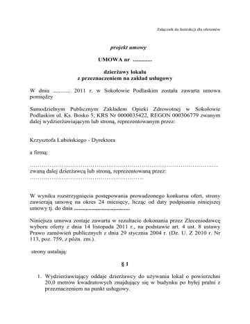 Załącznik do Instrukcji dla oferentów projekt umowy UMOWA nr ............. dzierżawy lokalu z przeznaczeniem na zakład usługowy W dniu ............ 2011 r. w Sokołowie Podlaskim została zawarta umowa pomiędzy Samodzielnym Publicznym Zakładem Opieki Zdrowotnej w Sokołowie Podlaskim ul. Ks. Bosko 5, KRS Nr 0000035422, REGON 000306779 zwanym dalej wydzierżawiającym lub stroną, reprezentowanym przez: Krzysztofa Lubińskiego - Dyrektora a firmą: …………………………………………………………………………………… zwaną dalej dzierżawcą lub stroną, reprezentowaną przez: …………………………………………………. W wyniku rozstrzygnięcia postępowania prowadzonego konkursu ofert, strony zawierają umowę na okres 24 miesięcy, licząc od daty podpisania niniejszej umowy tj. do dnia ...................................... Niniejsza umowa zostaje zawarta w rezultacie dokonania przez Zleceniodawcę wyboru oferty z dnia 14 listopada 2011 r., na podstawie art. 4 ust. 8 ustawy Prawo zamówień publicznych z dnia 29 stycznia 2004 r. (Dz. U. Z 2010 r. Nr 113, poz. 759, z późn. zm.). strony ustalają: §1 1. Wydzierżawiający oddaje dzierżawcy do używania lokal o powierzchni 20,0 metrów kwadratowych znajdujący się w budynku po byłej pralni z przeznaczeniem na punkt usługowy. 2. Dzierżawca ma obowiązek utrzymania odpowiedniego standardu higieniczno-sanitarnego lokalu, dokonywania napraw niezbędnych do zachowania lokalu w stanie niepogorszonym. 3. Dzierżawca zobowiązuje się zachowywać przedmiot dzierżawy w należytym stanie i używać go z należytą starannością. 4. Po zakończeniu dzierżawy dzierżawca zwróci wydzierżawiającemu przedmiot dzierżawy w stanie niepogorszonym z uwzględnieniem normalnego technicznego zużycia. 5. Dzierżawca zapewnia otwarcie lokalu w dni robocze przez co najmniej 8 godzin dziennie. 6. Wydzierżawiający umożliwia dzierżawcy korzystanie ze wszystkich mediów energetycznych, tj. ciepłej i zimnej wody, energii elektrycznej i centralnego ogrzewania. 7. Dzierżawca uiszcza opłaty za zużytą energię elektryczną wg. wskazań zainstalowanego licznika i aktualnej ceny brutto stosowanej przez Rejon Energetyczny w Sokołowie Podlaskim, opłaty za energię elektryczną należy realizować do 7 dnia każdego miesiąca. 8. Dzierżawca uiszcza opłaty za ciepłą i zimną wodę oraz ogrzewanie lokalu w formie ryczałtu w kwocie 150 zł/miesiąc + podatek VAT. Wielkość ryczałtu ulegnie zmianie w przypadku podniesienia cen za wodę, ścieki, energię cieplną przez Przedsiębiorstwo Usług Inżynieryjno-Komunalnych w Sokołowie Podlaskim. 9. Opłaty za wodę i ogrzewanie lokalu należy realizować do 7 dnia każdego miesiąca. 1. 2. 3. 4. §2 Ustala się wysokość czynszu na kwotę ............... netto + podatek VAT. Opłatę za czynsz należy realizować do 7 dnia każdego miesiąca z dołu na podstawie faktury wystawionej przez wydzierżawiającego. Kwota czynszu będzie waloryzowana o wysokość wskaźnika inflacji za miniony rok. Waloryzacja będzie dokonywana od dnia 1 lutego każdego roku. §3 Dzierżawca lokalu zapewni wykonywanie usług fryzjerskich, w tym także dla pacjentów szpitala przebywających na oddziałach. 1. 2. 3. 4. 1. 2. 3. 4. §4 Nie dotrzymanie terminów płatności spowoduje naliczenie ustawowych odsetek. Wydzierżawiający może odstąpić od umowy w następujących przypadkach: a) gdy dzierżawca zalega z opłatami za 2 miesiące, b) gdy stwierdzi nie zachowanie odpowiednich warunków sanitarnohigienicznych, c) gdy dzierżawca zmieni zakres swoich usług. d) gdy dzierżawca nie przestrzega innych istotnych warunków umowy. W przypadku rozwiązania umowy z winy dzierżawcy, zapłaci on wydzierżawiającemu karę umowną w kwocie 3.000 zł. Każda ze stron może odstąpić od umowy za obopólną zgodą i 3miesięcznym okresem wypowiedzenia. §5 Każda zmiana warunków umowy wymaga formy pisemnej. W sprawach nieuregulowanych postanowieniami niniejszej umowy mają zastosowanie przepisy Kodeksu Cywilnego. Załącznikiem do niniejszej umowy jest protokół przekazania lokalu. Umowę niniejszą sporządzono w dwóch jednobrzmiących egzemplarzach po jednym dla każdej ze stron. WYDZIERŻAWIAJĄCY DZIERŻAWCA