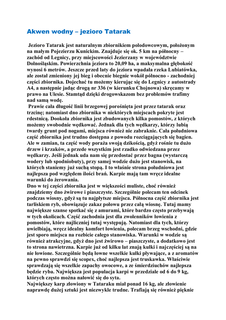Akwen wodny – jezioro Tatarak Jezioro Tatarak jest naturalnym zbiornikiem polodowcowym, położonym na małym Pojezierzu Kunickim. Znajduje się ok. 5 km na północny – zachód od Legnicy, przy miejscowości Jezierzany w województwie Dolnośląskim. Powierzchnia jeziora to 20,09 ha, a maksymalna głębokość wynosi 6 metrów. Jeszcze przed laty do jeziora wpadała rzeka Lubiatówka, ale został zmieniony jej bieg i obecnie biegnie wokół północno - zachodniej części zbiornika. Dojechać tu możemy kierując się do Legnicy z autostrady A4, a następnie jadąc drogą nr 336 (w kierunku Chojnowa) skręcamy w prawo na Ulesie. Stamtąd dzięki drogowskazom bez problemów trafimy nad samą wodę. Prawie cała długość linii brzegowej porośnięta jest przez tatarak oraz trzcinę; natomiast dno zbiornika w niektórych miejscach pokryte jest rdestnicą. Dookoła zbiornika jest zbudowanych kilka pomostów, z których możemy swobodnie wędkować. Jednak dla tych wędkarzy, którzy lubią twardy grunt pod nogami, miejsca również nie zabraknie. Cała południowa część zbiornika jest trudno dostępna z powodu rozciągających się bagien. Ale w zamian, ta część wody poraża swoją dzikością, gdyż rośnie tu dużo drzew i krzaków, a przede wszystkim jest rzadko odwiedzana przez wędkarzy. Jeśli jednak uda nam się przedostać przez bagna (wystarczą wodery lub spodniobuty), przy samej wodzie dużo jest stanowisk, na których staniemy już suchą stopą. I to właśnie strona południowa jest najlepsza pod względem ilości brań. Karpie mają tam wręcz idealne warunki do żerowania. Dno w tej części zbiornika jest w większości muliste, choć również znajdziemy dno żwirowe i piaszczyste. Szczególnie polecam ten odcinek podczas wiosny, gdyż są tu najpłytsze miejsca. Północna część zbiornika jest tarliskiem ryb, obowiązuje zakaz połowu przez całą wiosnę. Tutaj mamy największe szanse spotkać się z amurami, które bardzo często przebywają w tych okolicach. Część zachodnia jest dla zwolenników łowienia z pomostów, które najliczniej tutaj występują. Natomiast dla tych, którzy uwielbiają, wręcz idealny komfort łowienia, polecam brzeg wschodni, gdzie jest sporo miejsca na rozbicie całego stanowiska. Warunki w wodzie są również atrakcyjne, gdyż dno jest żwirowo – piaszczyste, a dodatkowo jest to strona nawietrzna. Karpie już od kilku lat znają kulki i najczęściej są na nie łowione. Szczególnie będą łowne wszelkie kulki pływające, a z aromatów na pewno sprawdzi się scopex, choć najlepsza jest truskawka. Właściwie sprawdzają się wszelkie zapachy owocowe, a ze śmierdziuchów najlepsza będzie ryba. Największa jest populacja karpi w przedziale od 6 do 9 kg, których często można nałowić się do syta. Największy karp złowiony w Tataraku miał ponad 16 kg, ale złowienie naprawdę dużej sztuki jest niezwykle trudne. Trafiają się również pięknie ubarwione pełnołuskie grubasy, które najczęściej przekraczają 10 kilogramów. Amury nie osiągają tutaj tak imponujących rozmiarów jak na innych wodach, zazwyczaj będą to sztuki do 10 kg . Godziny brań są uzależnione od panującej pory roku. Wiosną i jesienią brania następują w porach południowych od godziny 11 do 15. Natomiast latem będzie to noc oraz wczesne godziny poranne. Nad jeziorem Tatarak dozwolone jest używanie środków pływających, co pozwoli na szybkie odnalezienie dobrego łowiska oraz wywiezienie zestawów czy zanęty. Dodatkową zaletą jest znajdujący się ok. 300 metrów od Tataraku o wiele mniejszy zbiornik, w którym również możemy próbować swych sił. Nad jezioro Tatarak warto przyjechać jeśli lubimy dzikość przyrody i nie straszne nam komary czy bagna. Podstawowe dane: Akwen: Tatarak GPS: N 51° 14' 10'' E 16° 06' 22'' Położenie: Województwo Dolnośląskie Powiat Legnicki Gmina Miłkowice Właściciel: Woda PZW Okręg PZW Legnica – pod opieką Koło PZW „KOLEJARZ” w Legnicy Dominujące ryby: Amur, Karaś, Karp, Lin. Trafiają się piękne okazy Tołpygi i Suma. Link do strony z mapą: MAPA